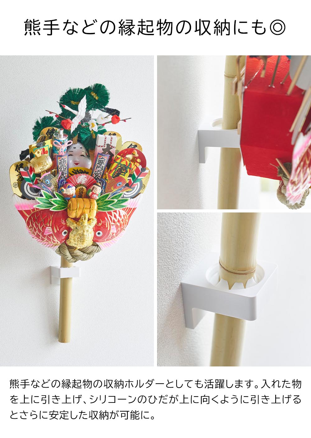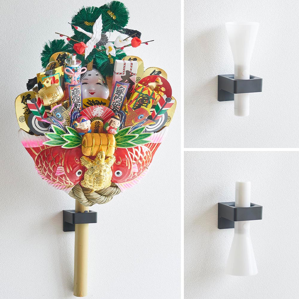 ペンライト以外にも、熊手などの縁起物を飾ったり、懐中電灯の壁面収納にも使用できます。