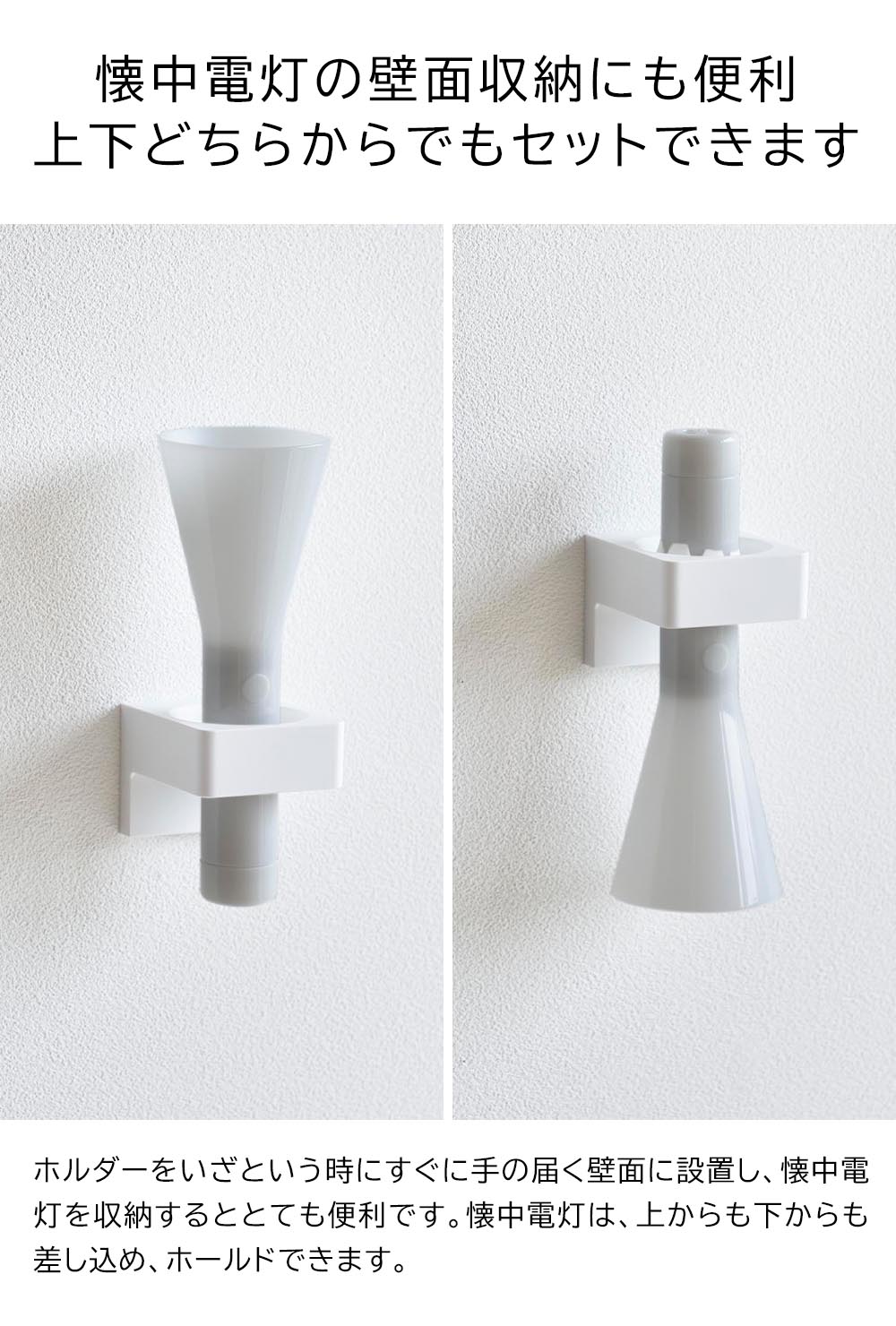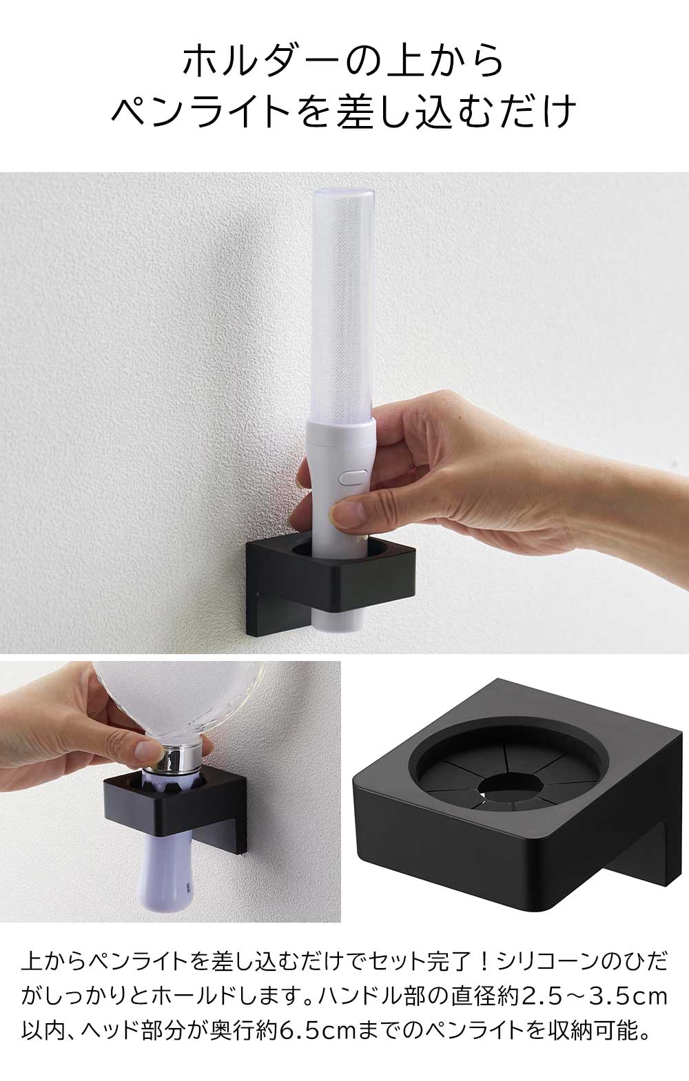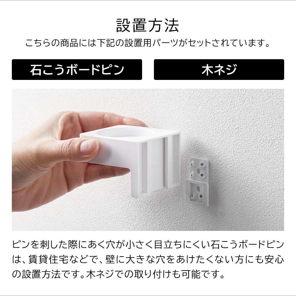 付属の石こうボードピンで壁面に取り付けられる、ペンライトを飾りながら収納できるホルダーです。木ネジでの取り付けも可能です。