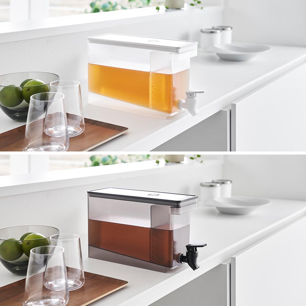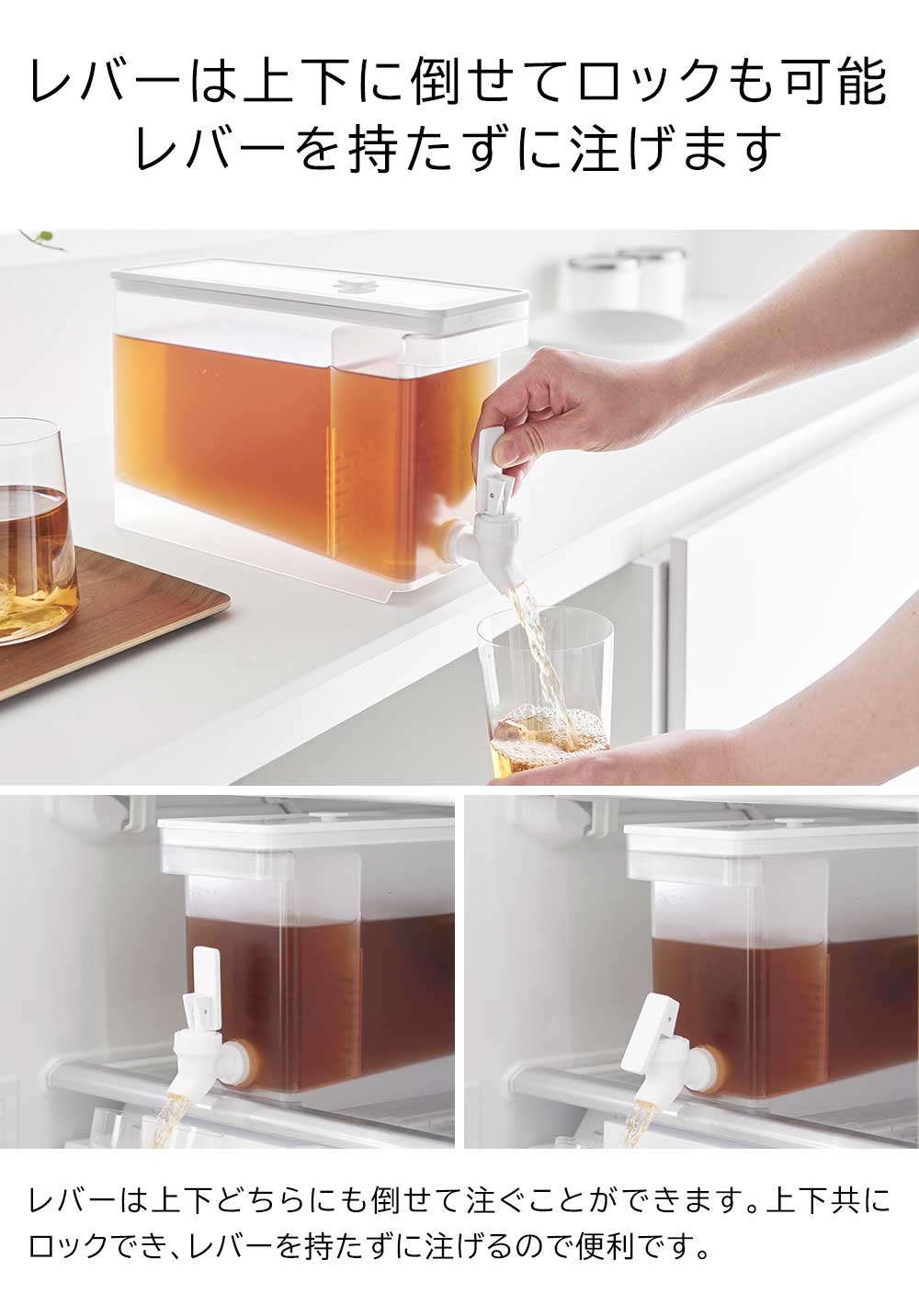 冷蔵庫に入れたままでOK! 冷たいお茶が飲みたくなった時、冷蔵庫の中から冷水筒をわざわざ取り出さなくても、レバーを上下に倒せばすぐにその場でグラスに注げる、お手軽でコンパクトなドリンクサーバーです。 冷蔵庫の奥行きを活かしたスリムで収まりの良いデザインで場所を取りません。 2.8Lの大容量サイズだからパーティなどでも大活躍!お茶以外にも、フレーバーウォーターなどを作って楽しめます。キッチンカウンターに設置すれば、好きな時に注いで飲むことができます。 中には仕切りが付いており、ティーパックやフレーバーウォーターの具材が注ぎ口を塞ぐことなく注げます。容器の底は傾斜しており、残量が少なくなっても安定して注げます。レバーは上下共にロックでき、レバーを持たずに注げるのも嬉しいポイントです。 パーツは全て分解でき、細かい部分まで洗えるので衛生的です。 ![]() ![]() ![]() ![]() ![]() ![]() ![]() ![]() ![]() ![]() ![]() ![]() ![]() ![]() ![]() |