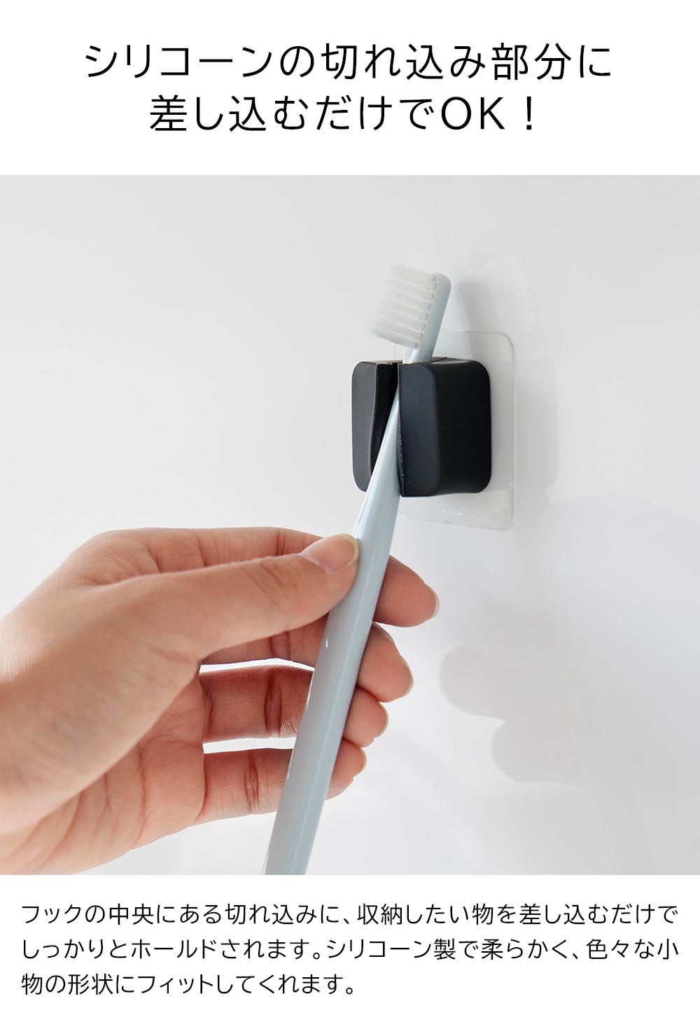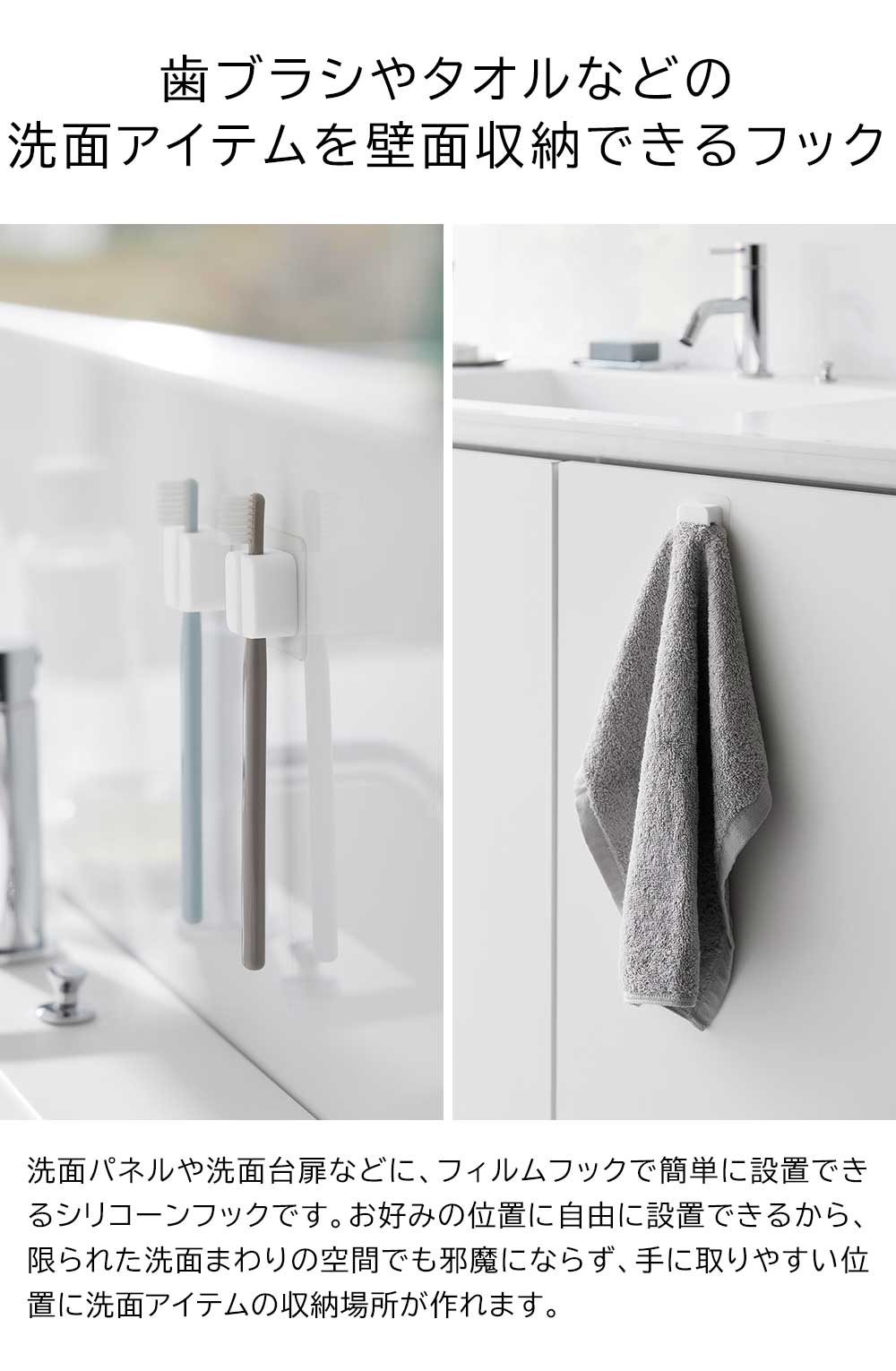 フィルムフックで簡単設置 フィルムフックで洗面台パネルなどの光沢のある壁面に設置して、洗面アイテムを浮かせて収納できるフックです。フック中央のシリコーンの切り込みに、歯ブラシ・カミソリ・ヘアゴム・タオルなどを差し込むだけでホールドされ、壁面収納が可能になります。シリコーン製で柔らかく、収納する色々な物の形状にフィット。また、収納する物に合わせて、差し込みの向きを縦・横と選べます。フックは2個組なので、歯ブラシやタオルを種類ごとや人ごとに使い分けて収納できます。2個合わせて使えば、レジ袋を差し込んで簡易ゴミ袋としてもお使いいただけます。家電に直接設置して電源コードを収納しても◎ お好みの位置に自由に設置できるから、洗面まわりの限られた空間の中でも邪魔にならず、手に取りやすい位置に洗面アイテムの収納場所を作れます。 ![]() ![]() ![]() ![]() ![]() ![]() ![]() ![]() ![]() ![]() ![]() ![]() ![]() ![]() |