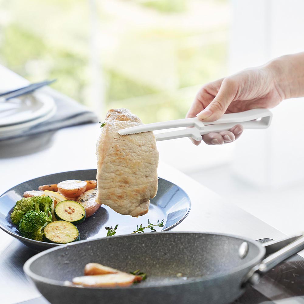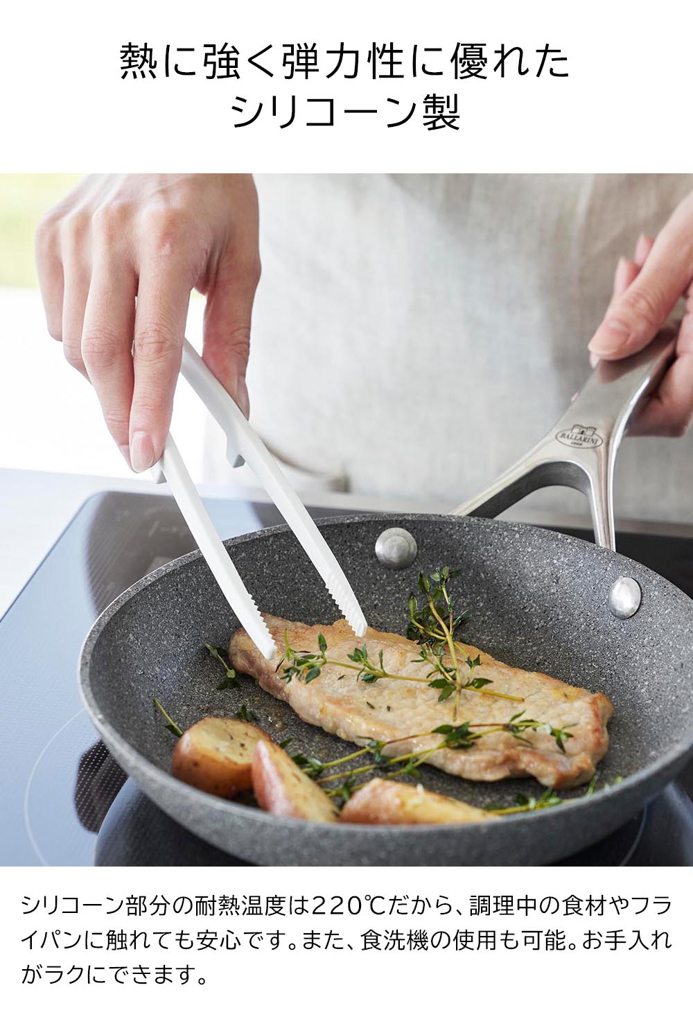 持ち手に熱が伝わりにくく、お鍋やフライパンをキズつけないシリコーン製の菜箸トングです。 グリップは握りやすい太めの設計。繊細に食材がつかめるから、お弁当作りにも最適です。 調理中にそのまま調理台に置いても、先端が浮くので衛生的に使え、調理台も汚れません。 手軽で使いやすい小さめサイズ。食洗機でお手入れ可能です。