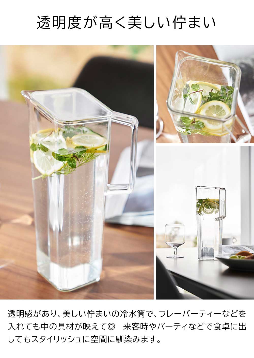 透明度が高く美しい佇まい 冷たい飲み物をコンパクトに冷蔵庫のドアポケットに収納できる、ハンドル付きの美しい冷水筒。 容量は1.2L。注ぎ口が角についているので、注ぎやすく、液だれしにくいデザインです。 透明度の高い美しい佇まいの冷水筒で、フレーバーティーなどを作るのも◎ 来客時やパーティなどで食卓に出してもスタイリッシュに空間に馴染みます。 食洗機対応で洗浄もラクラク! パッキンのない蓋と容器のみのシンプルな構造で、手が奥まで入り洗いやすい広口のデザインなので、お手入れ簡単で衛生的です。 ![]() ![]() ![]() ![]() ![]() ![]() ![]() ![]() ![]() ![]() ![]() ![]() ![]() ![]() ![]() |