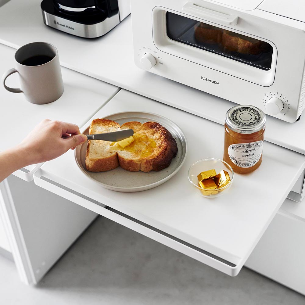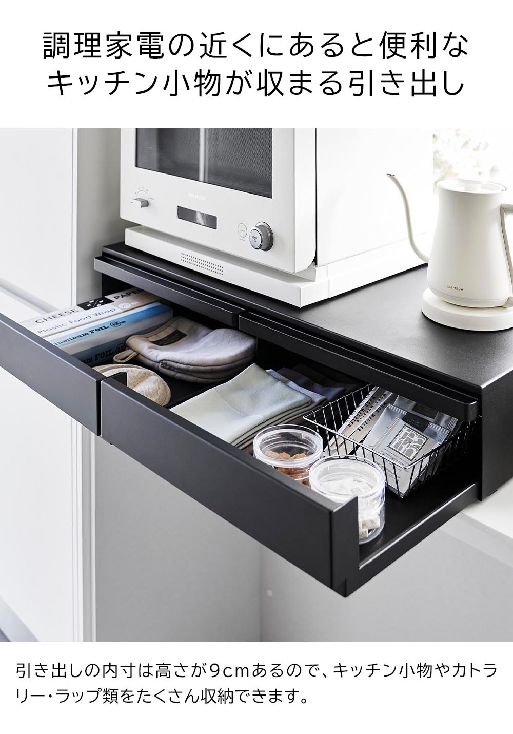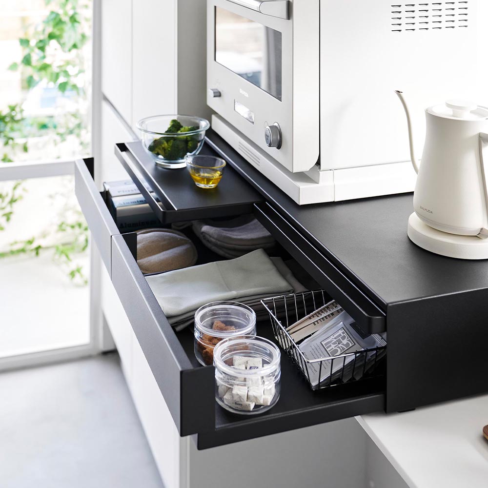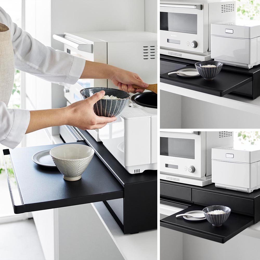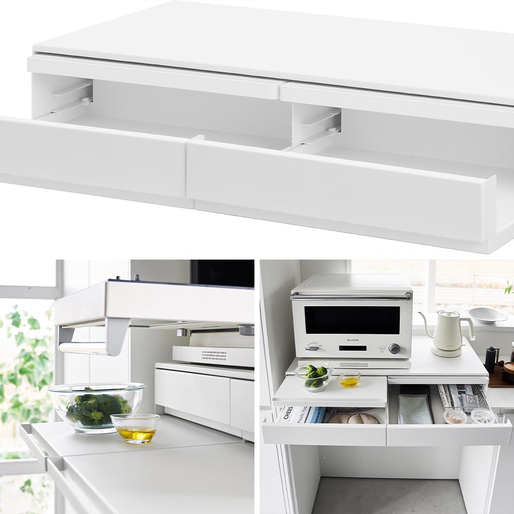 小物を収納できる引き出しと 調理家電まわりで必要なラップ類やミトンなどが収まる収納力抜群の引き出しと、必要な時にだけサッと出せるスライドテーブルの2段式ラック。 調理家電の下に設置すれば、キッチンの限られたスペースでもスマートに整理整頓ができ、カップボードがスッキリと片付きます。 引き出しとテーブルは各2つあり、上下段の入れ替えが可能なツーウェイ設計だから、置きたい家電に合わせて引き出しとスライドテーブルの上下をお選びいただけます。 また、テーブルを上手に使うことで電子レンジやトースターの扉と干渉せず、調理中の料理やお釜からよそったごはんを一時置きできて便利です。 ![]() ![]() ![]() ![]() ![]() ![]() ![]() ![]() ![]() ![]() ![]() ![]() |