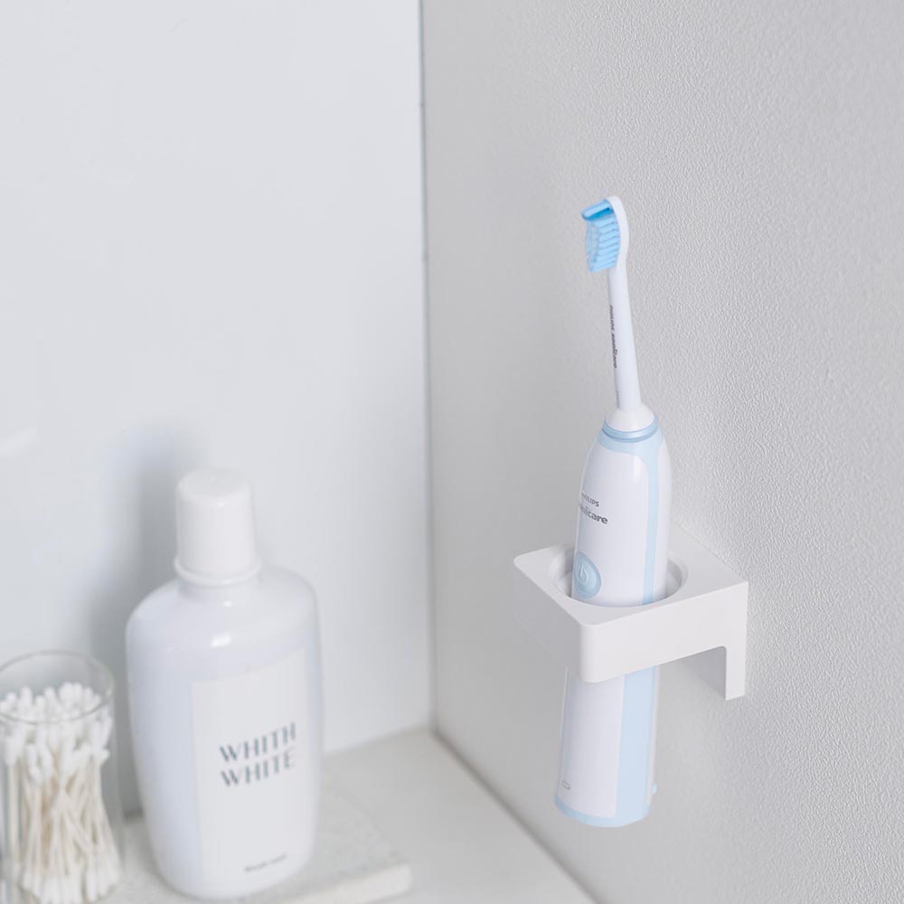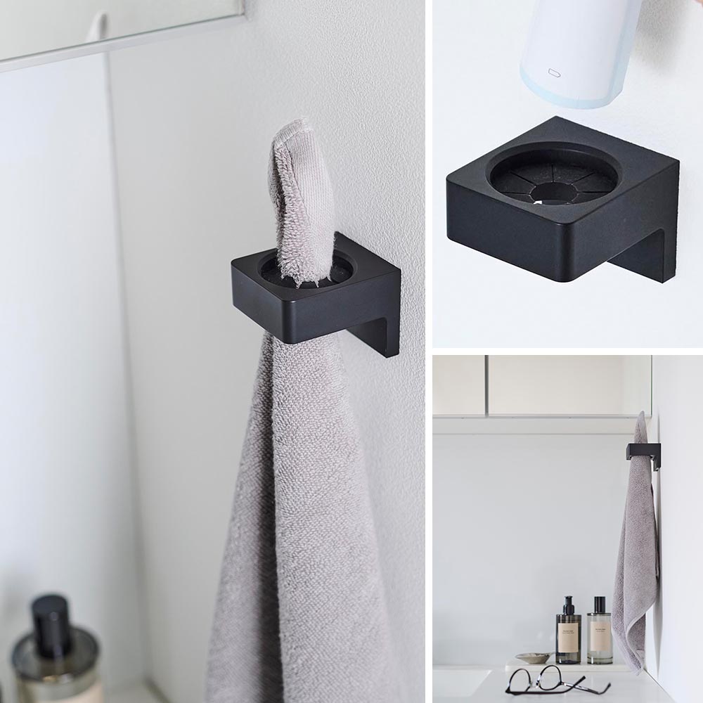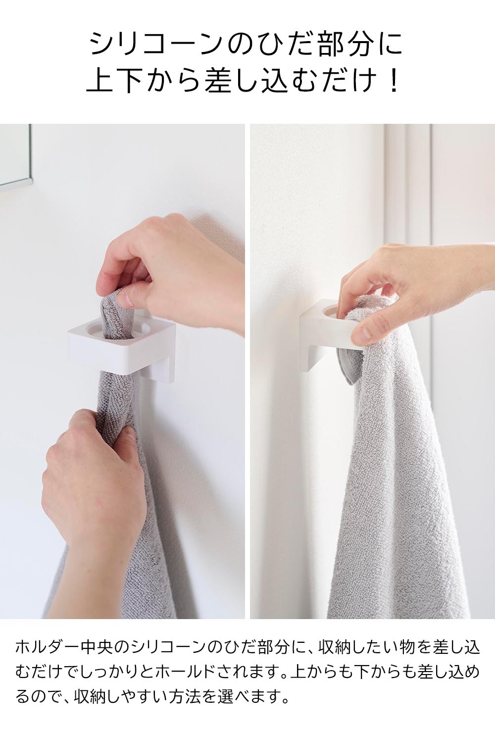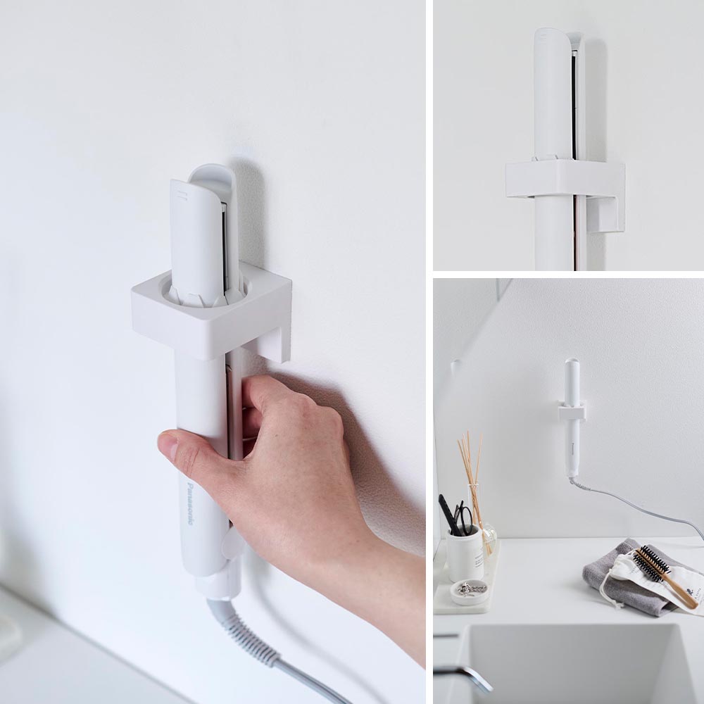 ホルダー中央のシリコーンのひだの中に、バスタオルや電動歯ブラシ、ヘアアイロンなどを差し込むだけでホールドされ、壁面収納が可能になります。