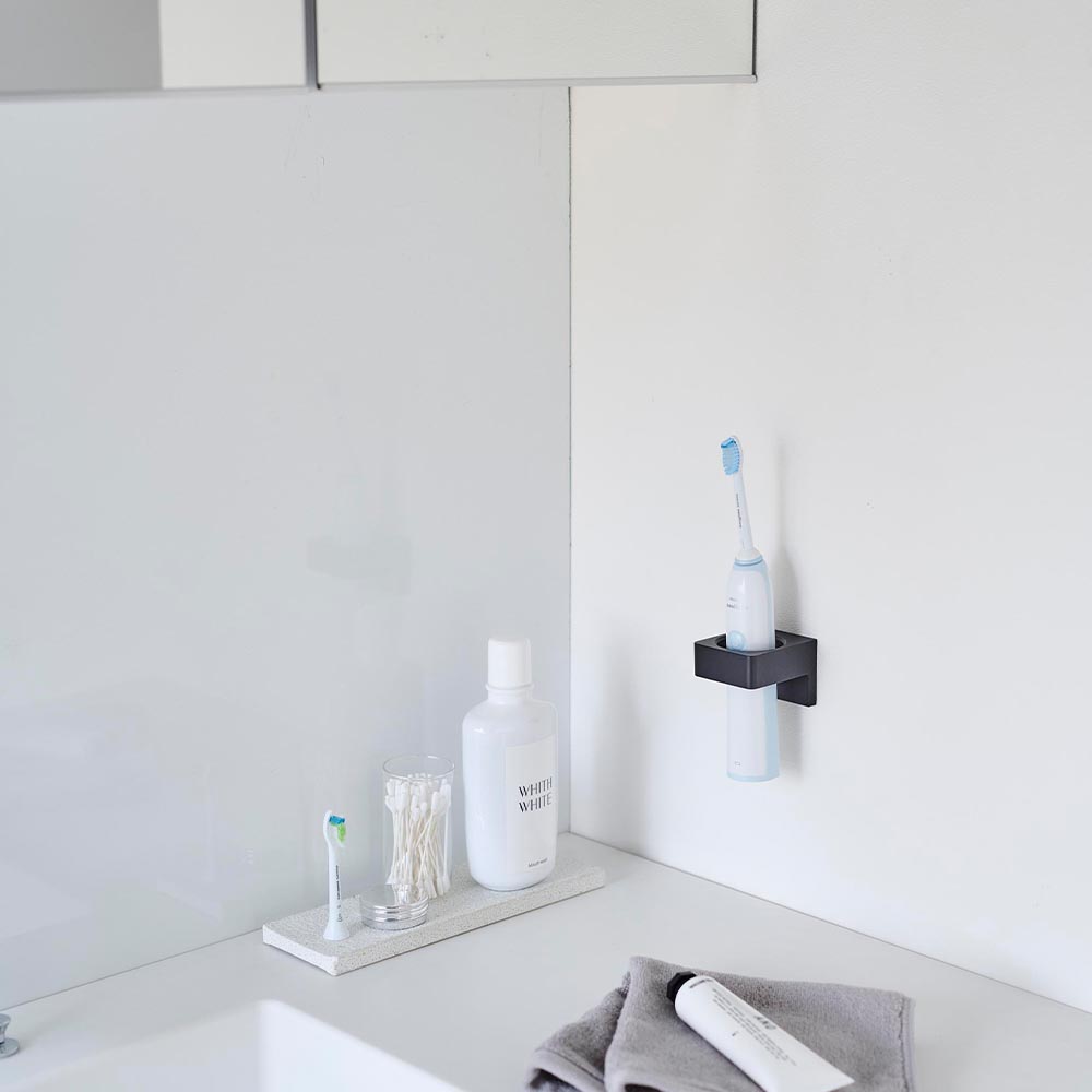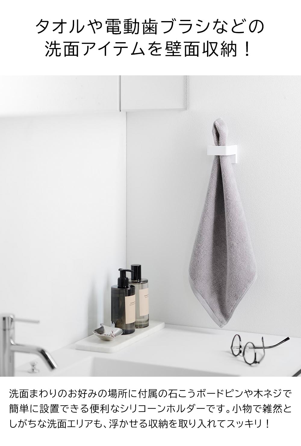付属の石こうボードピンや木ネジで洗面所の壁面に取り付ける、小物を浮かせて収納できるホルダーです。