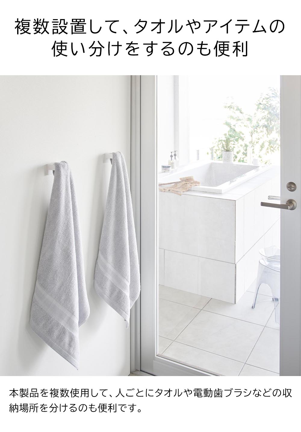 本製品を複数個設置して、タオルやバスタオルを種類ごとや人ごとに使い分けて収納するのも便利です。お好みの位置に自由に設置できるから、限られた空間の中でも邪魔にならず、便利な場所にピンポイントで収納場所を作れます。