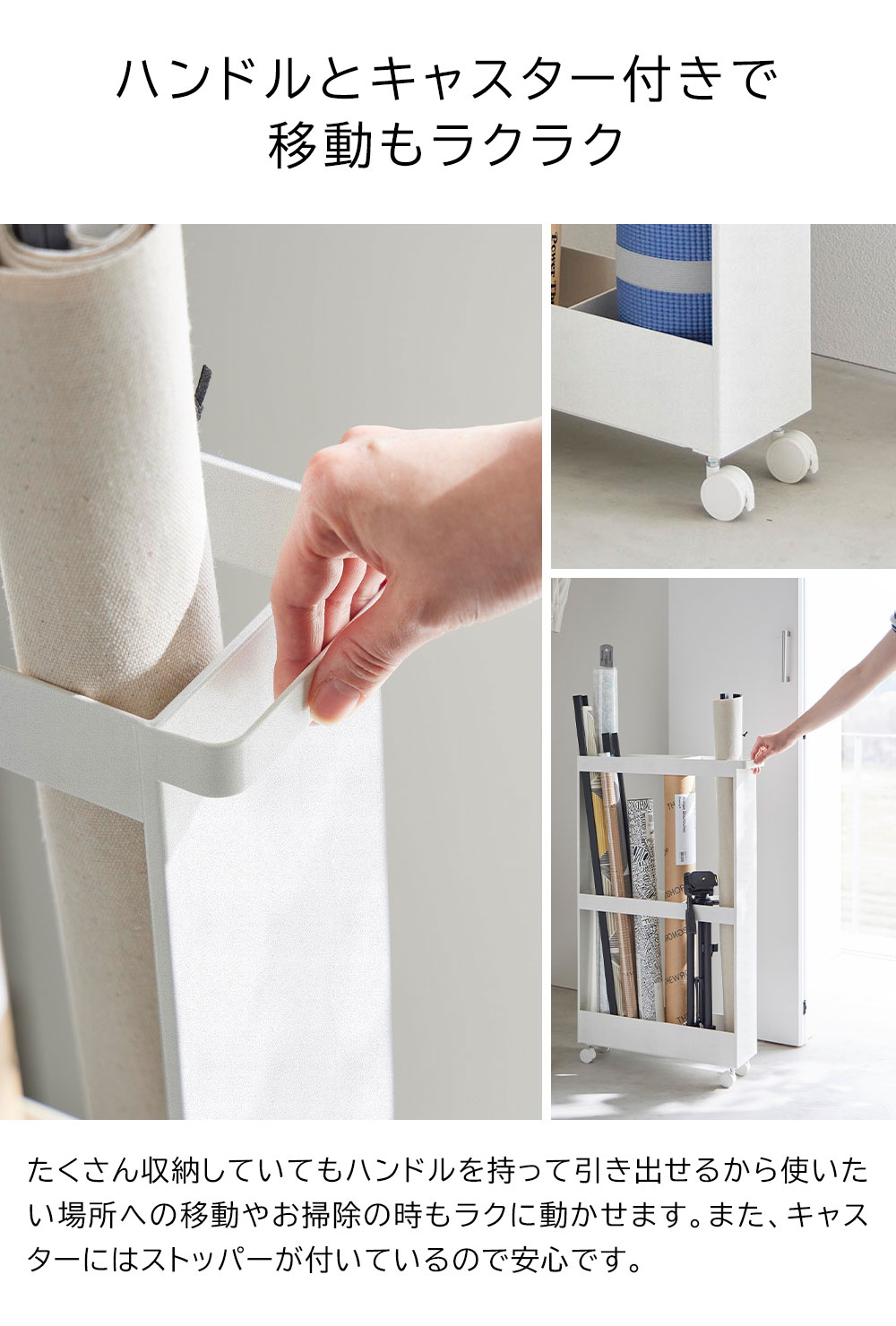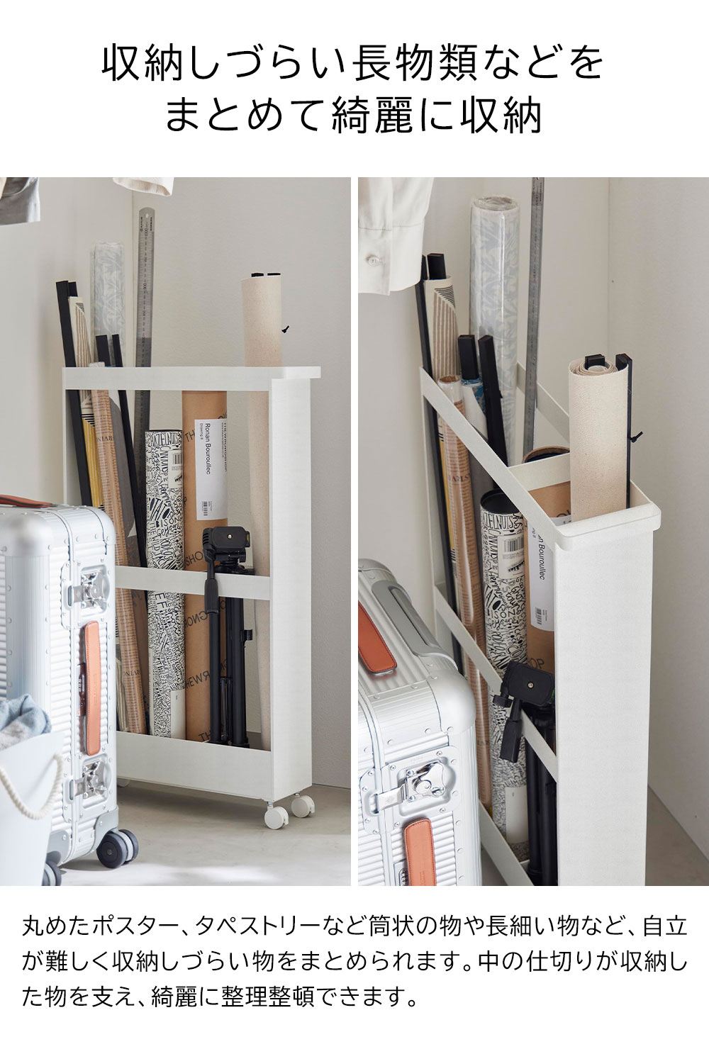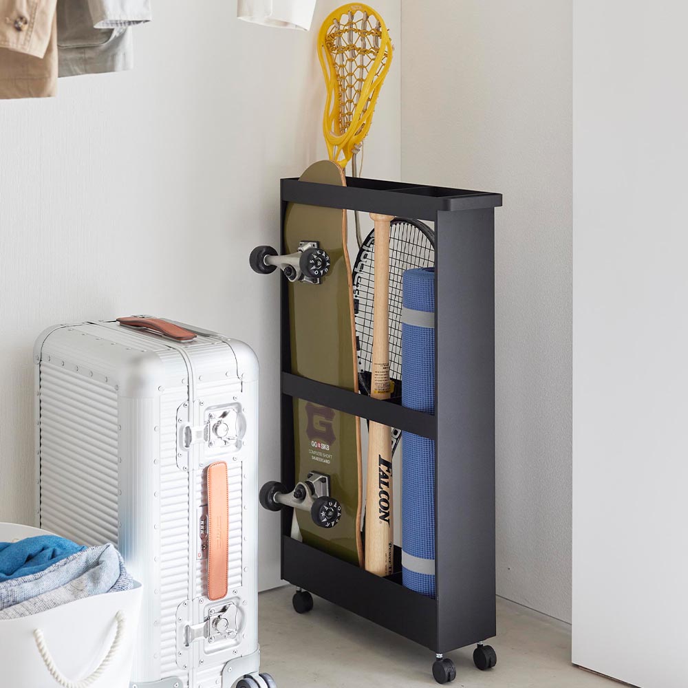 収納しづらい長物を 丸めたポスターやタペストリーなどの筒状の物、ラケットやバットなどの長さのある物といった、様々な長物を綺麗にまとめられる収納ワゴンです。 幅13cmのスリムな形状だからクローゼット内の隙間を活用して収納できます。 ハンドルとキャスターが付いているので出し入れもラクラク。よく使うお掃除道具を入れても便利に使えます。 付属のスパナでキャスターを取り付けるだけの簡単組み立てで、購入後すぐに使用できます。 ![]() ![]() ![]() ![]() ![]() ![]() ![]() ![]() ![]() ![]() ![]() ![]() |