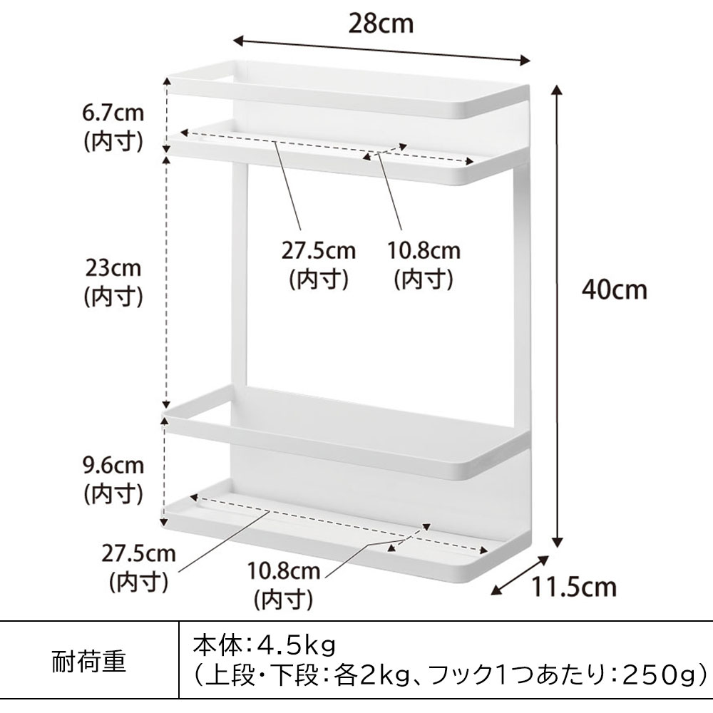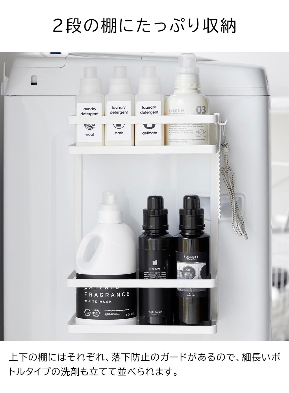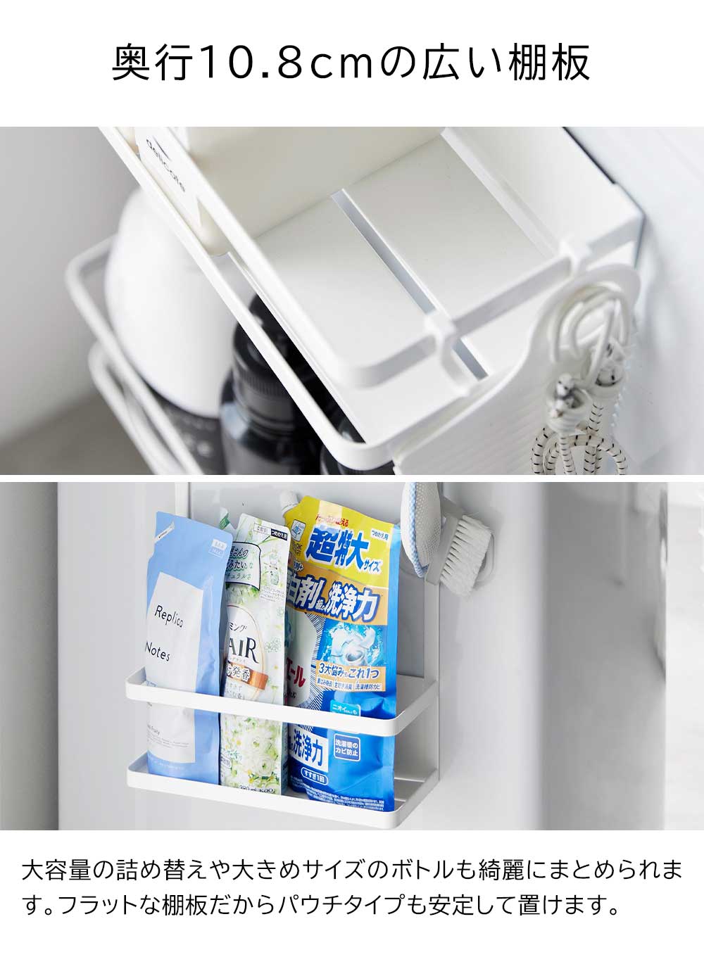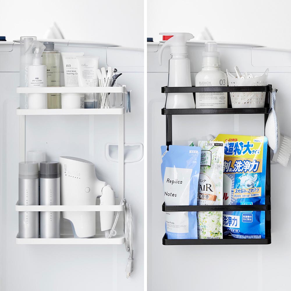 ランドリー周辺グッズを 洗濯機の側面を利用してマグネットで簡単に取り付けられるラックです。 上下段それぞれに、落下防止のガードが付いており、細長い洗剤ボトルなどを立てて並べて整頓できます。棚は奥行10.8cmとワイドな設計。大容量の詰め替えパックも収まります。 たっぷり収納できる2段式だから、洗面スペースで収納しづらいヘアドライヤーや化粧品などの収納にも便利です。 付属のフックを取り付ければ、小物の引っ掛け収納も可能。ブラシや洗濯ネット、ヘアゴムの収納に役立ちます。 ![]() ![]() ![]() ![]() ![]() ![]() ![]() ![]() ![]() ![]() ![]() ![]() ![]() ![]() |