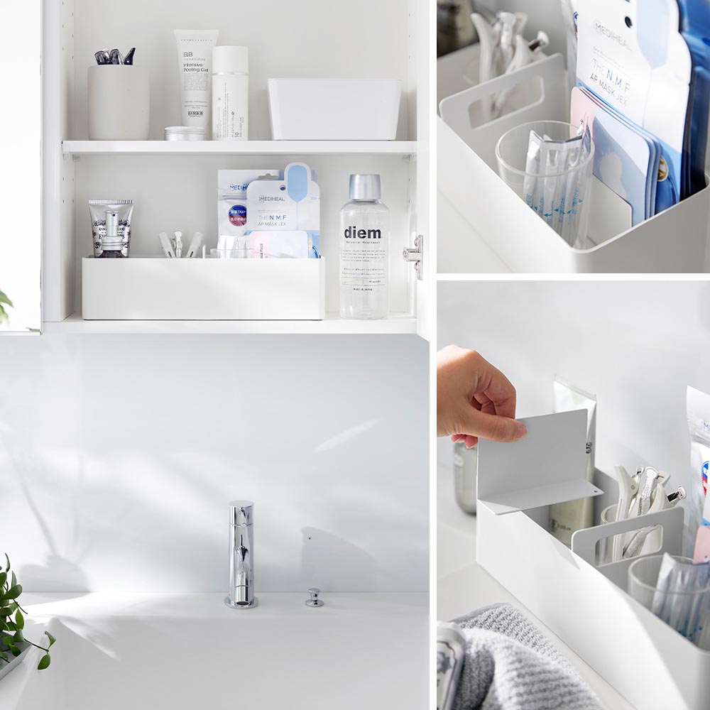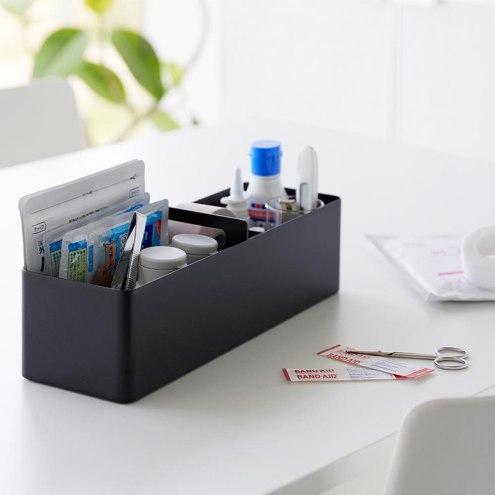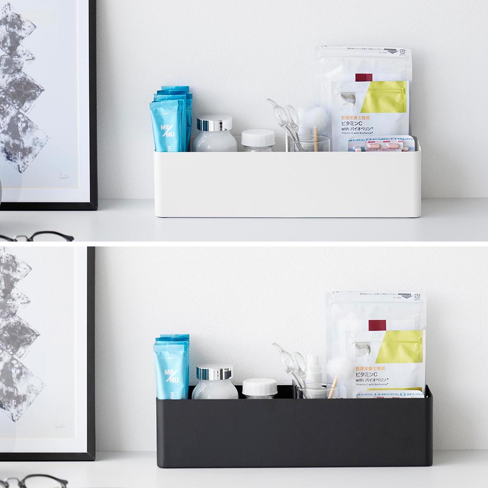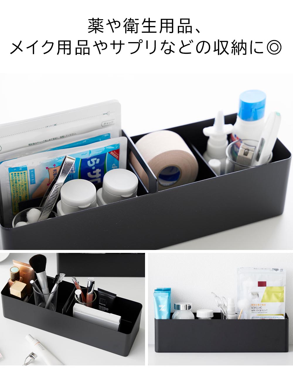 仕切りで種類ごとに細かく分類できるので、薬や衛生用品、メイク用品などの収納に便利!様々な形状のアイテムもまとめて整理整頓でき、コンパクトに収納できます。