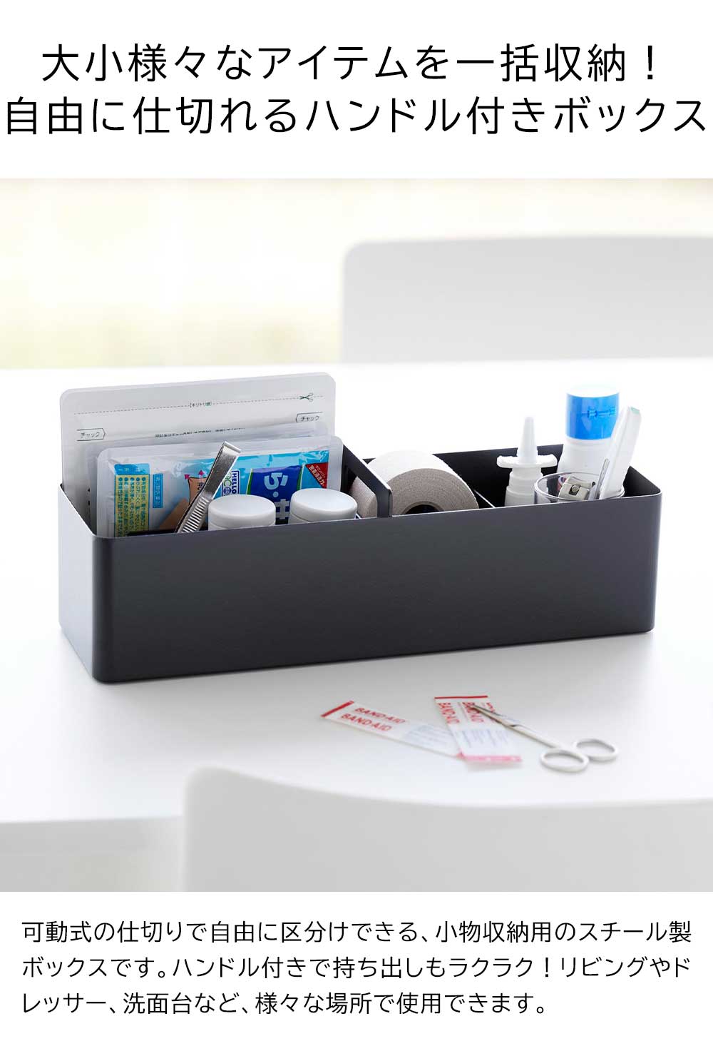 マグネット付きの可動式仕切りで自由に中を区分けできる、小物収納に便利なスチールボックスです。