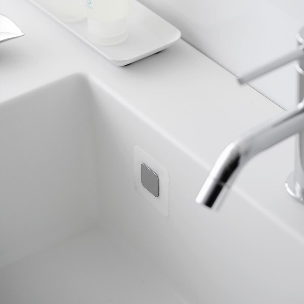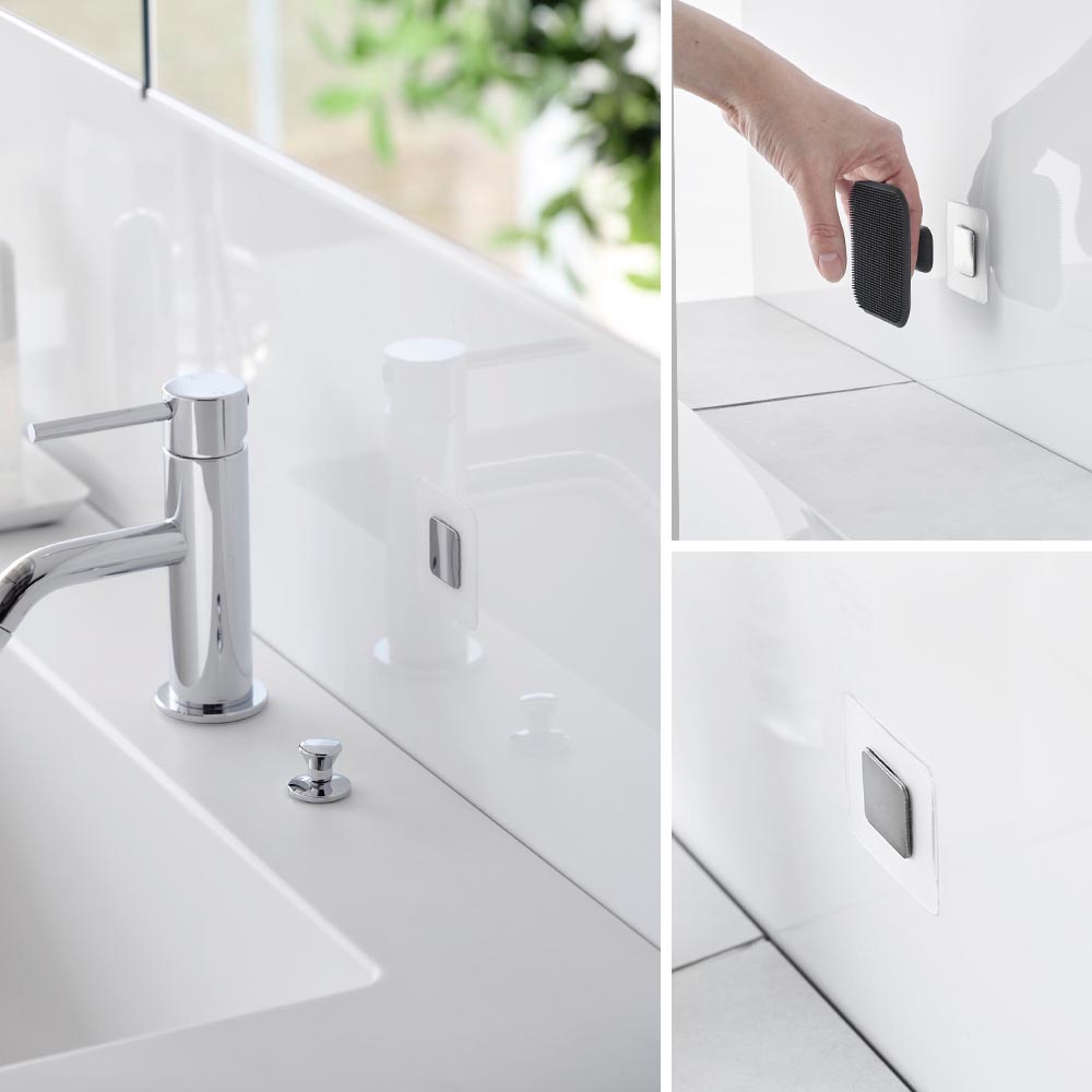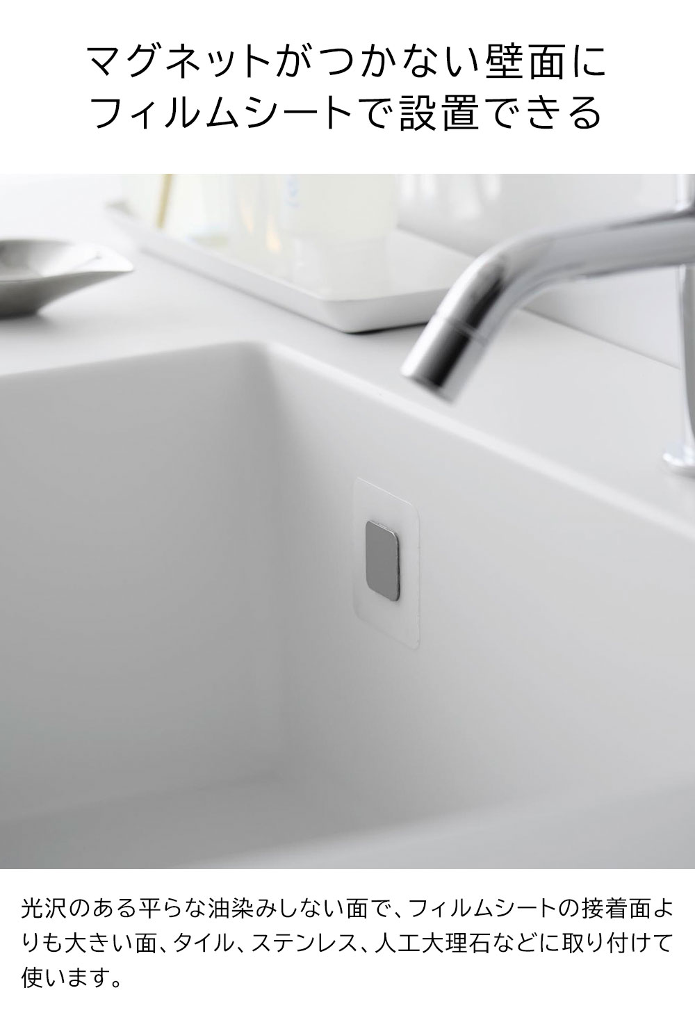 今まで諦めていた洗面台やキッチンシンクなどのマグネットがつかない壁面にも、このフィルムシートを貼っておくだけで、簡単便利にマグネット製品が設置できます。