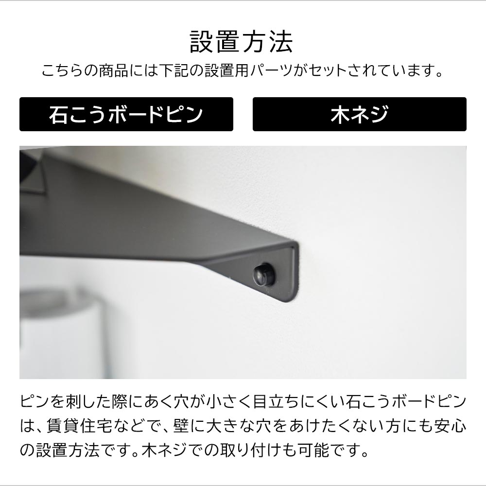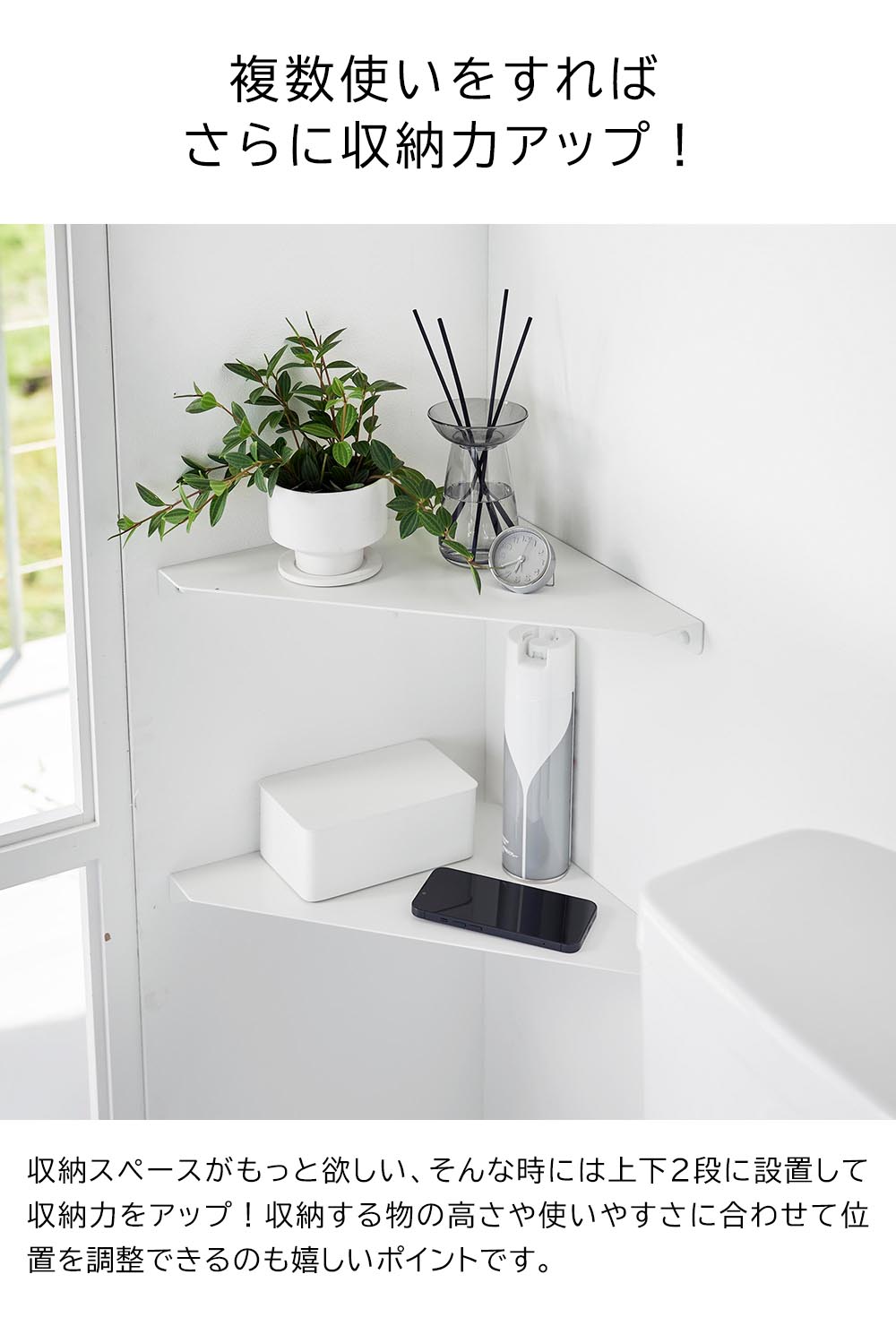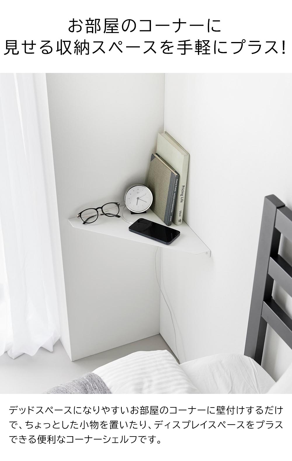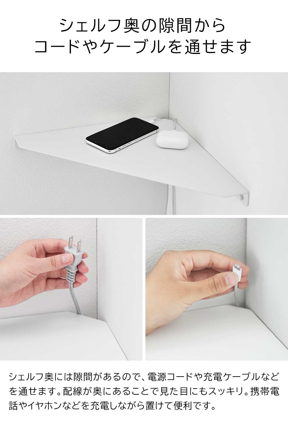 石こうボードピンで簡単設置!デッドスペースになりがちなお部屋のコーナーに収納スペースをプラスできるシェルフです。ベッドサイド・リビング・トイレ・玄関など、お家のどんな空間にもスッと溶け込むシンプルなデザイン。ちょっとした小物置きやインテリアのディスプレイにピッタリのアイテムです。シェルフの奥の隙間からコードやケーブル類を通すことができるので、携帯電話やモバイル機器などの充電場所としても◎ 用途に応じて複数使いも便利。アイデア次第で様々に活躍できるマルチなシェルフです。壁にあいた穴が目立ちにくく、賃貸でも安心してお使いいただけます。
