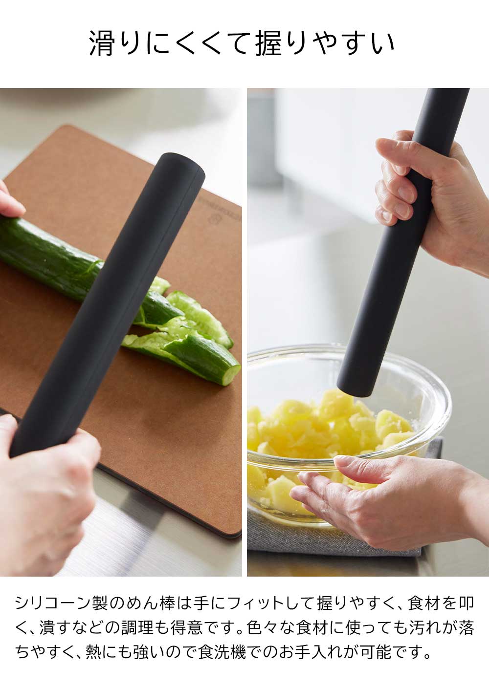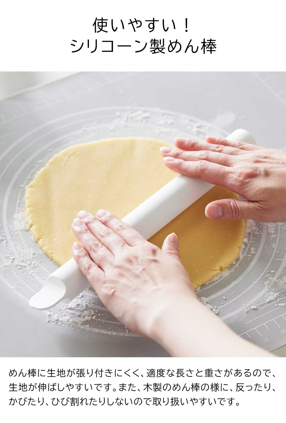 手になじむ長さと、ほどよい重さで、生地が伸ばしやすいめん棒。 反ったり、かびたり、ひび割れたりといったトラブルもなく、 初心者の方でも取り扱いやすいシリコーン製です。 先端がスケッパーになっているので、生地を伸ばした後にカットができる2way仕様。 食洗機にも対応しており、お手入れ簡単です。