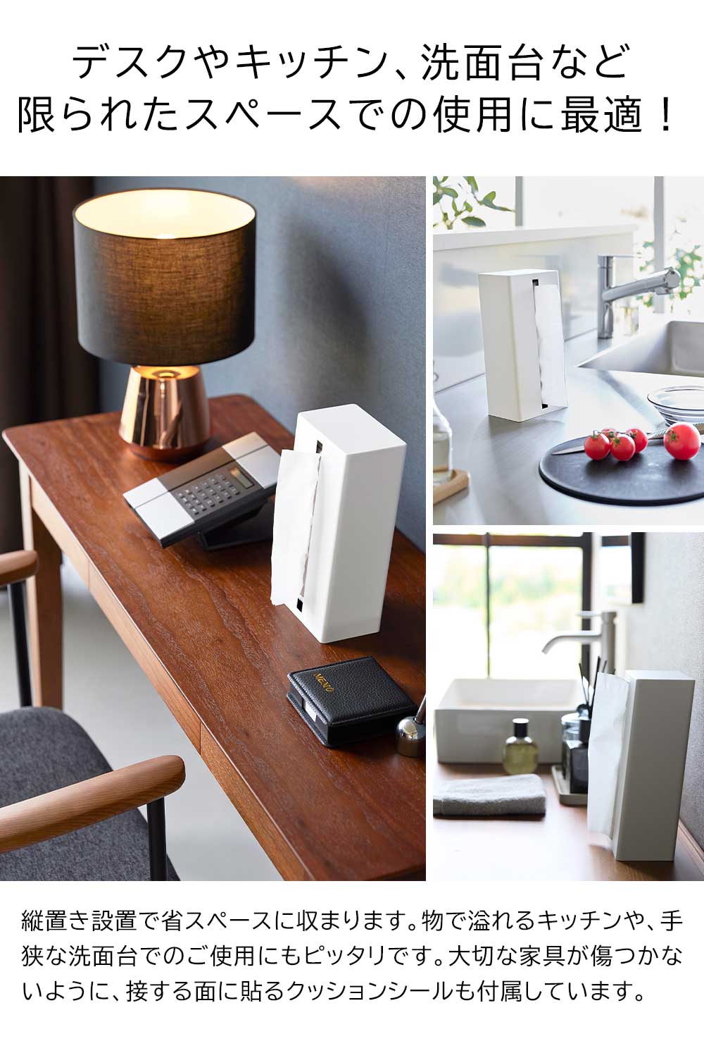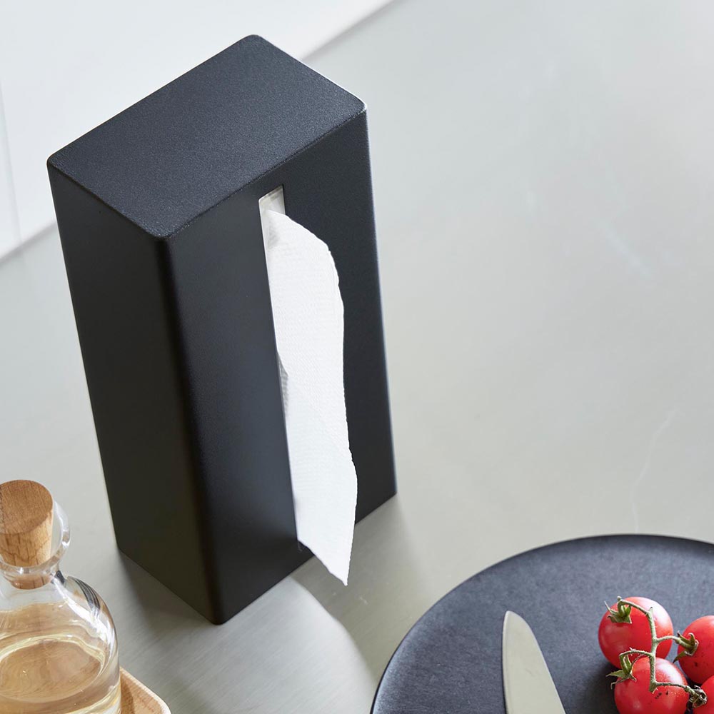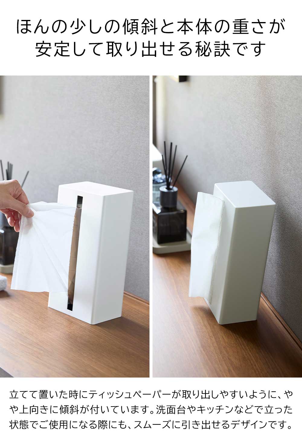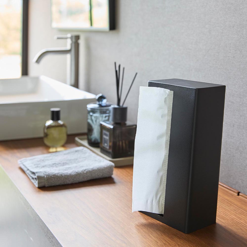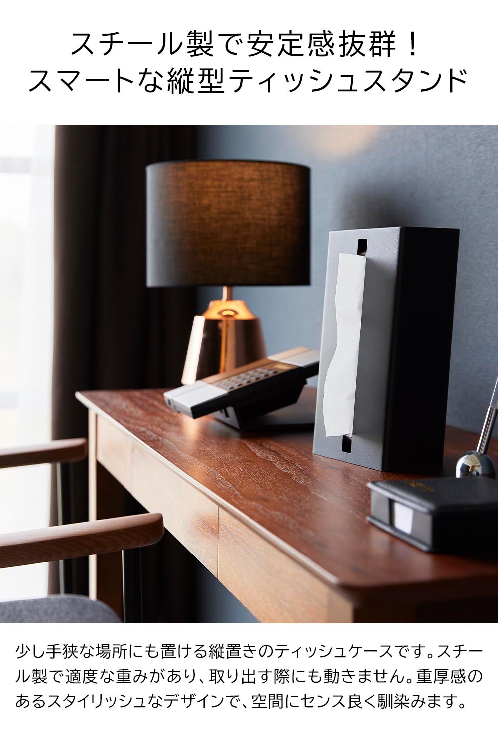 重厚感のあるスチール製の縦置き型ティッシュスタンドです。デスクやキッチン、洗面台などといった、物が多くて置くスペースが限られている場所にもスマートに設置できます。もちろん横置きでの使用もOK!
