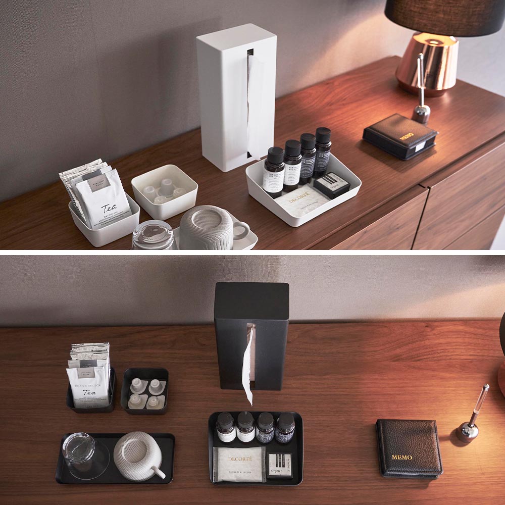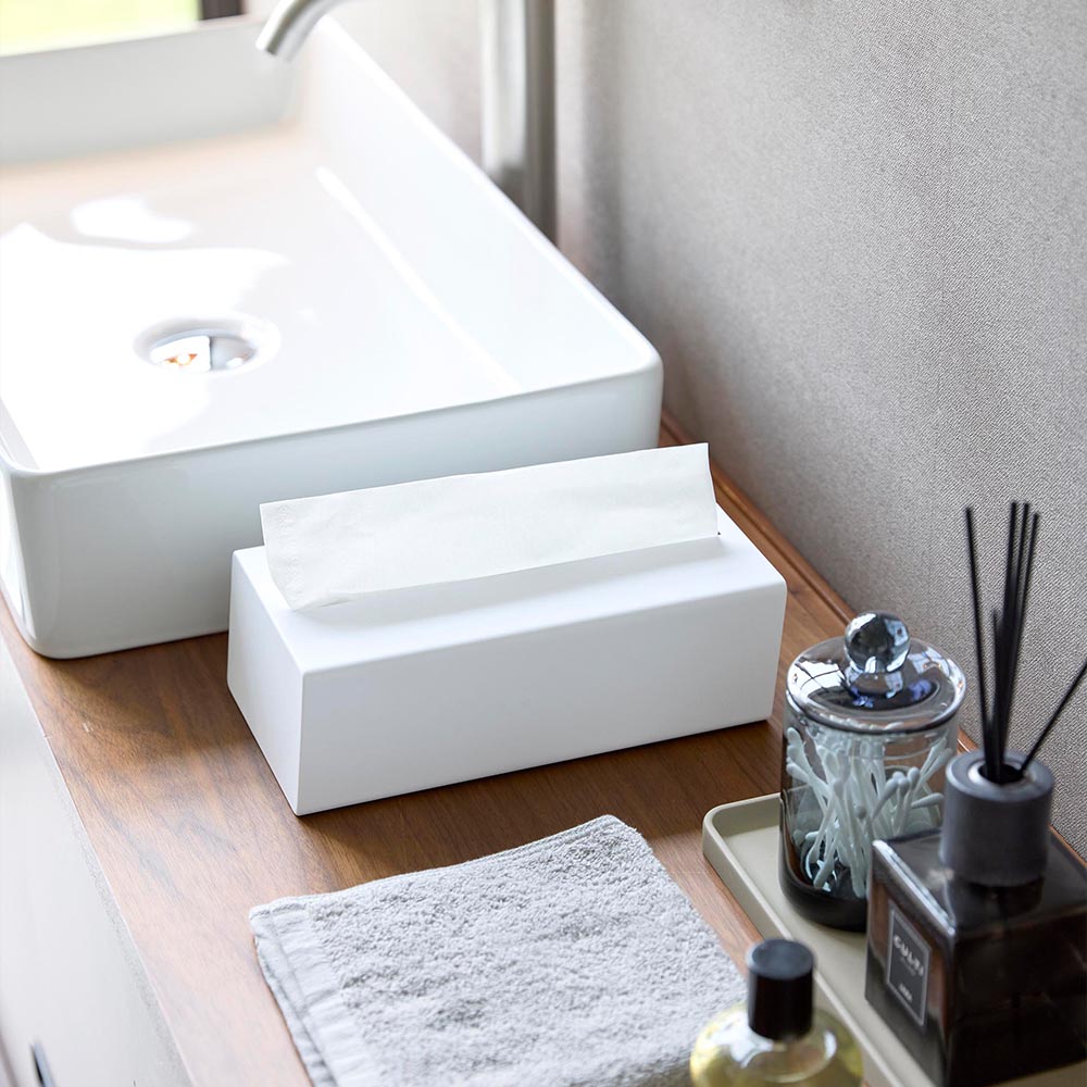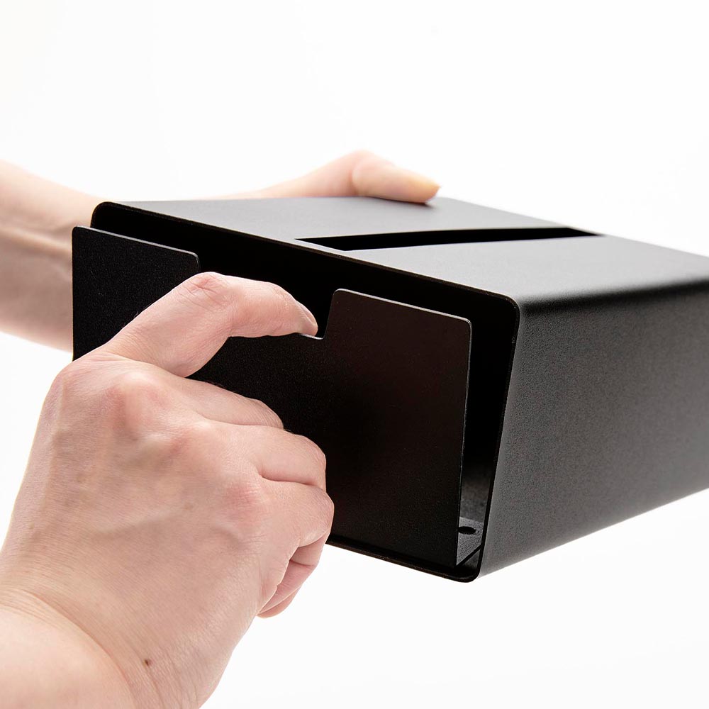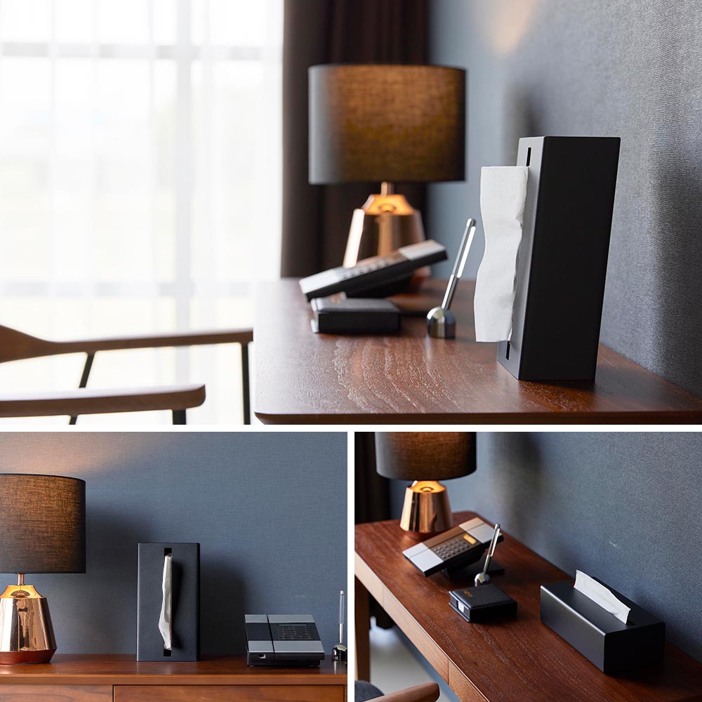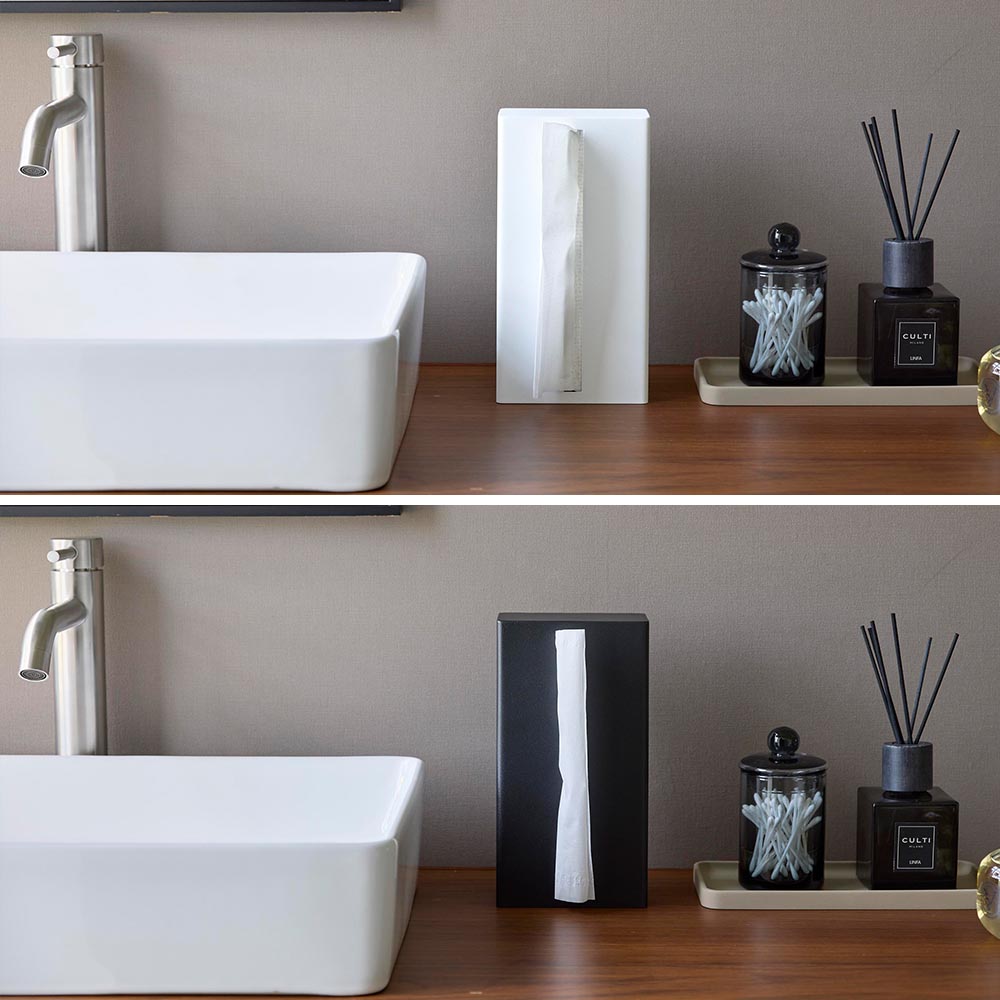 重厚感のあるスチール製の縦置き型ティッシュスタンドです。デスクやキッチン、洗面台などといった、物が多くて置くスペースが限られている場所にもスマートに設置できます。もちろん横置きでの使用もOK!