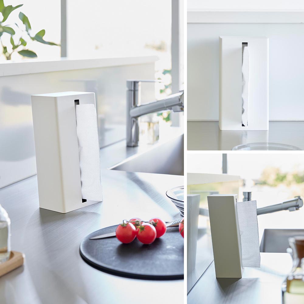 スチール製で適度に重みがある為、ペーパーを取り出す際にスタンドが一緒に動いてしまうこともありません。また、立てるとやや上向きに傾斜がつくデザインで、キッチンや洗面台などで立ったまま使う際にも引き出しやすいです。