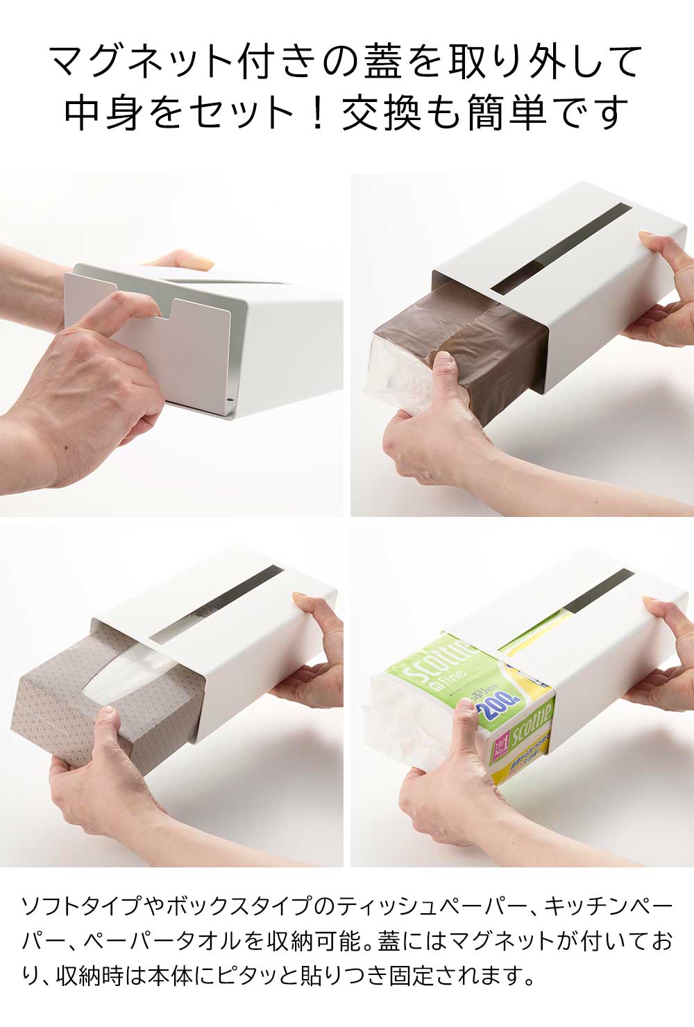 ボックスタイプやソフトタイプのティッシュペーパー、キッチンペーパー、ペーパータオルをセットして使用できます。
