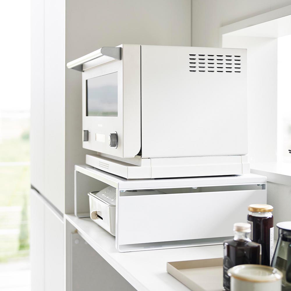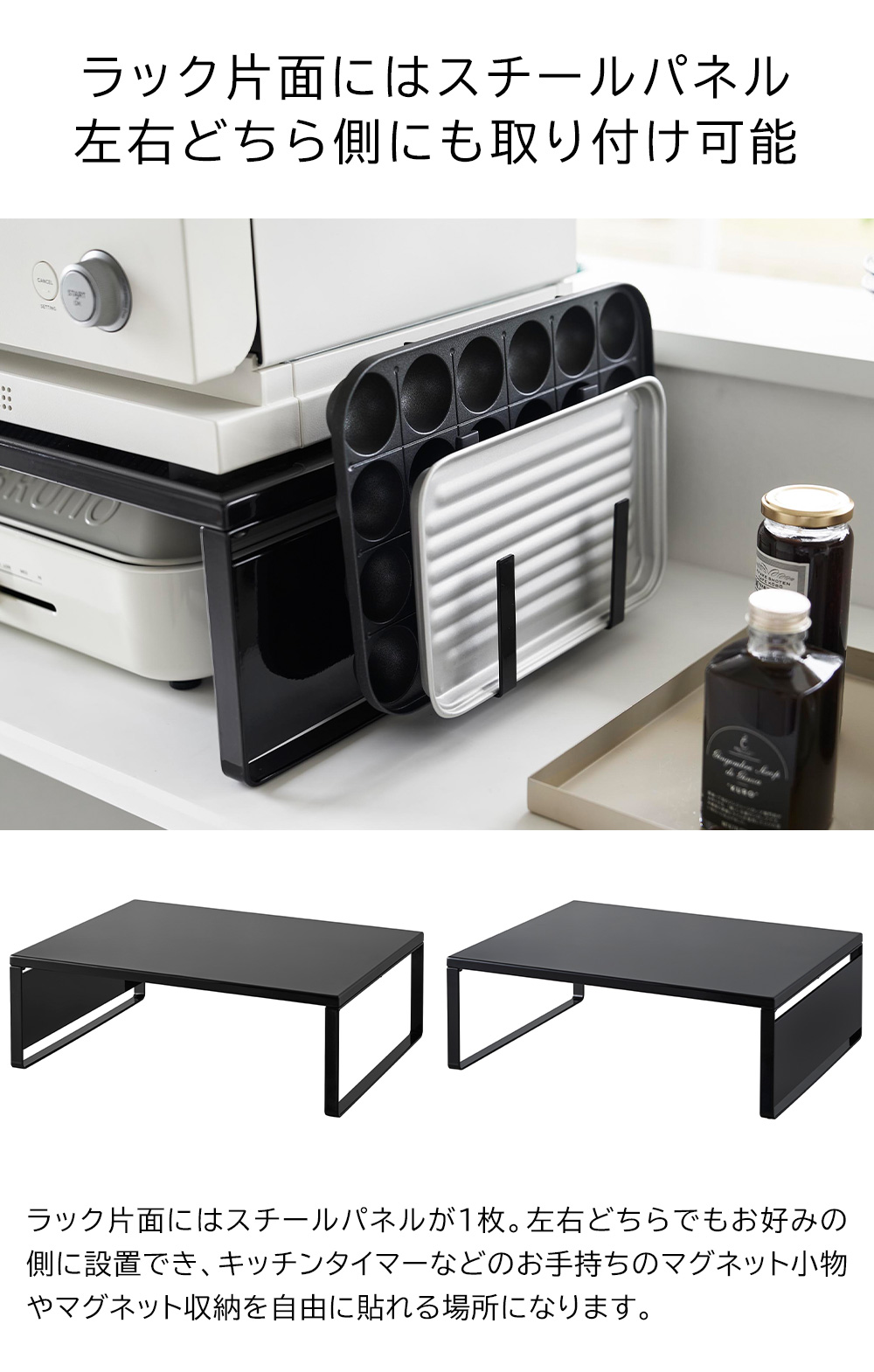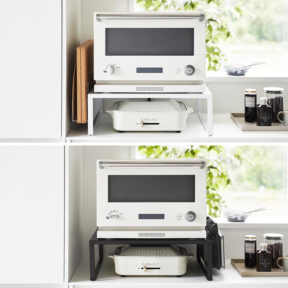 ホットプレートやカセットコンロなどの、大きくて置き場所に困るアイテムを、レンジ下に収納できるオーブンレンジラックです。レンジ上の縦のスペースを利用することで、新たな収納場所を探す必要がなくなり、また、出し入れしやすい場所にスマートに収納できます。