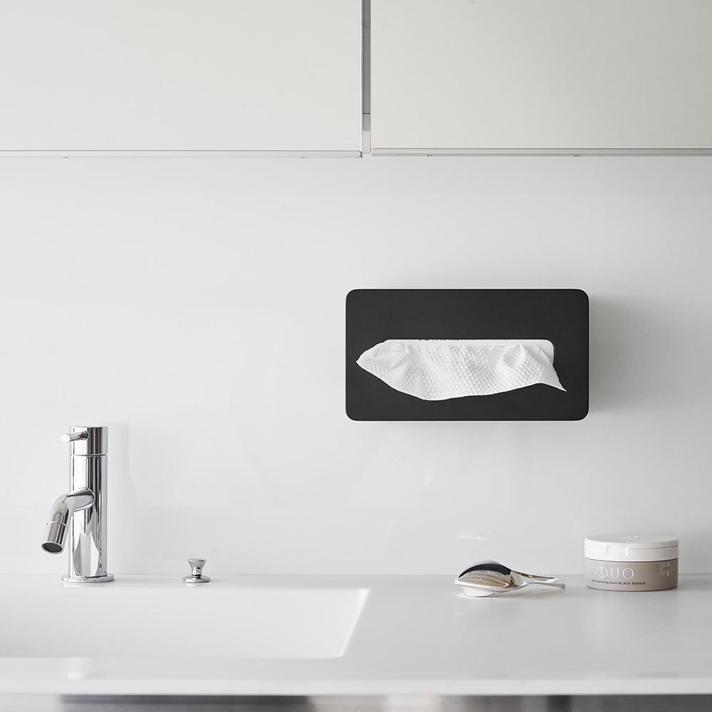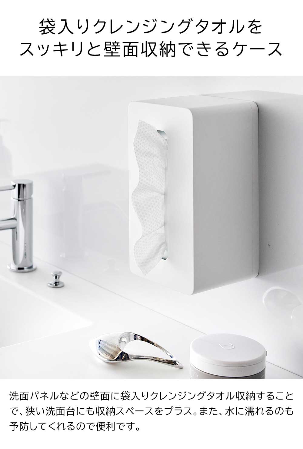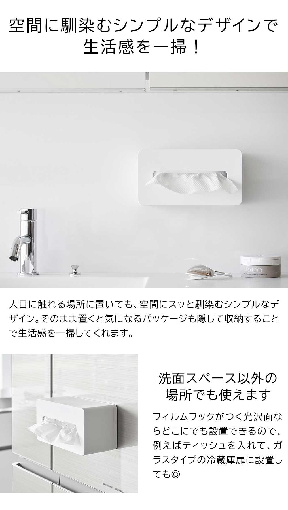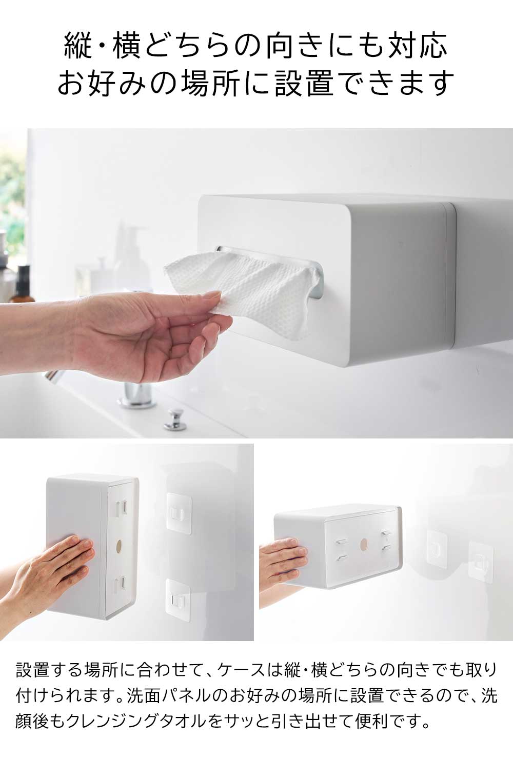 置き場所に困る袋入りのクレンジングタオルを壁面収納できるケースです。フィルムフックがつく壁面に貼り付けてケースを掛けるだけで設置完了。洗面パネルなどに浮かせてスッキリと収納できます。縦・横どちら向きでもお好みの位置に設置可能。洗顔後に手に取りやすい場所で、クレンジングタオルをサッと引き出せて便利です。袋ごと入れるだけなので、入れ替えも簡単にできます。浮かせているので洗面台のお手入れもラクラク。洗面台に直置きにならないので、クレンジングタオルが濡れないのも嬉しいポイントです。空間に馴染みの良いシンプルなデザインで生活感も一掃してくれます。300組までのソフトパックティッシュも収納でき、マグネットのつかない冷蔵庫扉にも取り付けできます。