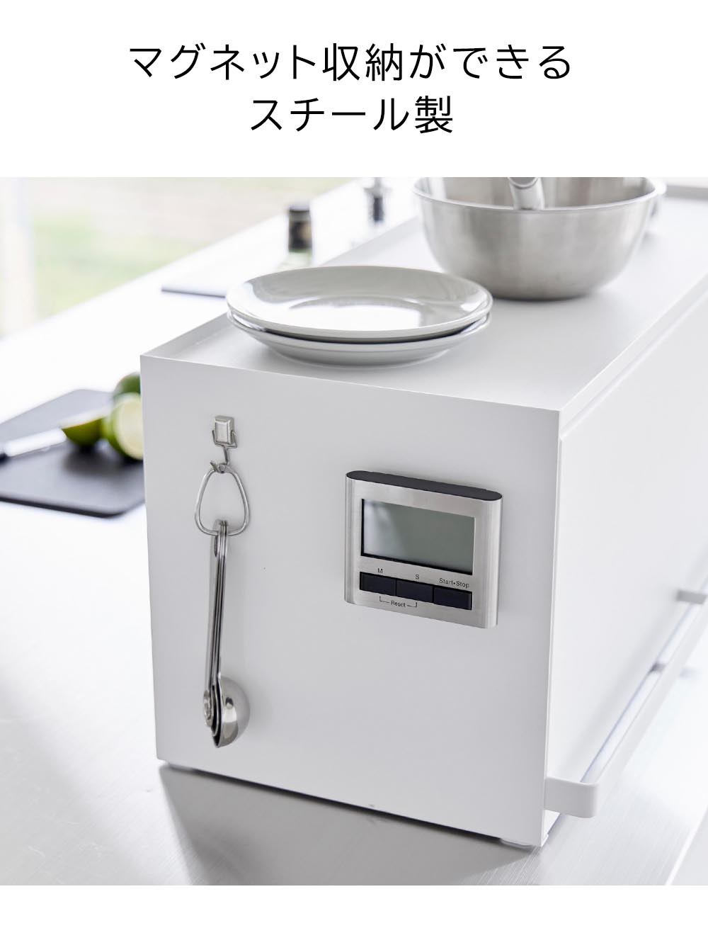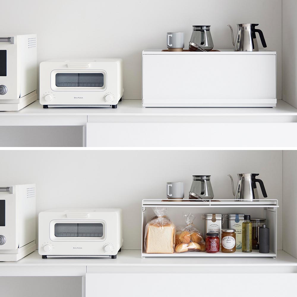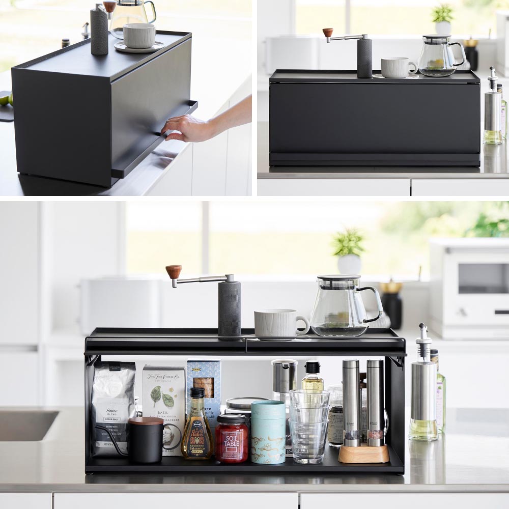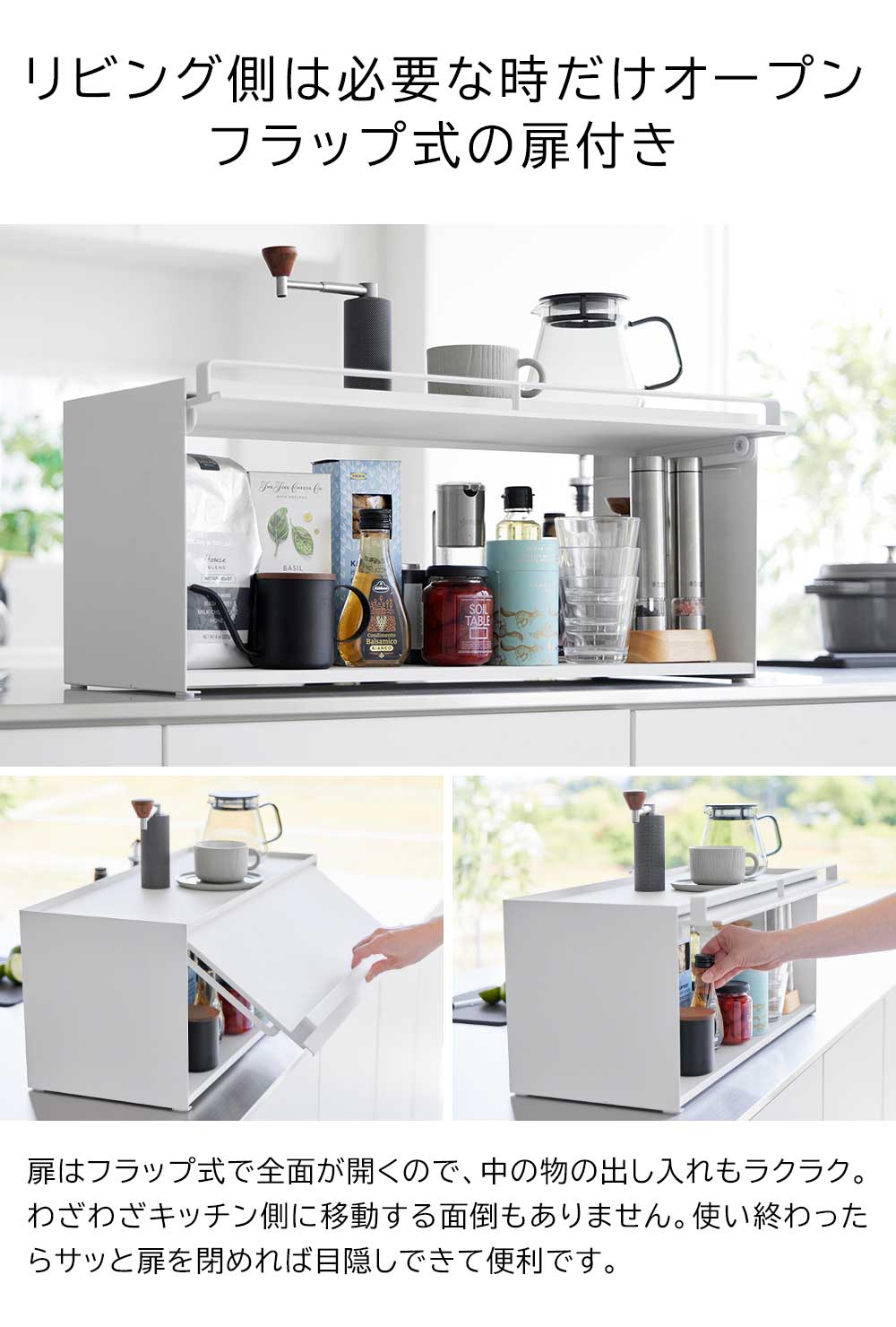 リビング側はスッキリ目隠し カウンター上のゴチャつきをスッキリと整理して、生活感を一掃してくれる奥行き26.7cmのカウンター上収納ラックです。リビング側は全面が開くフラップ式の扉付きで、使いたい時にだけ中の物を取り出し、使い終わったらサッと扉を閉めて目隠しできます。リビングにいながら中の物が取り出せるので、わざわざキッチン側に移動する手間が省けます。 キッチン側は扉がないので調理中でも物の出し入れがしやすく、後片付けもラクラク。ラック上はフチ付きの天板になっているので、お気に入りのコーヒーセットやカトラリーを並べて置いたり、調理器具をちょい置きしたりとマルチに活躍。天板の奥行きは23.7cmあるのでトースターも設置できます。 ラックはスチール製なので、マグネット付きのキッチンタイマーやフックをつけても便利。また壁際に設置してブレッドケースとして使っても◎ ![]() ![]() ![]() ![]() ![]() ![]() ![]() ![]() ![]() ![]() ![]() ![]() ![]() ![]() |