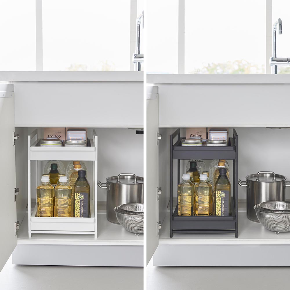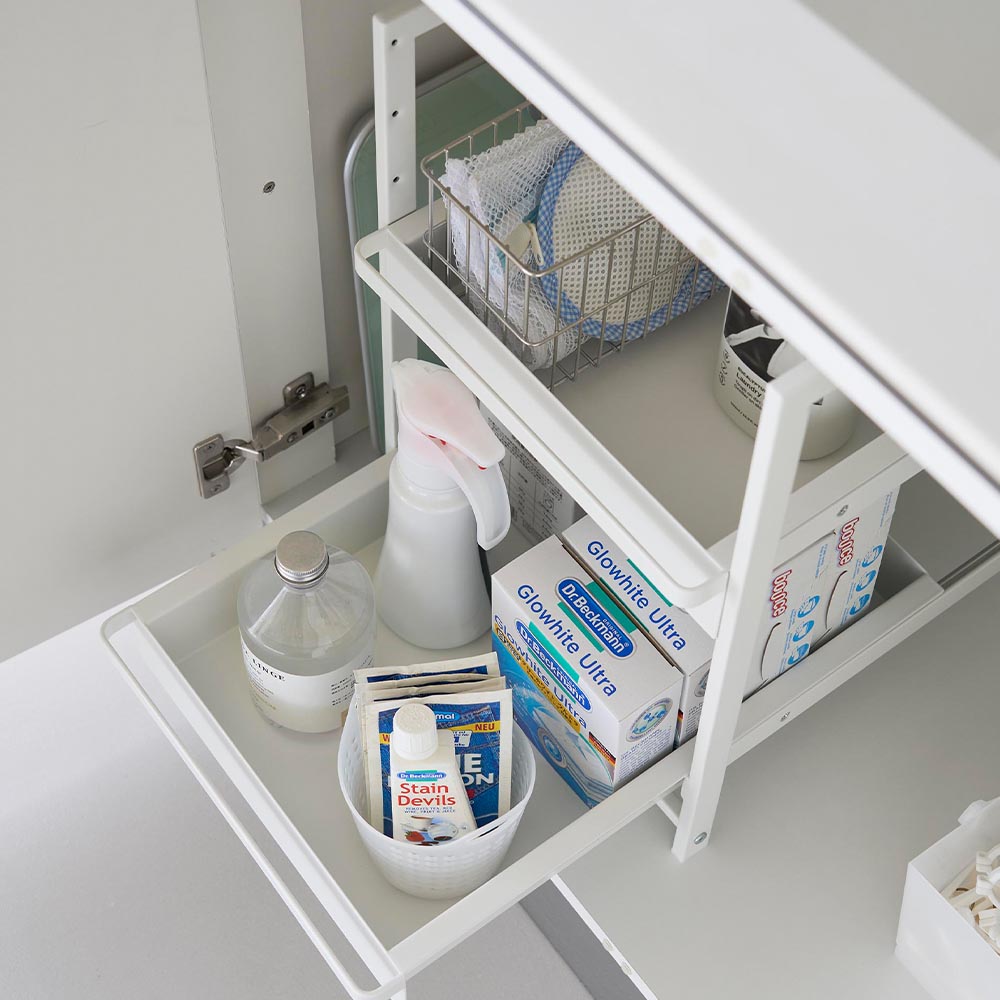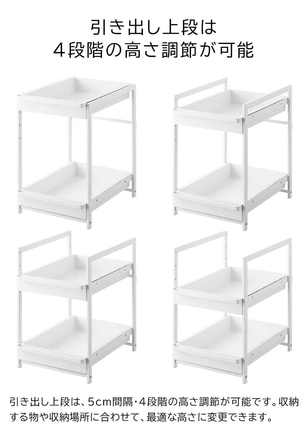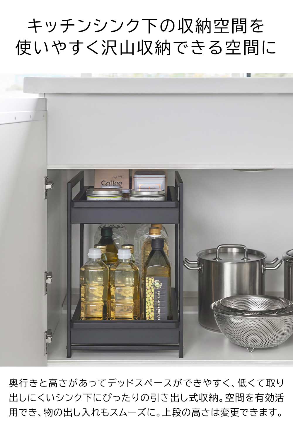 シンク下の空間を無駄なく 低い位置にあり、奥行きと高さがあるシンク下の収納スペースは、物の出し入れや整理がしにくく、空間も無駄にしがち。 こちらの2段のスライドラックを設置すれば、デッドスペースも有効活用して、使いやすい収納空間に変えることができます。 ハンドルを手前に引けば、スライドレールの付いたトレーが引き出され、直置きだと取り出しにくい奥の物もラクラク手に取ることができます。 上段のトレーは5cm刻みで4段階の高さ調節ができ、収納する物や置く場所に合わせて変更できます。キッチンシンク下以外にも、洗面台下の収納にも便利にお使いいただけます。 ![]() ![]() ![]() ![]() ![]() ![]() ![]() ![]() ![]() ![]() ![]() ![]() ![]() ![]() |