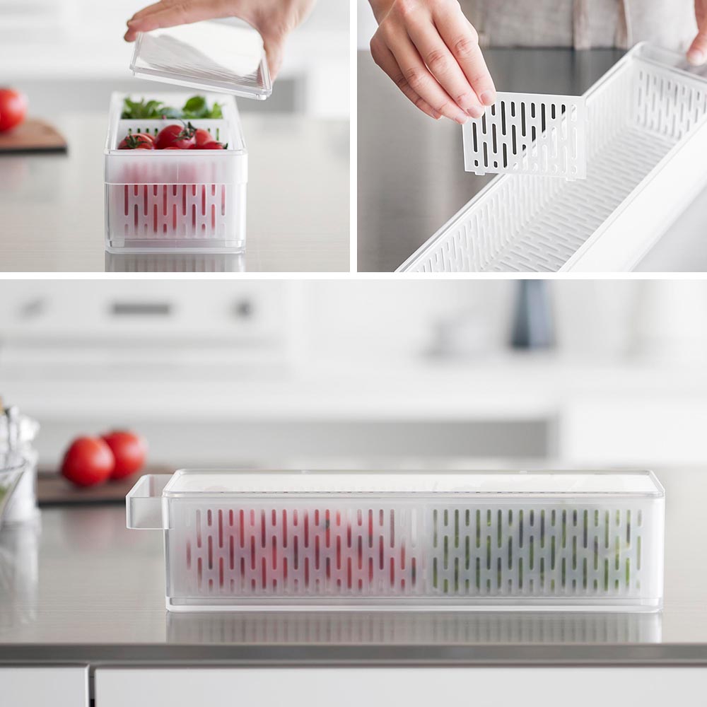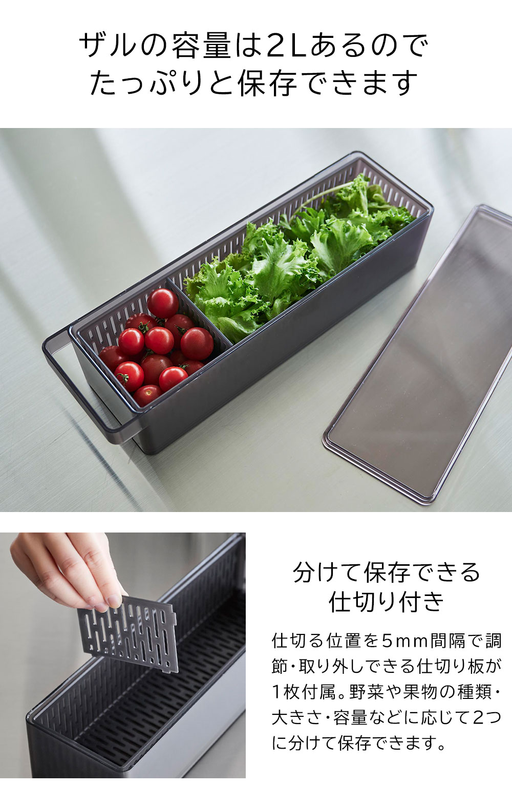 ザルには脚が付いているので、余分な水滴が容器の底に溜まります。保存中の野菜や果物に水が触れず、鮮度をキープしてくれます。ザルの容量は2Lあり、野菜や果物をたっぷりと保存できます。5mm間隔で調節・取り外し可能な仕切り板が1枚付属。野菜や果物の種類・大きさ・容量などに応じて2つに分けて保存できます。