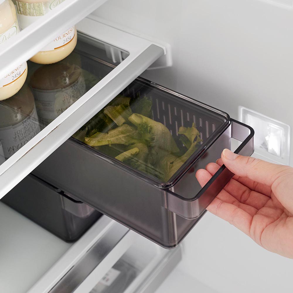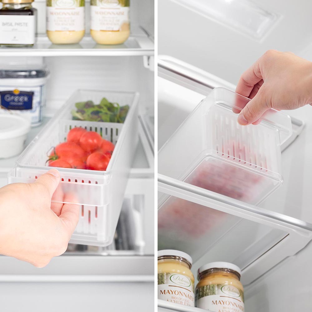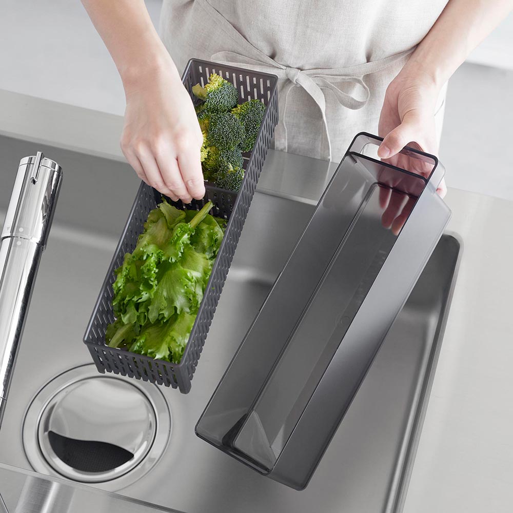 幅11cm・奥行き37.5cmのスリム&ロングサイズ。一般的なザルボウルと違う角型で、限られたスペースにも無駄なく収納でき、冷蔵庫内がスッキリと片付きます。また、積み重ねて収納できるので、冷蔵庫内の縦にあいたスペースも有効に活用できます。