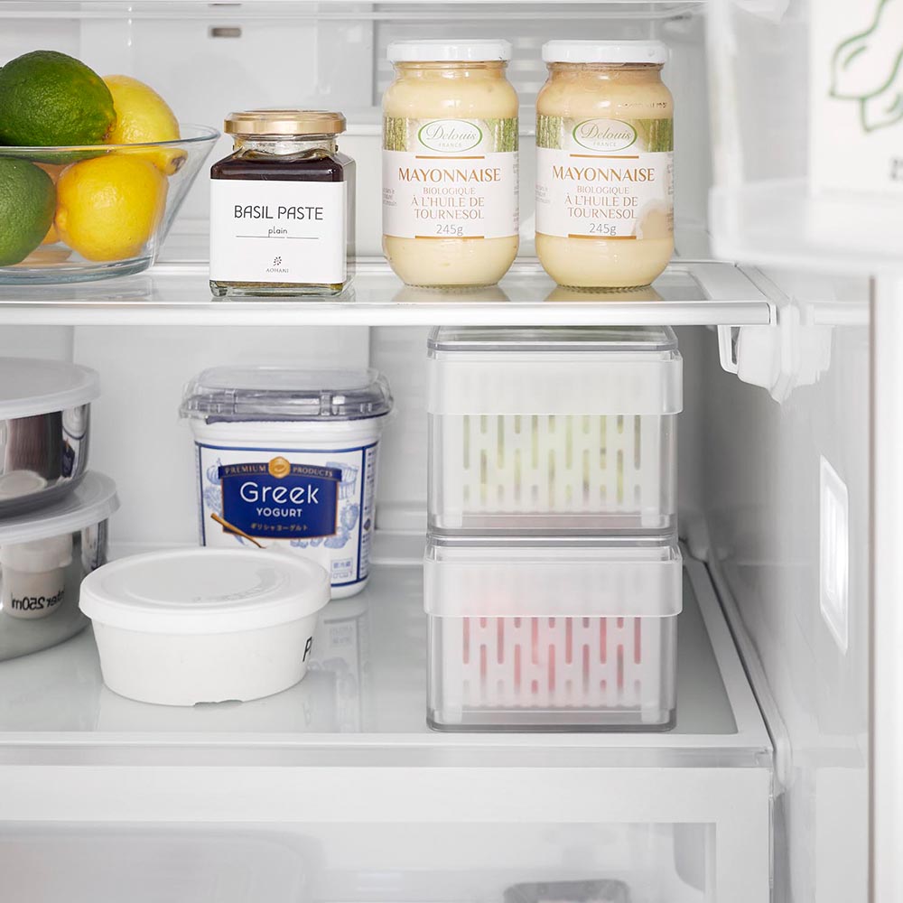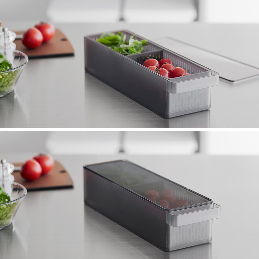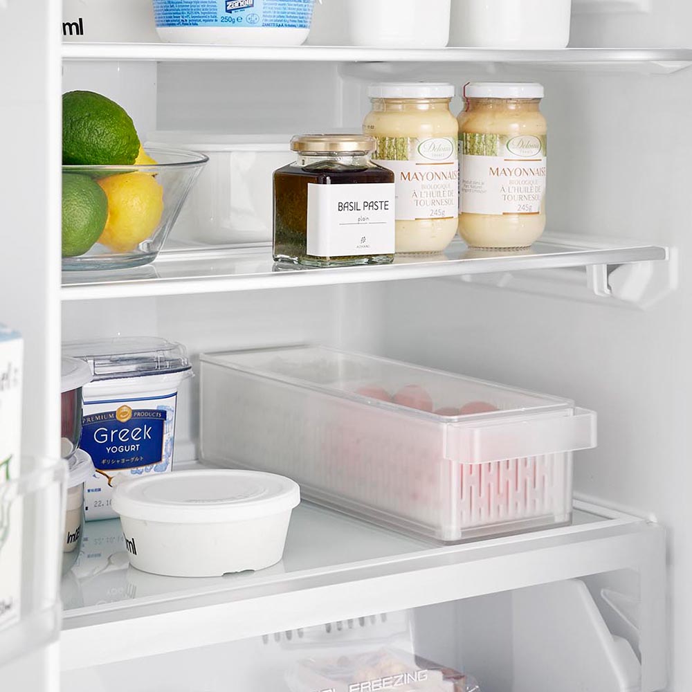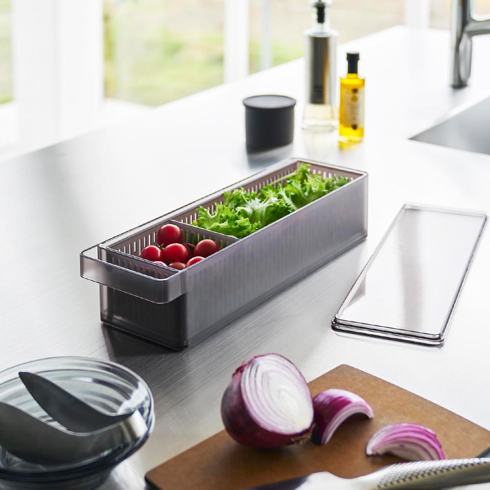 幅11cm・奥行き37.5cmのスリム&ロングサイズ。一般的なザルボウルと違う角型で、限られたスペースにも無駄なく収納でき、冷蔵庫内がスッキリと片付きます。また、積み重ねて収納できるので、冷蔵庫内の縦にあいたスペースも有効に活用できます。