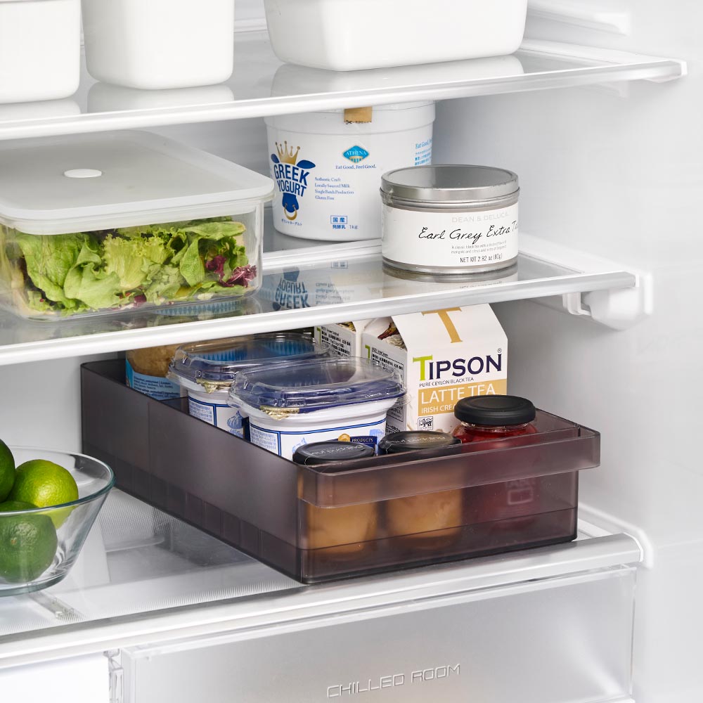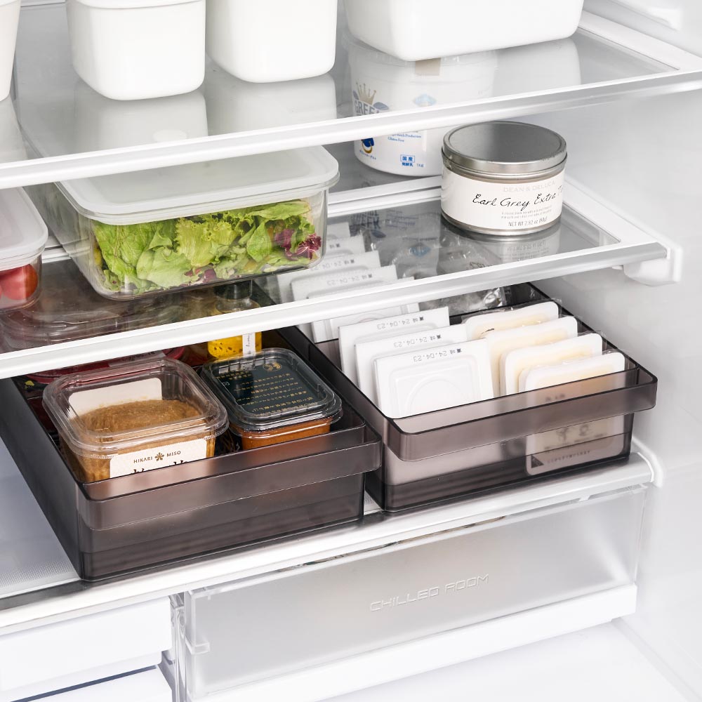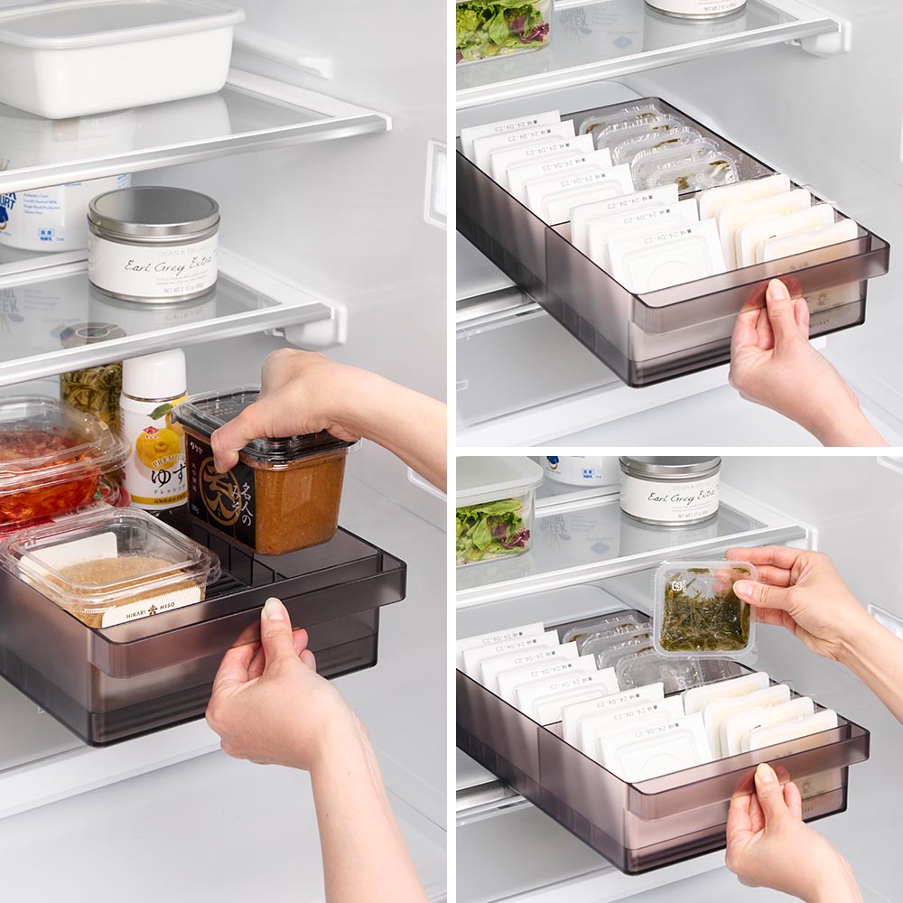 味噌や漬物などの大きなパックをまとめて収納できる大容量の冷蔵庫中収納ケースです。冷蔵庫の奥まで無駄なく使え、スッキリと整理できます。ケース底面に凹凸があることで、納豆や豆腐パックを立てて省スペースに収納できるのも嬉しいポイント。ケースは引き出しがスムーズにできるハンドル付きで、冷蔵庫奥にしまった取り出しにくい物もラクに取り出せ、食品の補充も簡単にできます。お好みの位置で仕切れる可動式の仕切りが付属。冷蔵庫の中以外にも食器棚やパントリー内の整理収納用ケースとしてもおすすめです。