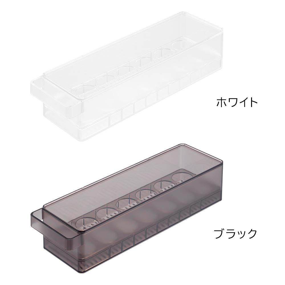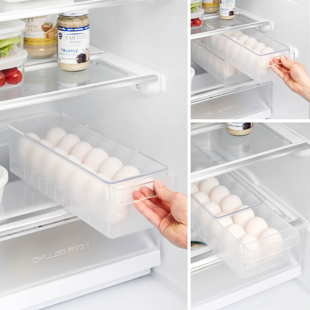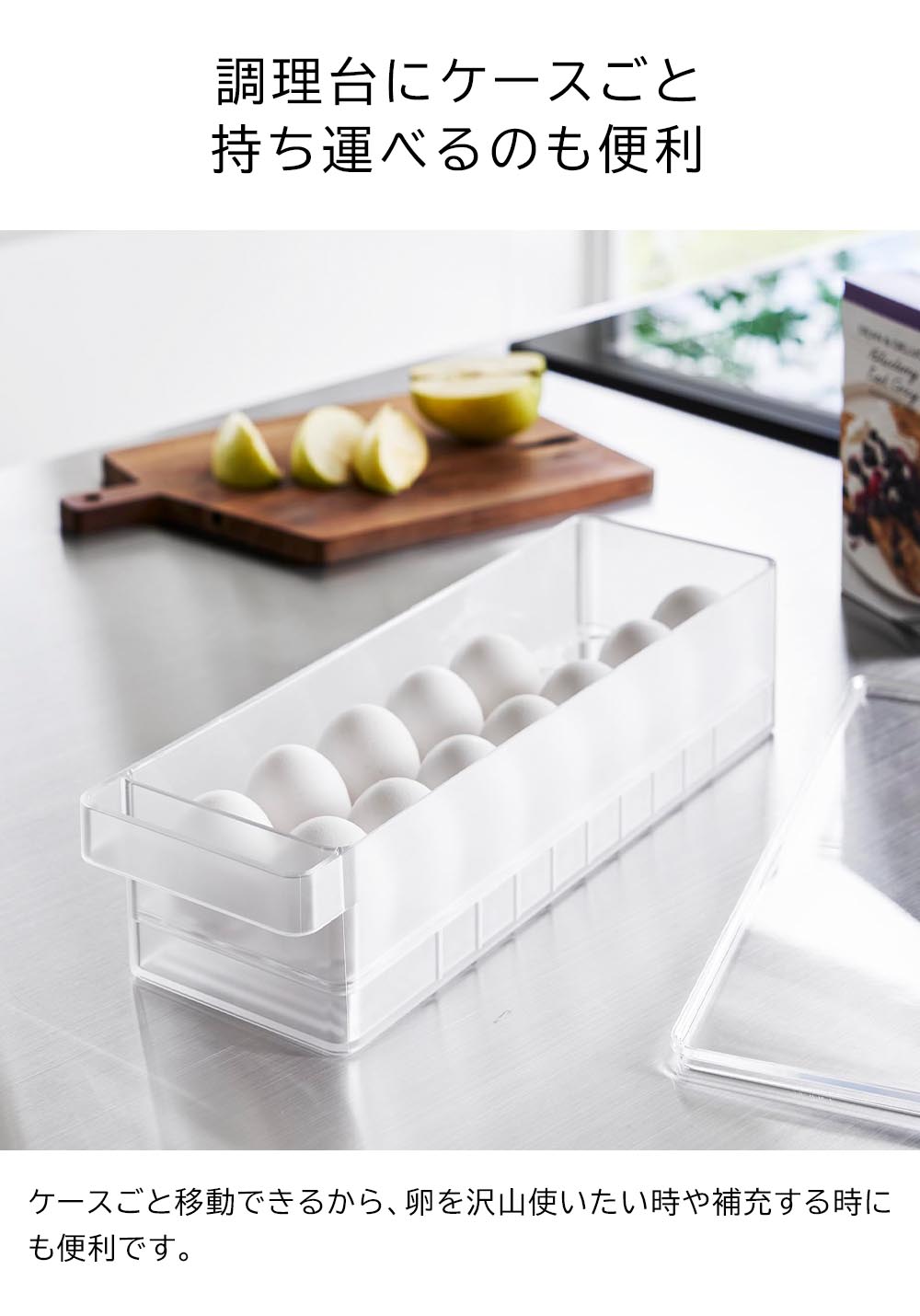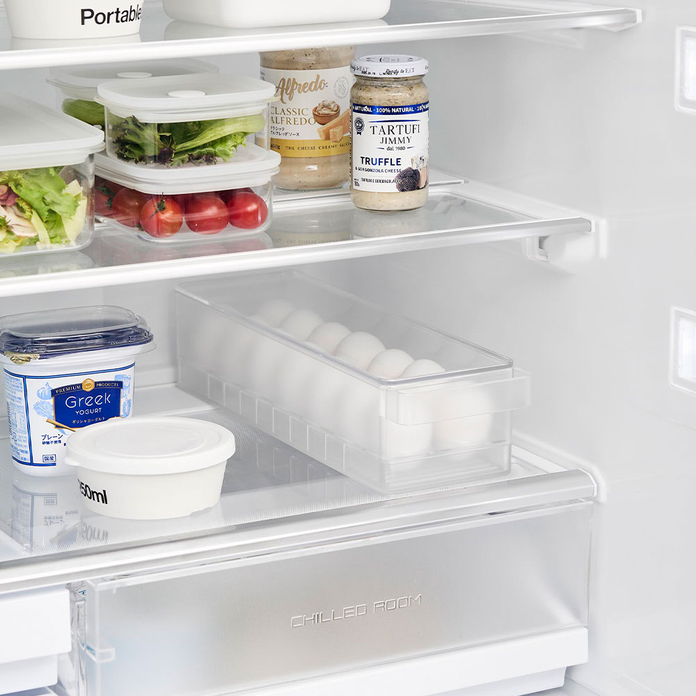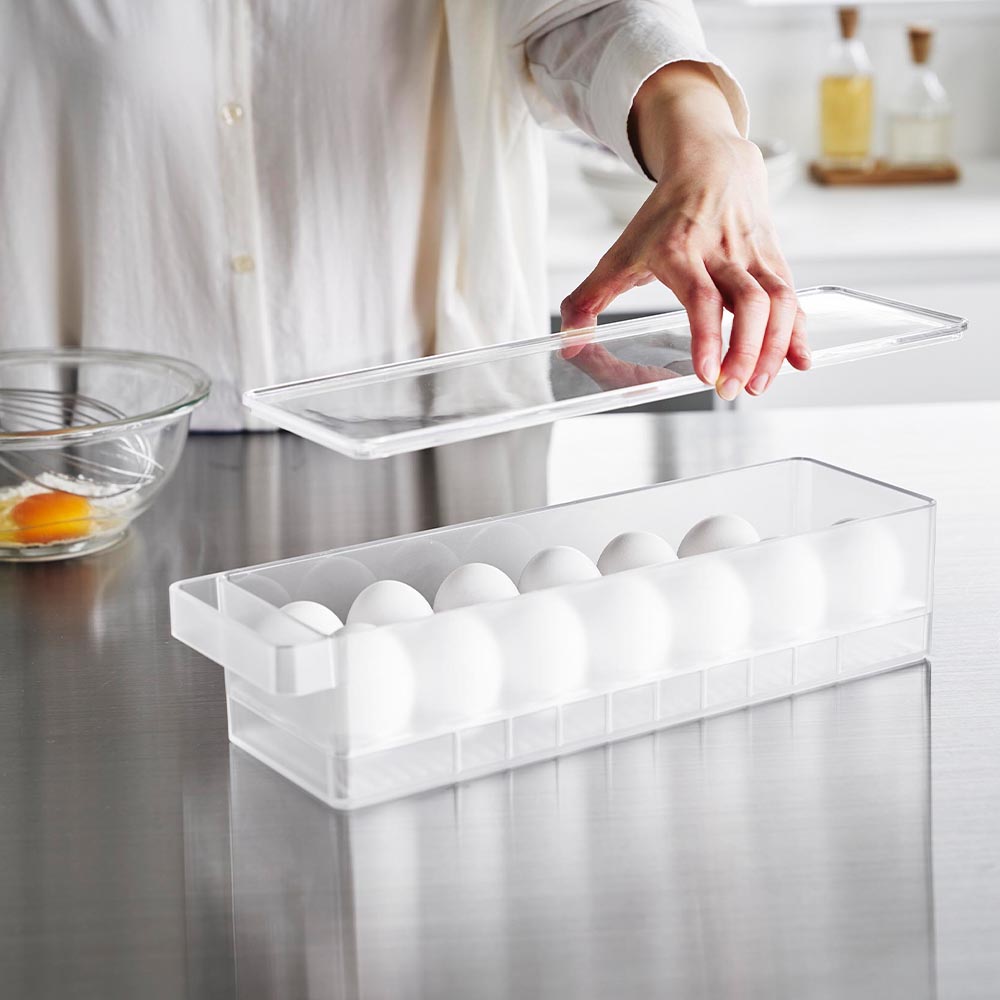 冷蔵庫の奥まで無駄なく使える奥行きワイドな卵ケースです。買い置きしても安心の14個用。