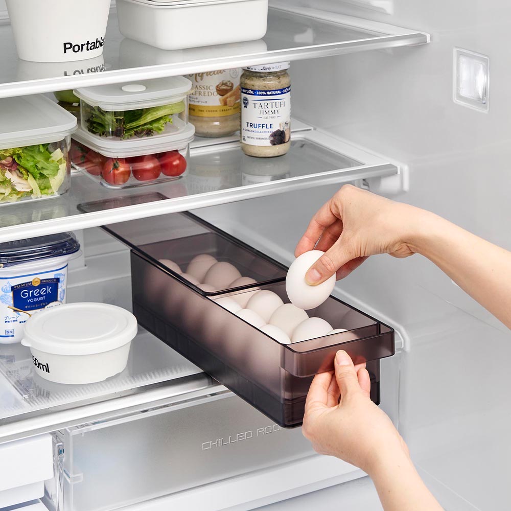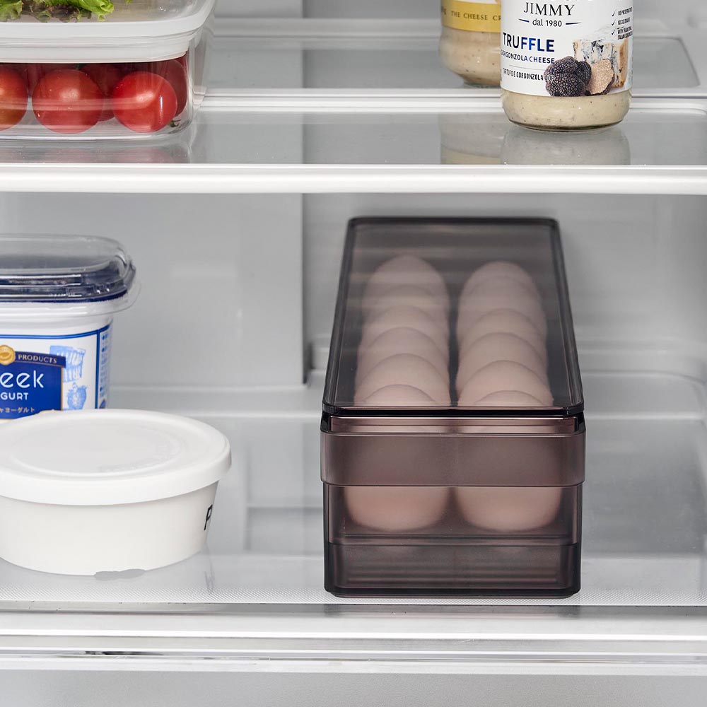 蓋付きだから卵の割れや、におい移りを防いで鮮度も長持ち。縦のスペースを活かし、重ねて収納ができるので庫内をスッキリと整頓できます。