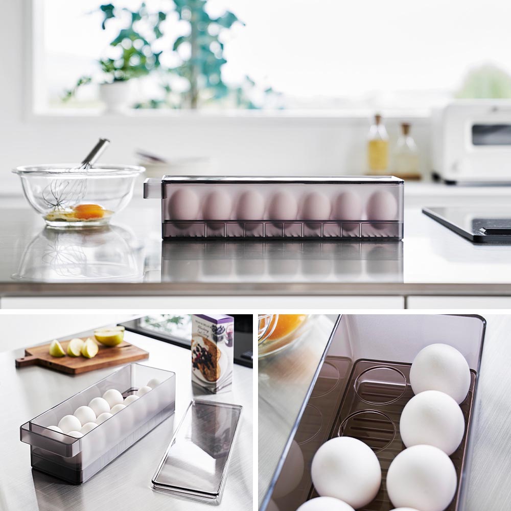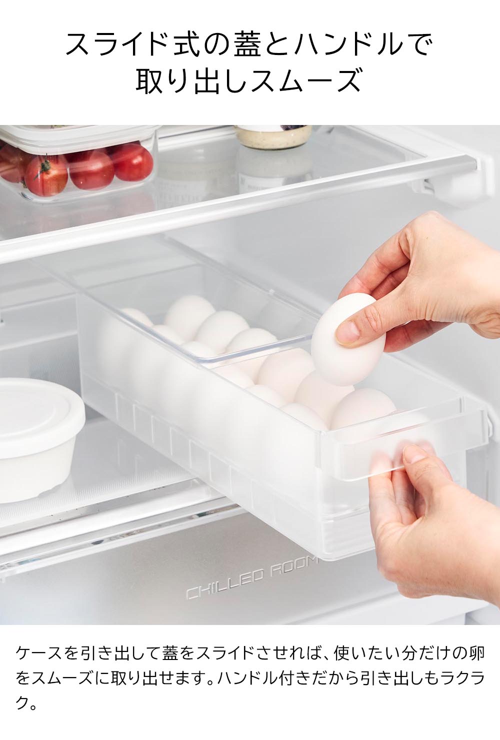 蓋はスライドして開閉でき、冷蔵庫に入れたままでも卵の取り出しがスムーズ。