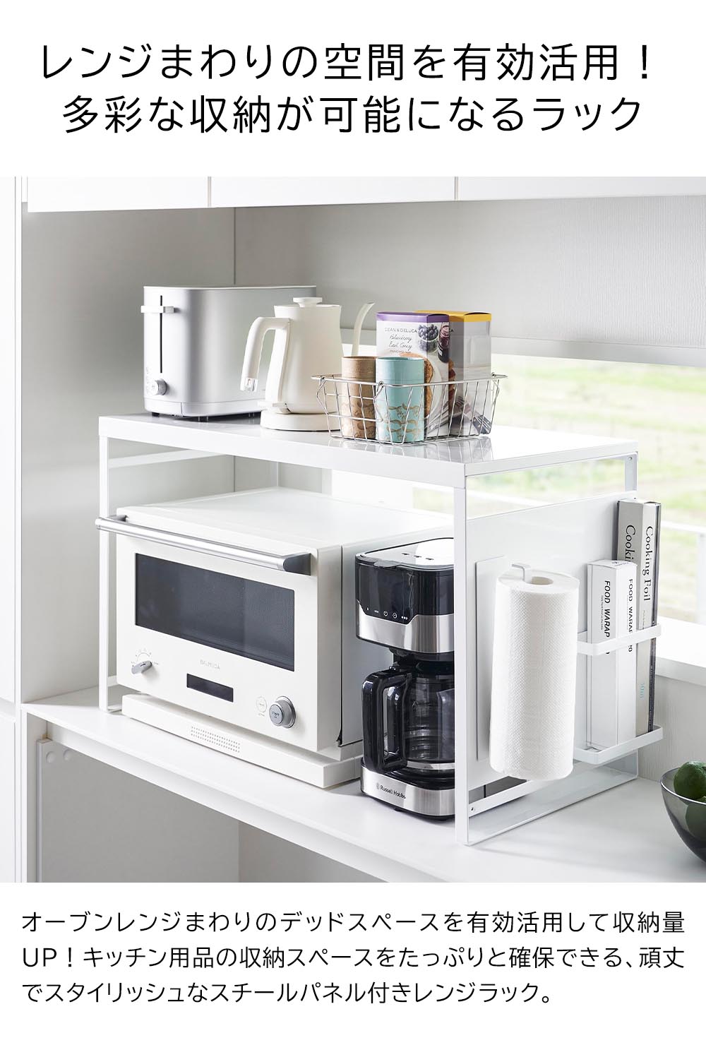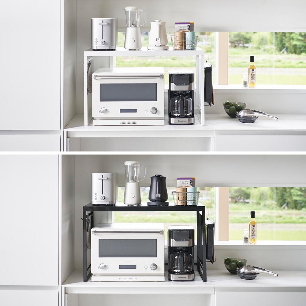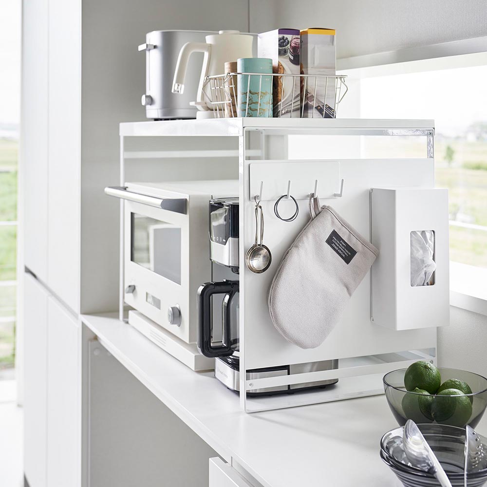 オーブンレンジの周辺には置いておきたいキッチンアイテムが盛り沢山!こちらのレンジラックを設置すれば、オーブンレンジまわりのデッドスペースを有効活用して収納量UP!キッチン家電やキッチンツール、お茶セットなど、細々とした物をスッキリと収納できます。