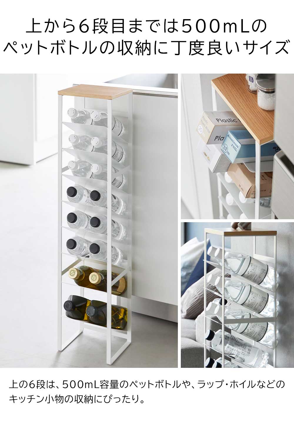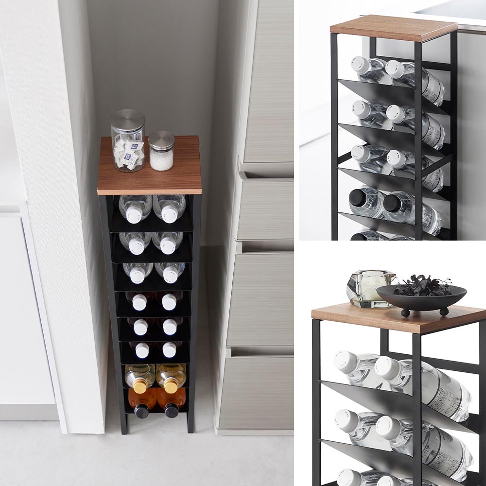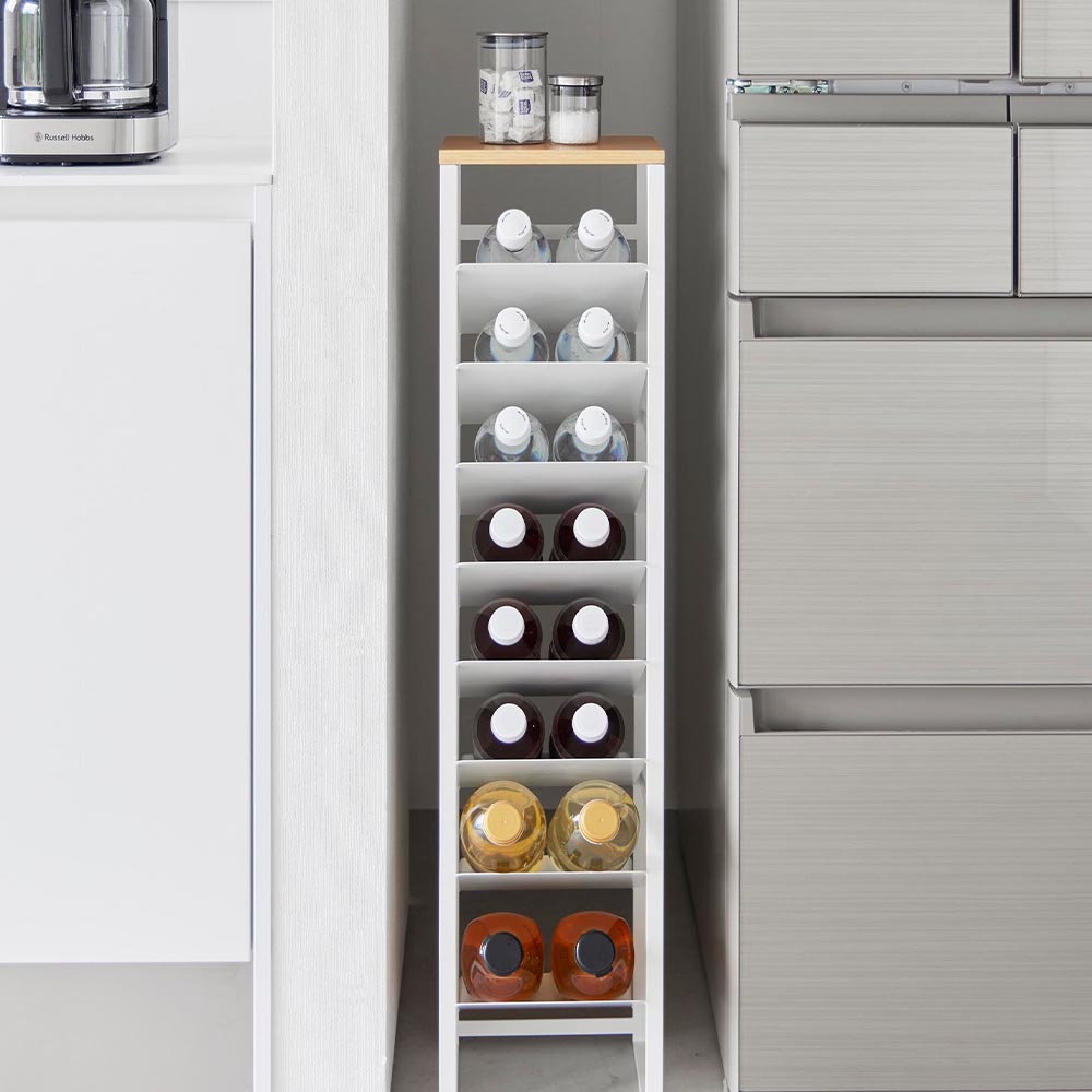 収納に困るボトルを一括収納 毎日飲むペットボトル飲料やお酒などを、すぐに手に取れる場所にスタイリッシュに収納できる、8段のボトルストッカーです。 縦長のとてもスリムなストッカーなので、冷蔵庫と壁の間や、リビングやパントリーのちょっとしたスペースに場所を取ることなく設置できます。 傾斜の付いた棚はボトルを引き出しやすく、安定して収納できるデザイン。ボトルを最大16本収納可能です。 上の6段は、500mLのペットボトルや、キッチンのラップやホイルなどの小物類の収納にぴったり。下の2段はやや高さにゆとりがあり、大きめのボトルや瓶類、調味料ボトルなどの収納に最適です。 天然木の天板には小物を置くことができます。 ![]() ![]() ![]() ![]() ![]() ![]() ![]() ![]() ![]() ![]() ![]() ![]() ![]() ![]() |
