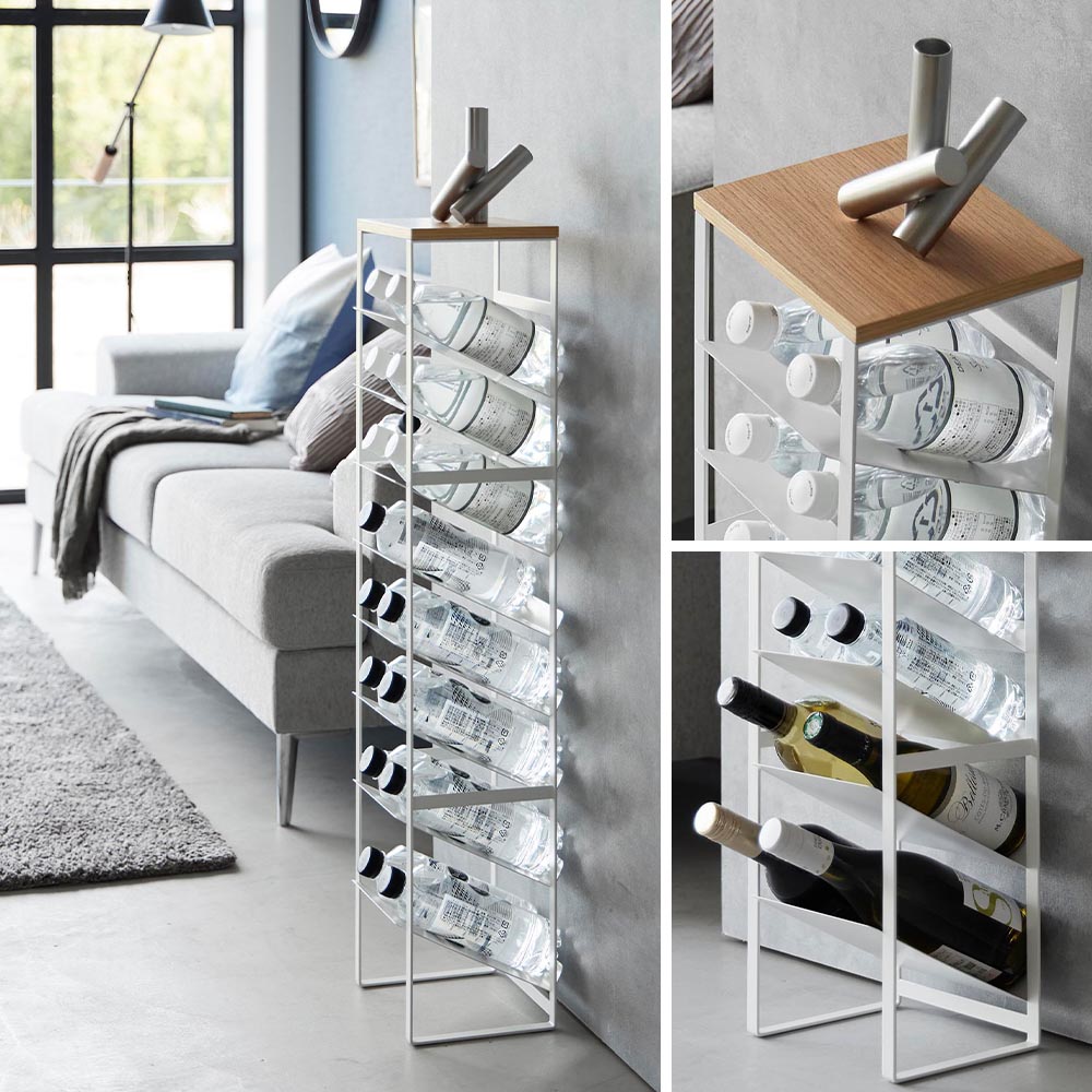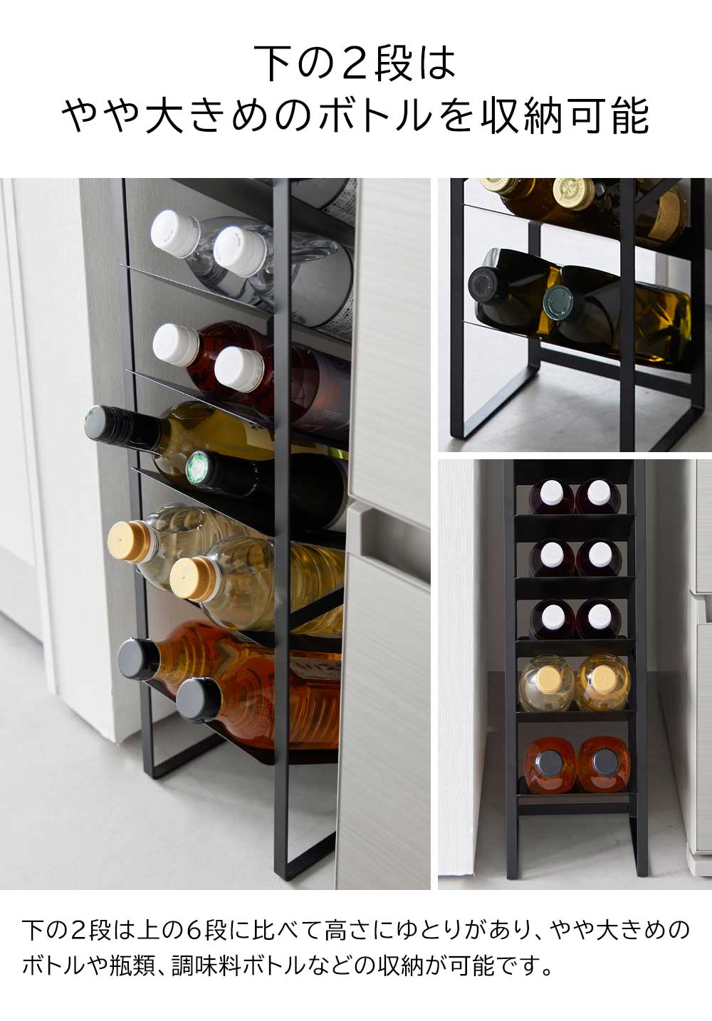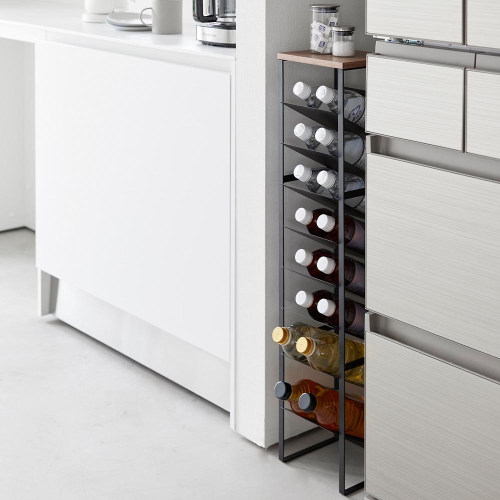 収納に困るボトルを一括収納 毎日飲むペットボトル飲料やお酒などを、すぐに手に取れる場所にスタイリッシュに収納できる、8段のボトルストッカーです。 縦長のとてもスリムなストッカーなので、冷蔵庫と壁の間や、リビングやパントリーのちょっとしたスペースに場所を取ることなく設置できます。 傾斜の付いた棚はボトルを引き出しやすく、安定して収納できるデザイン。ボトルを最大16本収納可能です。 上の6段は、500mLのペットボトルや、キッチンのラップやホイルなどの小物類の収納にぴったり。下の2段はやや高さにゆとりがあり、大きめのボトルや瓶類、調味料ボトルなどの収納に最適です。 天然木の天板には小物を置くことができます。 ![]() ![]() ![]() ![]() ![]() ![]() ![]() ![]() ![]() ![]() ![]() ![]() ![]() ![]() |