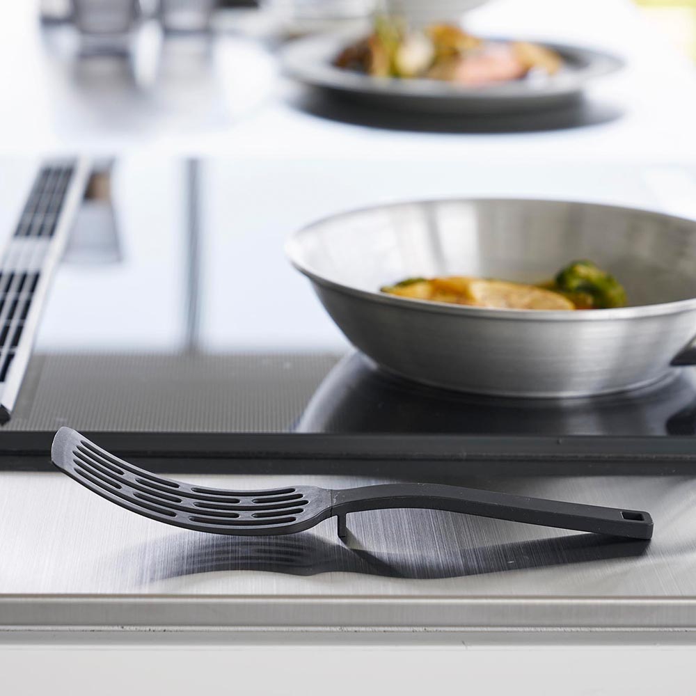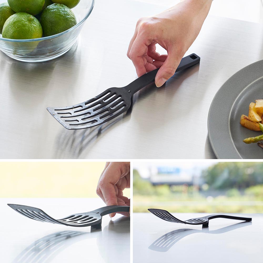 しなやかに曲がるので、鍋やフライパンを傷つけず、フライパンと食材の間にサッと入り、スムーズにすくえます。