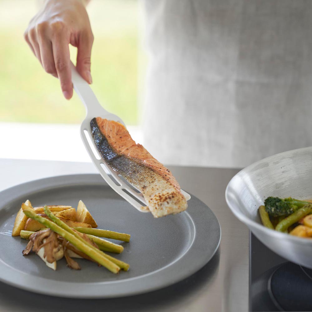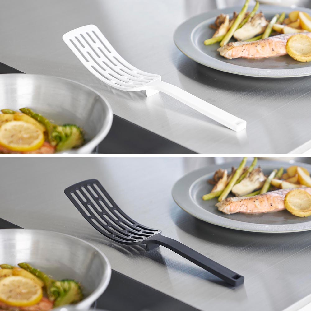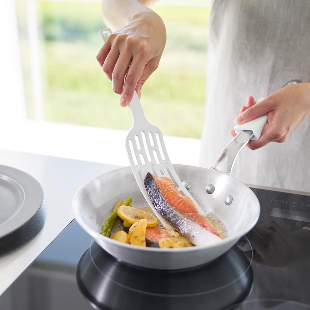 しなやかに曲がるので、鍋やフライパンを傷つけず、フライパンと食材の間にサッと入り、スムーズにすくえます。