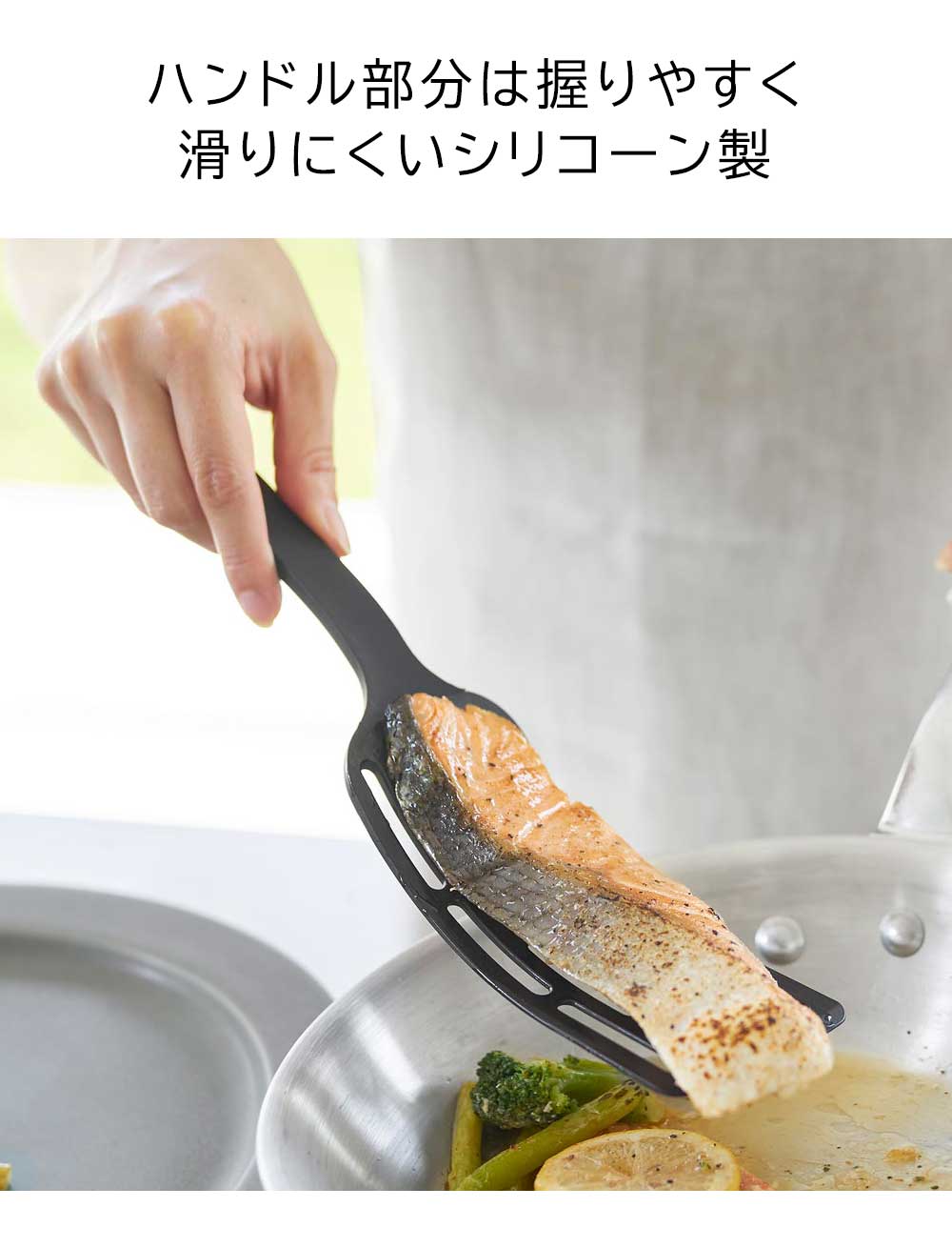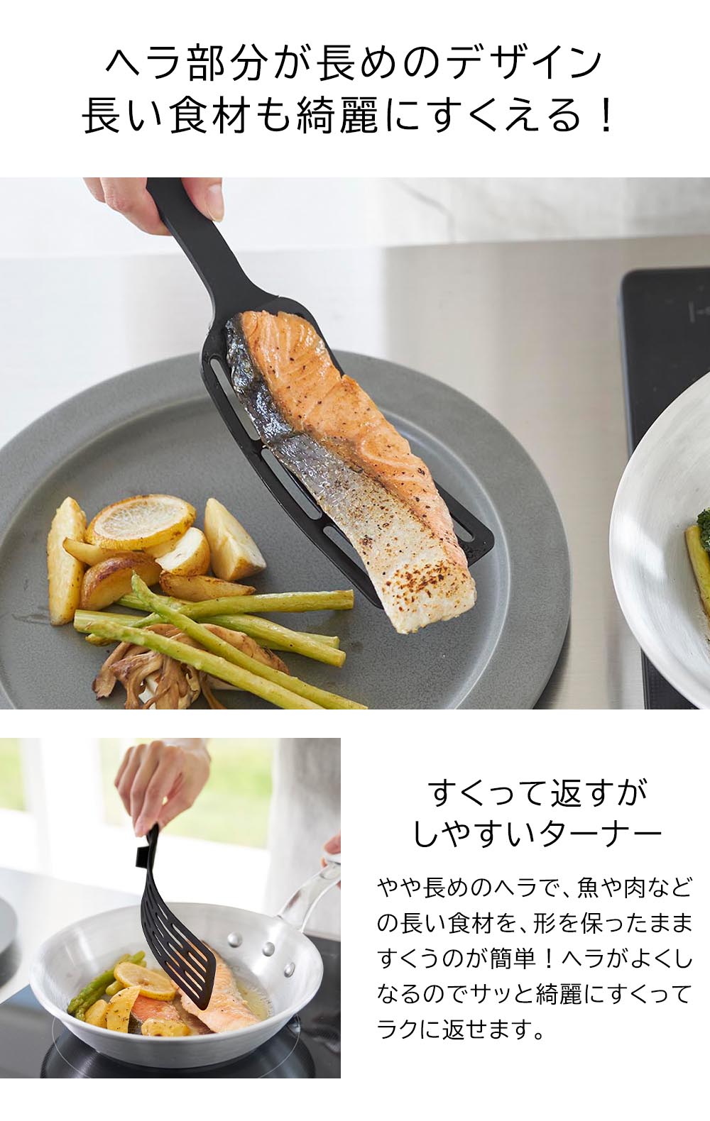 滑りにくく熱に強いロングターナーです。ヘラ部分が一般的なターナーよりも少し長めになっており、魚や肉などの長さのある食材も綺麗にすくい、返すことができます。