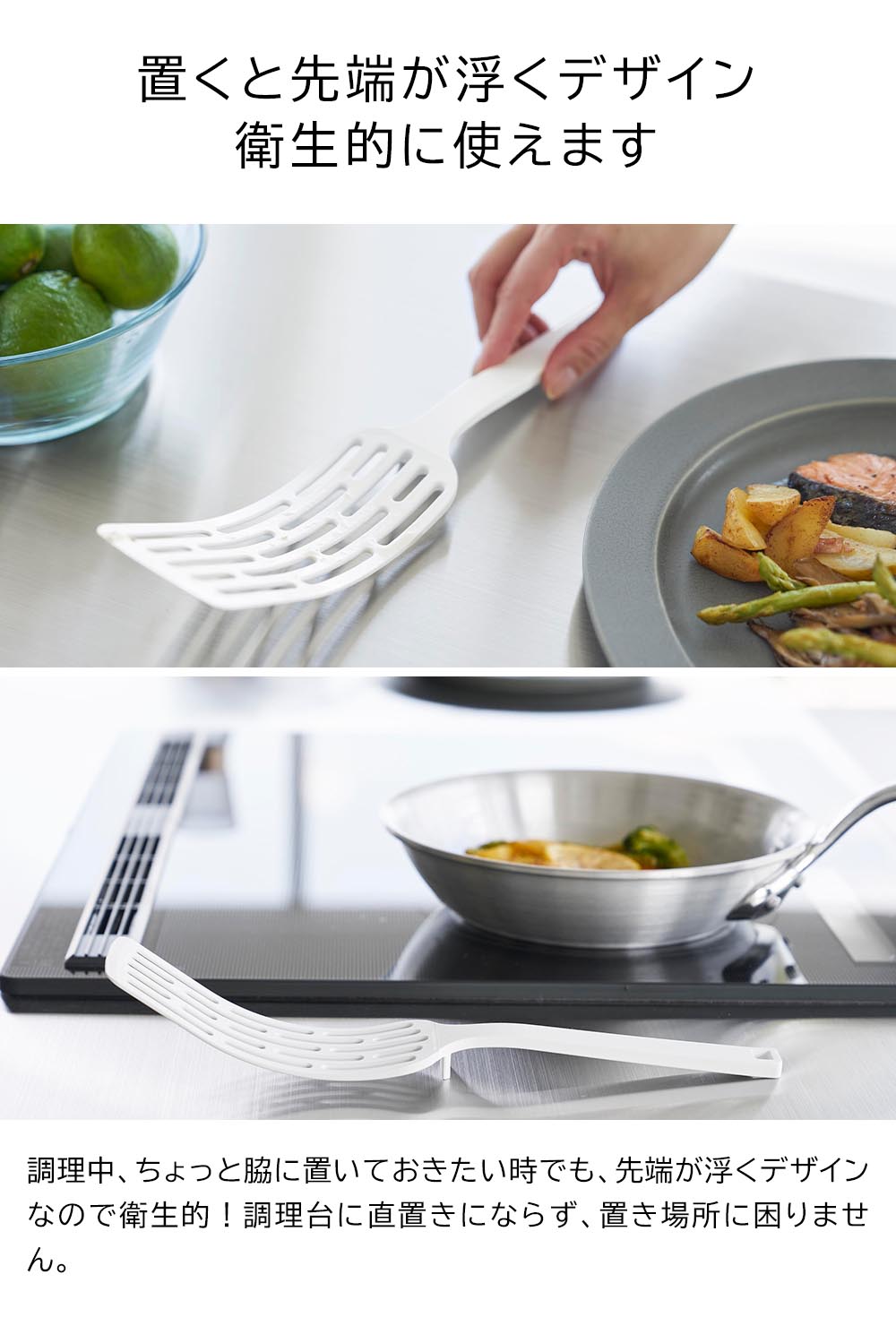 調理中、ターナーをちょっと脇に置いておきたい時でも、先端が浮くデザインになっているので衛生的!調理台に直置きにならず、置き場所に困りません。