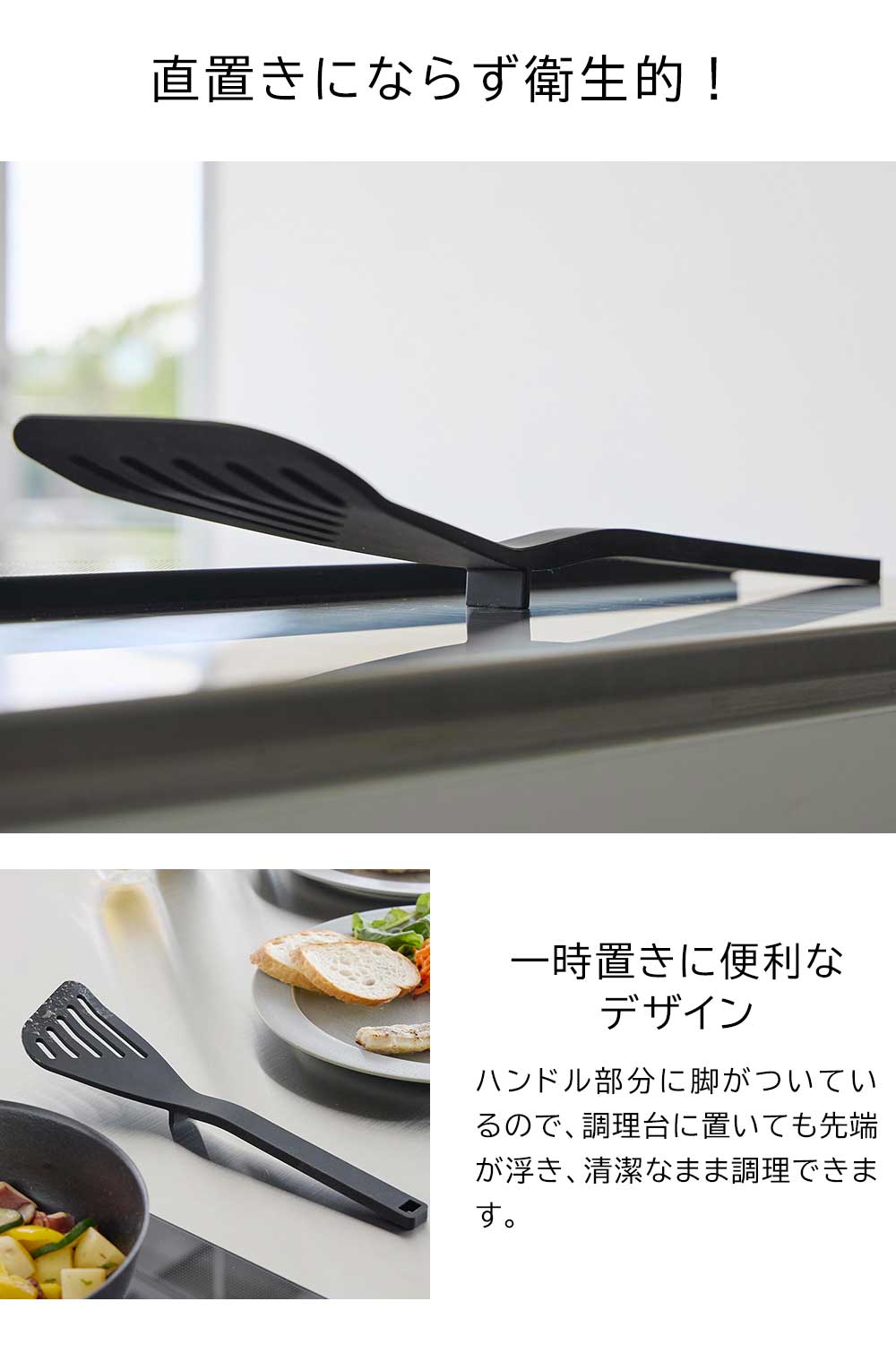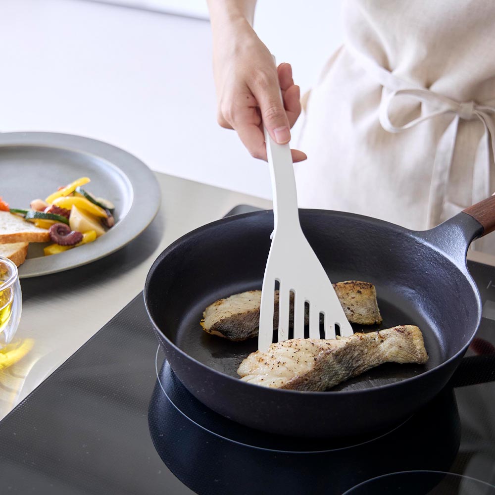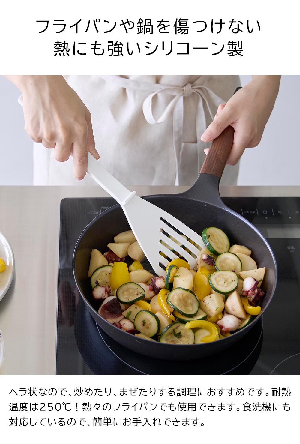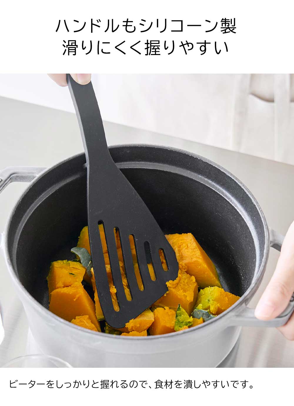 フライパンや鍋を傷つけないシリコーン製のビーター。 炒めたりまぜたりする調理におすすめです。 シリコーンハンドルは滑りにくく握りやすいので、食材を潰す調理でもしっかりと力を伝えられます。 また、ターナーのようにすくったり、ひっくり返すこともできます。 先端が浮くので、直置きにならずに衛生的。一時置きに便利です。 熱に強く、食洗機で洗えます。