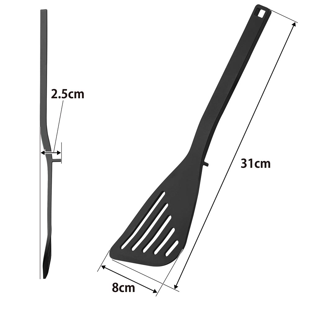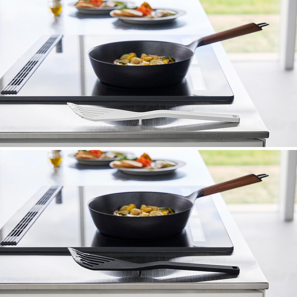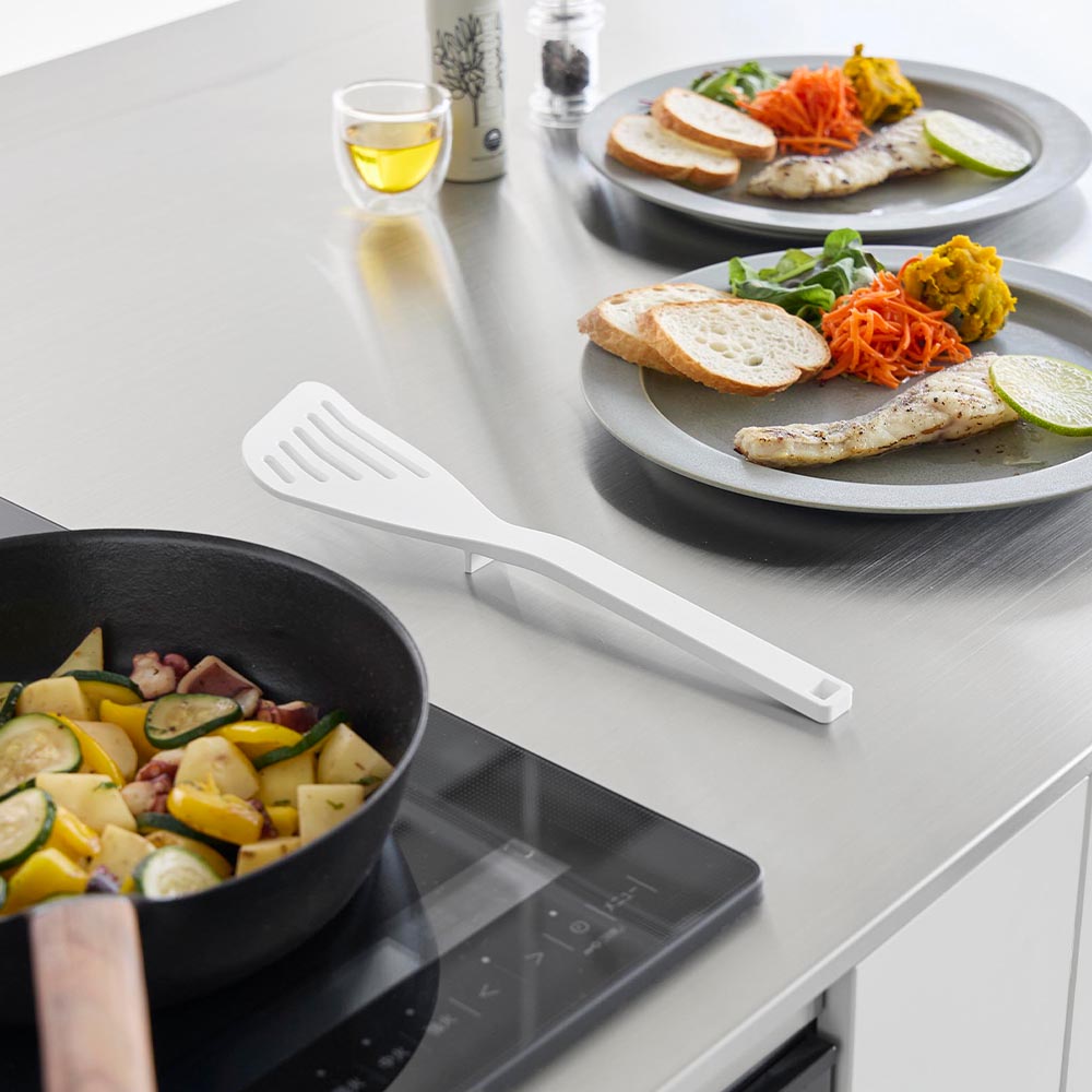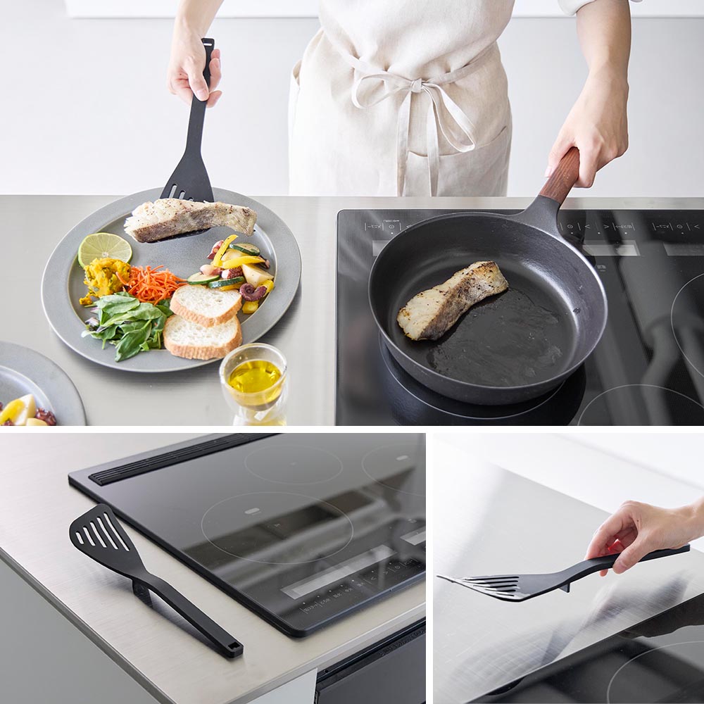 フライパンや鍋を傷つけないシリコーン製のビーター。 炒めたりまぜたりする調理におすすめです。 シリコーンハンドルは滑りにくく握りやすいので、食材を潰す調理でもしっかりと力を伝えられます。 また、ターナーのようにすくったり、ひっくり返すこともできます。 先端が浮くので、直置きにならずに衛生的。一時置きに便利です。 熱に強く、食洗機で洗えます。