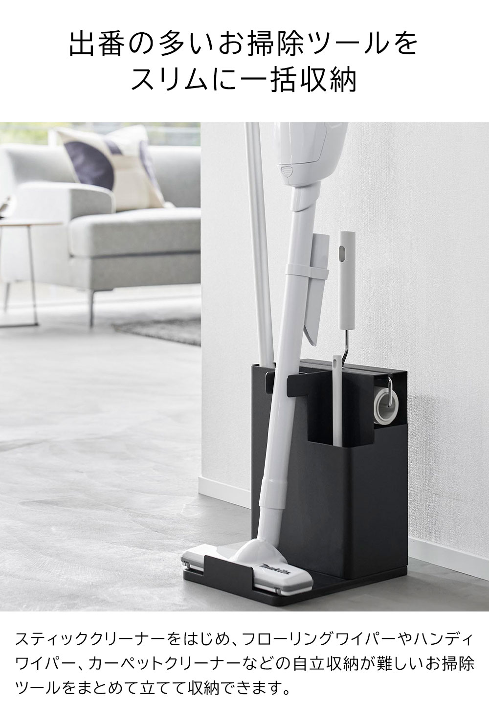 置き場所に困る掃除道具を 置き場所に困るお掃除グッズを隠して一括収納できるクリーナーツールオーガナイザーです。 それぞれのお掃除ツールに収納スペースがあり、スティッククリーナー、フローリングワイパー、ハンディワイパーをスリムに立てて収納。カーペットクリーナーは横からスライドして入れるだけ と出し入れもスムーズ。 背面にはストックの収納スペースもあり便利です。 生活感を感じさせないスタイリッシュでスリムなデザインで、リビングやお部屋の隅にすっきりと収まります。 ![]() ![]() ![]() ![]() ![]() ![]() ![]() ![]() ![]() ![]() ![]() ![]() |