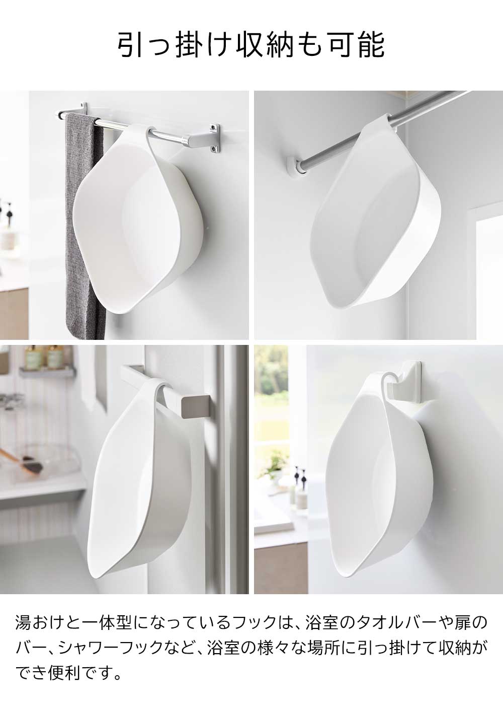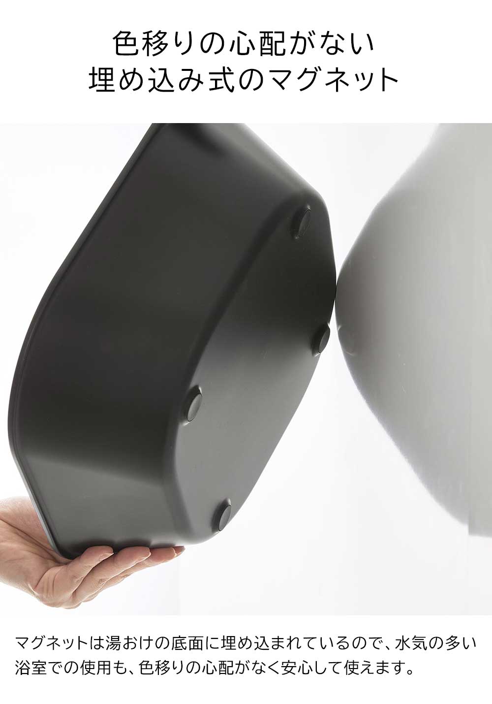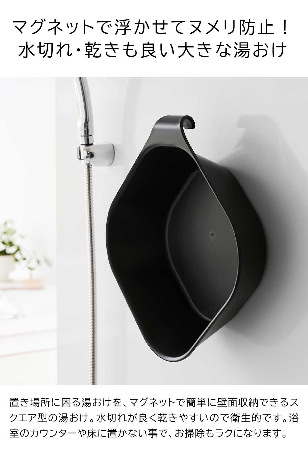 マグネットとフックで お風呂で置き場所に困る湯おけを、マグネットでペタッと簡単に壁面収納できるスクエア型の湯おけ。 水切れが良く乾きやすいので、ヌメリにくく衛生的です。 浴室のカウンターや床に置かない事で、お掃除もラクになります。 マグネットは湯おけの底面に埋め込まれているので、壁や床への色移りを防ぎます。 また、湯おけと一体型になっているフックは、浴室のタオルバーや扉のバー、シャワーフックなど、浴室の様々な場所に引っ掛けて収納ができ便利です。 ![]() ![]() ![]() ![]() ![]() ![]() ![]() ![]() ![]() ![]() |