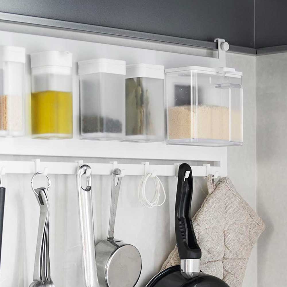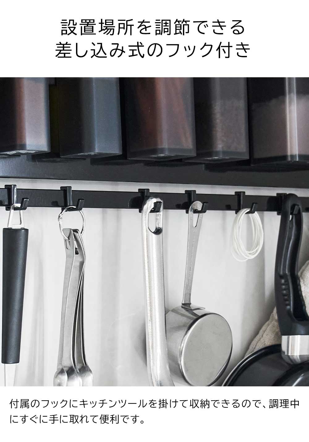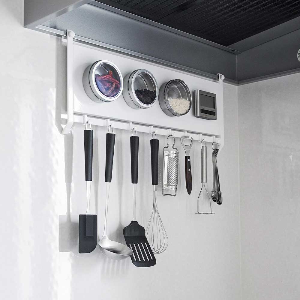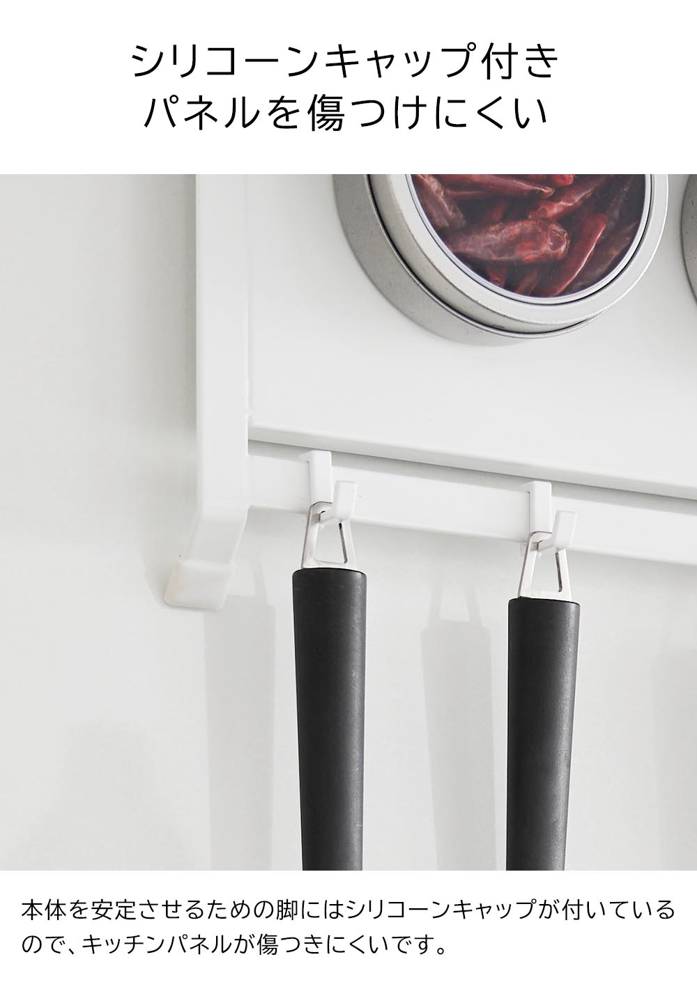 パネル下のフックにキッチンツールを引っ掛けて収納できるので、