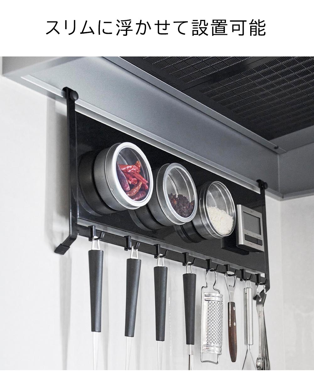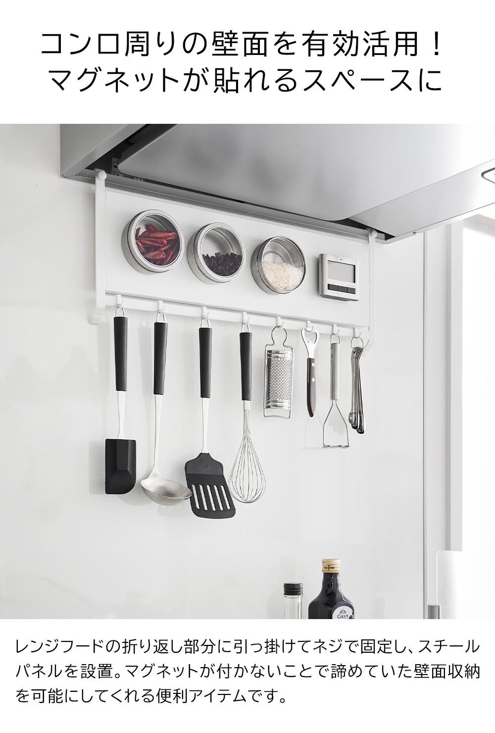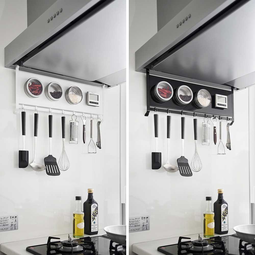 レンジフードの折り返し部分に引っ掛けてネジで固定するだけなので賃貸でも使え、