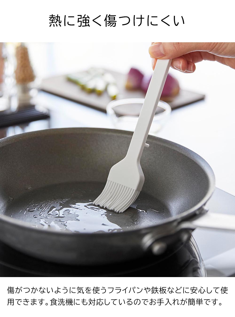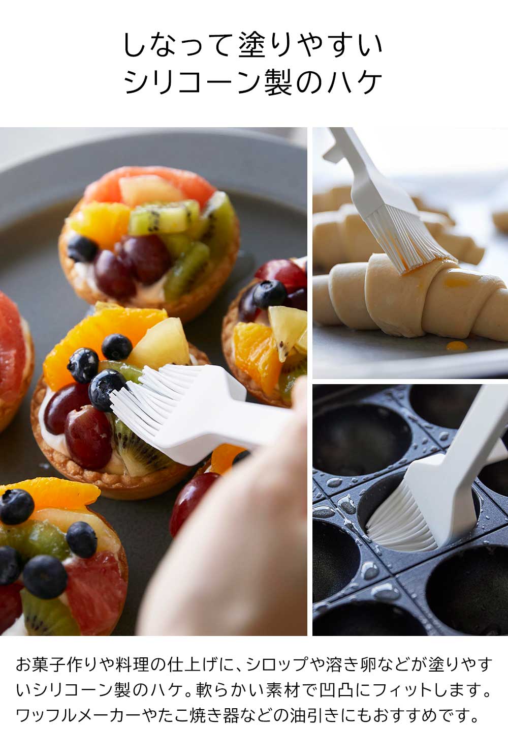お菓子作りや料理の仕上げに、シロップや溶き卵などが塗りやすいシリコーン製のハケ。ハケがしなるので塗りやすく、凹凸のあるワッフルメーカーやたこ焼き器などの油引きもおすすめです。フライパンや鉄板を傷つけない優しい素材です。ハケを一時置きしても、先端が浮き清潔に使えます。熱に強く、食洗機で簡単にお手入れできます。