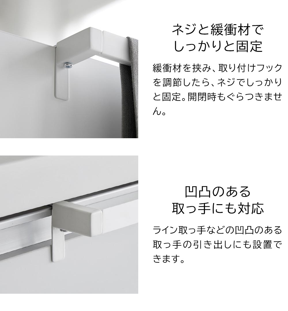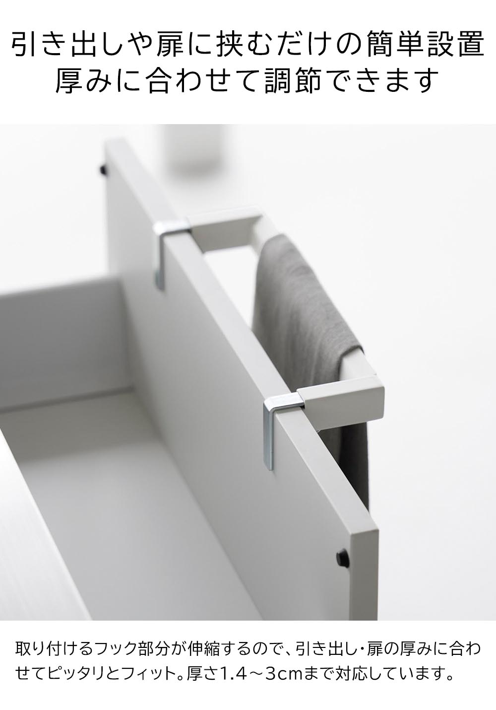 タオルで手を拭いた時の 引き出しや扉に挟むだけの簡単設置!シンクキッチンタオルの滑り落ちを防止してくれるタオルハンガーです。ハンガーのバー部分がシリコーン素材でできており、上部が角ばった形状なので、タオルで手を拭いた時もしっかりとホールド!滑り落ちにくくなっています。厚さ約1.4~3cmまでの引き出し・扉に対応しており、設置箇所の厚みにフックを合わせてネジで固定するだけで設置完了。奥行き4.5cmと、キッチンでの作業の邪魔にならない薄型なのも嬉しいポイントです。 ![]() ![]() ![]() ![]() ![]() ![]() ![]() ![]() ![]() ![]() ![]() |