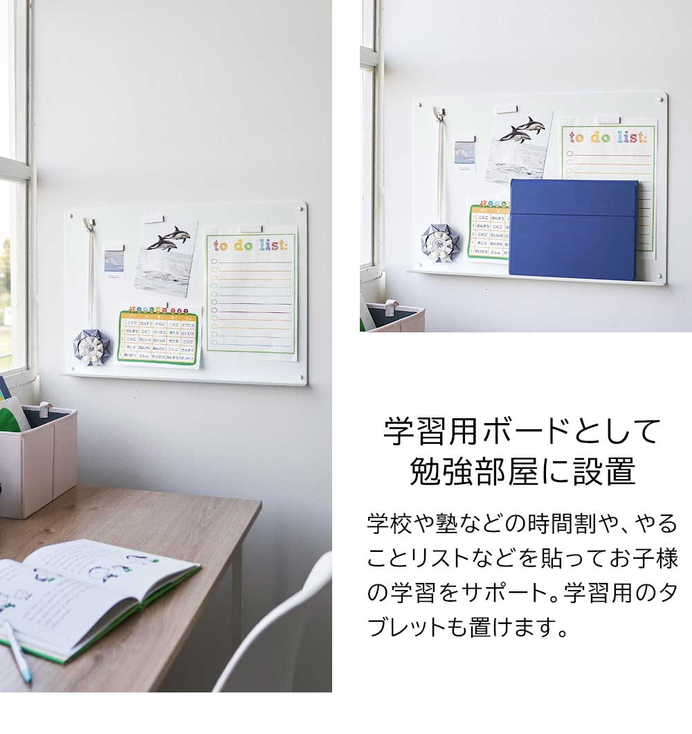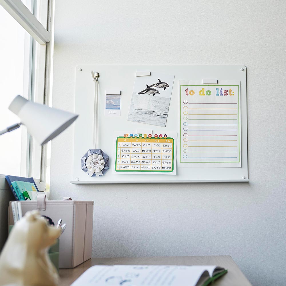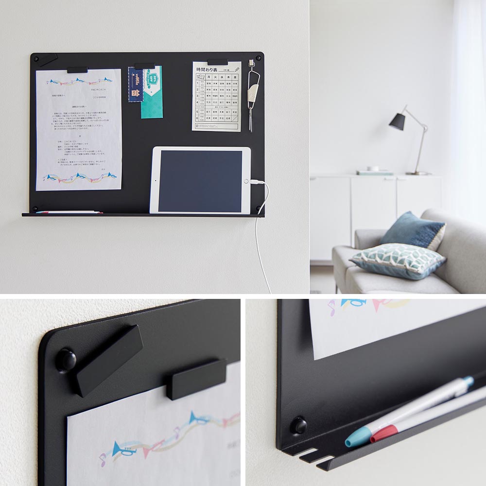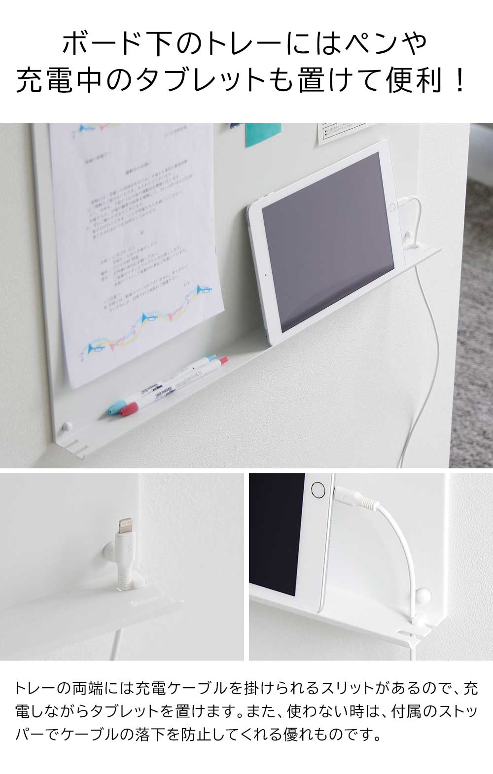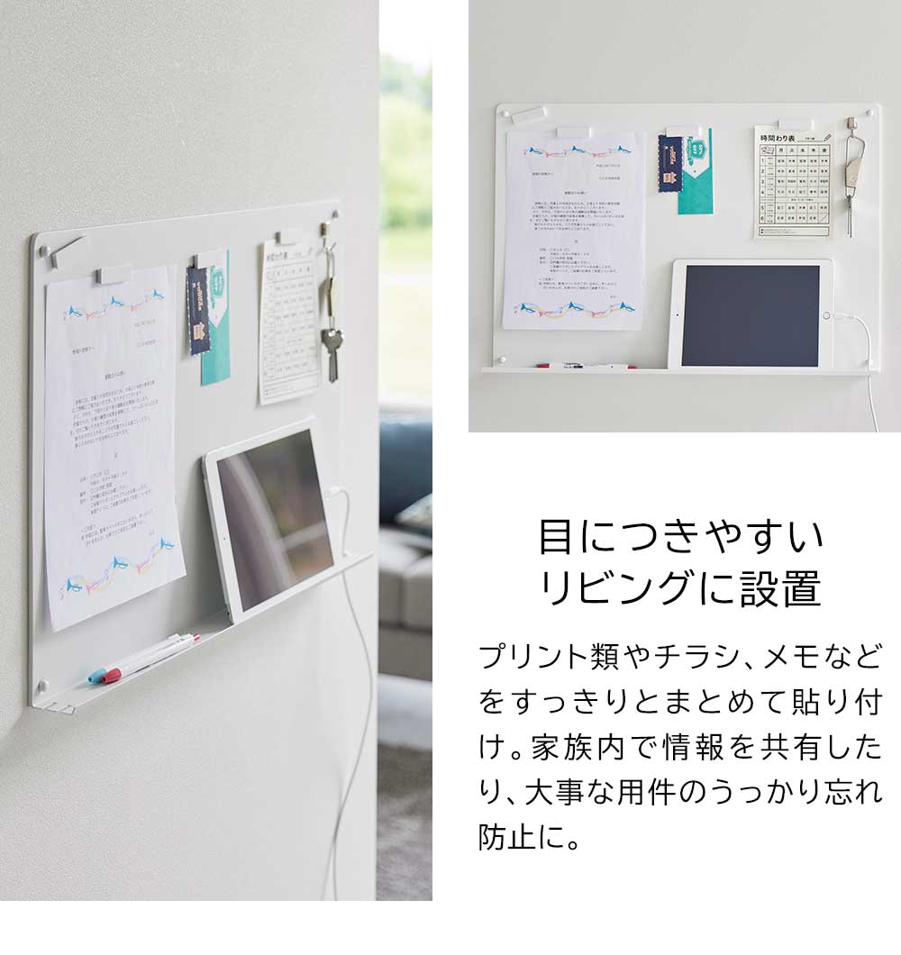 マグネットであれこれ貼って 様々なお部屋の壁面に取り付けて、マグネットでプリント類をペタッと貼り付けられるスチール製のプリントボードです。石こうボードピンで簡単に取り付けられ、壁の穴が目立たないので賃貸でも安心です。木ネジでの取り付けも可能。マグネットが4個付属しているので、手にしたその日からお使いいただけます。 リビングの目につきやすい場所に設置して、プリントやメモなどを貼り付ければ、家族内での情報共有や大事な用件のうっかり忘れ防止に。勉強部屋に設置すれば、お子様の勉強のサポートに役立つ学習用ボードとしても使えます。ボード下にはトレーがあり、ペンやリモコンなどを置けます。またタブレットスタンドとしても使え、タブレットを充電しながら収納できます。充電ケーブル用ホルダーがトレーの両端にあり、充電ケーブルの落下を防ぐストッパーも付属しています。 ![]() ![]() ![]() ![]() ![]() ![]() ![]() ![]() ![]() ![]() ![]() ![]() |