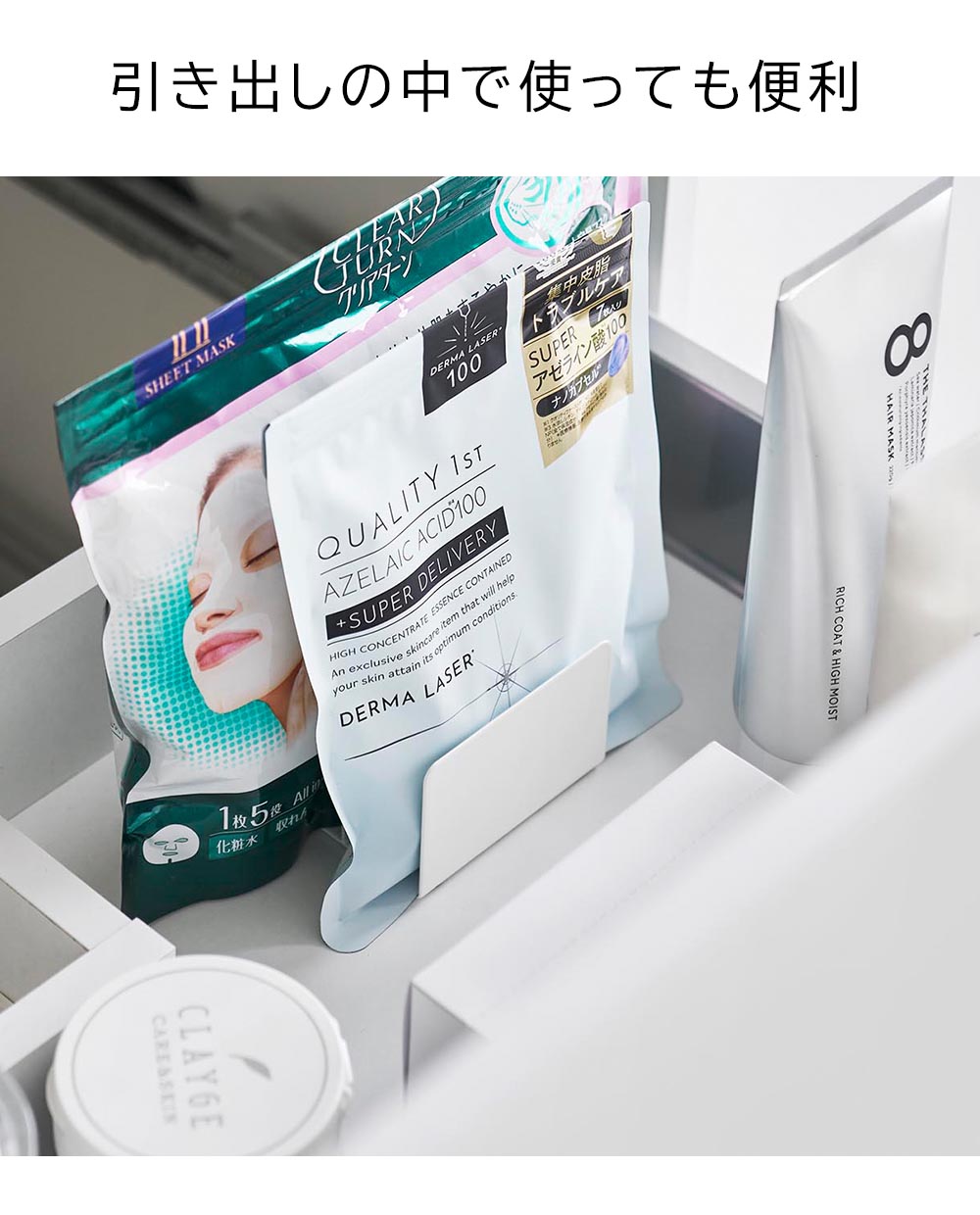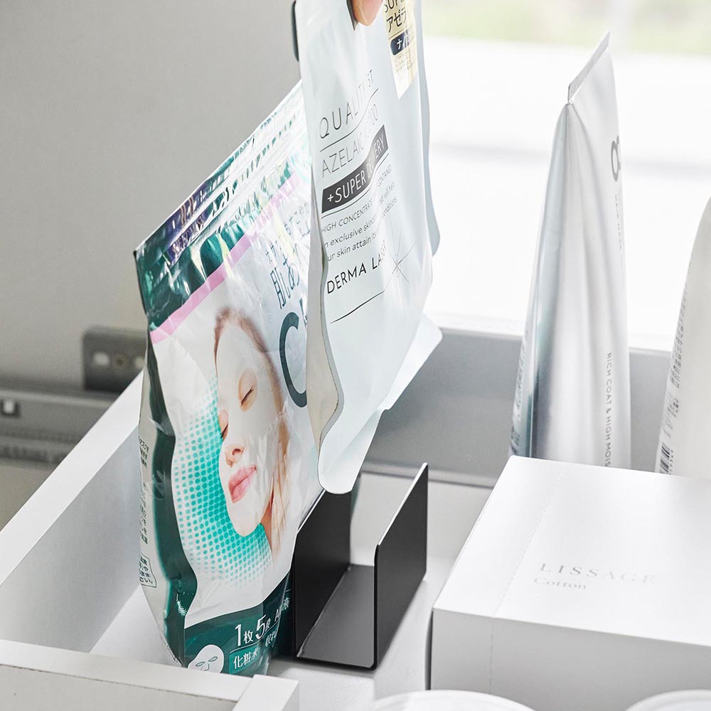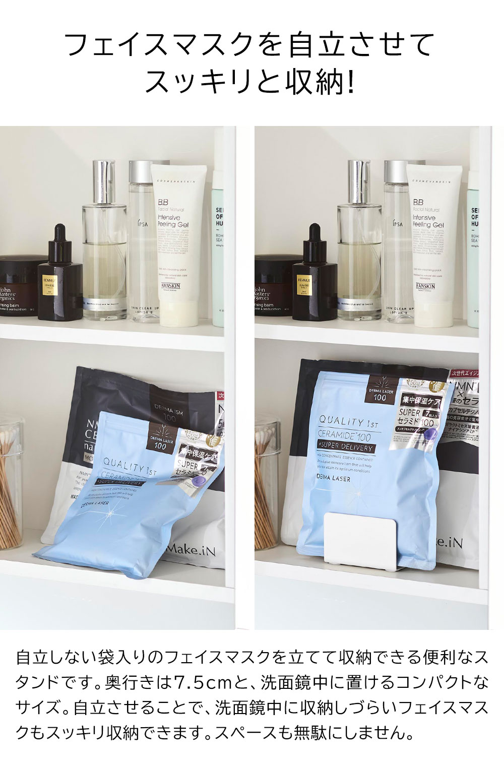 置き場所に困る自立しない袋入りフェイスマスクを、自立させてスッキリと収納できる仕切り付きのスタンドです。前後で異なる奥行きの仕切りが付いているので、内容量に合わせて2種類のフェイスマスクを収納できます。