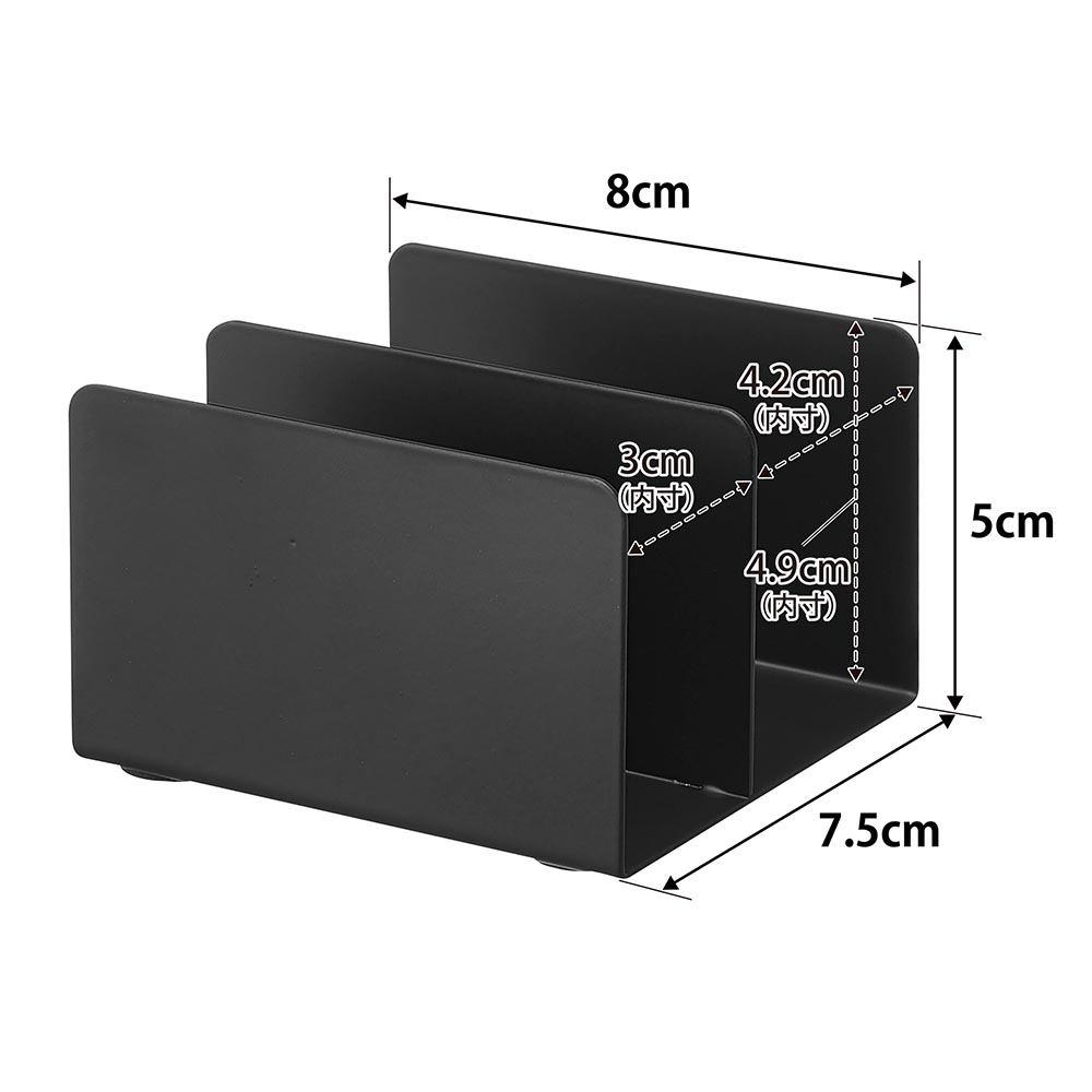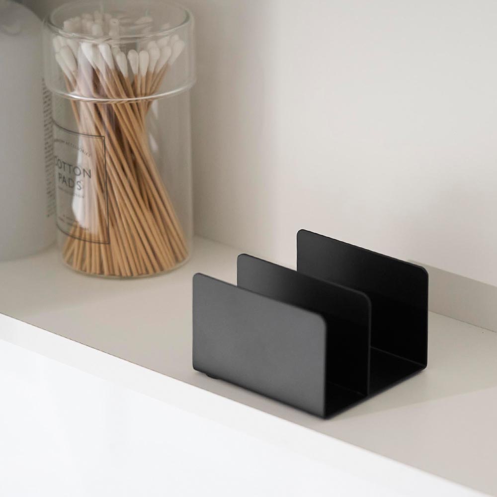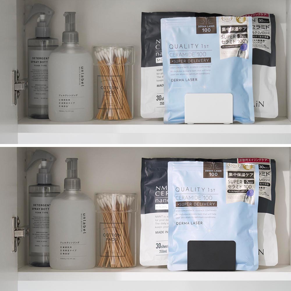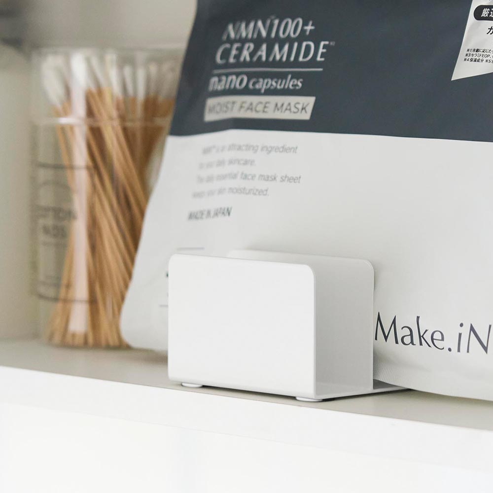 置き場所に困る自立しない袋入りフェイスマスクを、自立させてスッキリと収納できる仕切り付きのスタンドです。前後で異なる奥行きの仕切りが付いているので、内容量に合わせて2種類のフェイスマスクを収納できます。